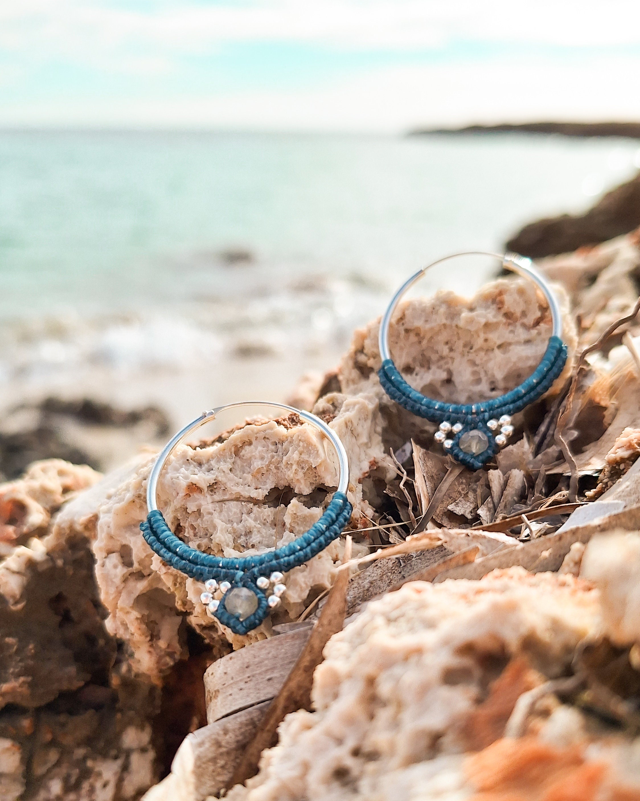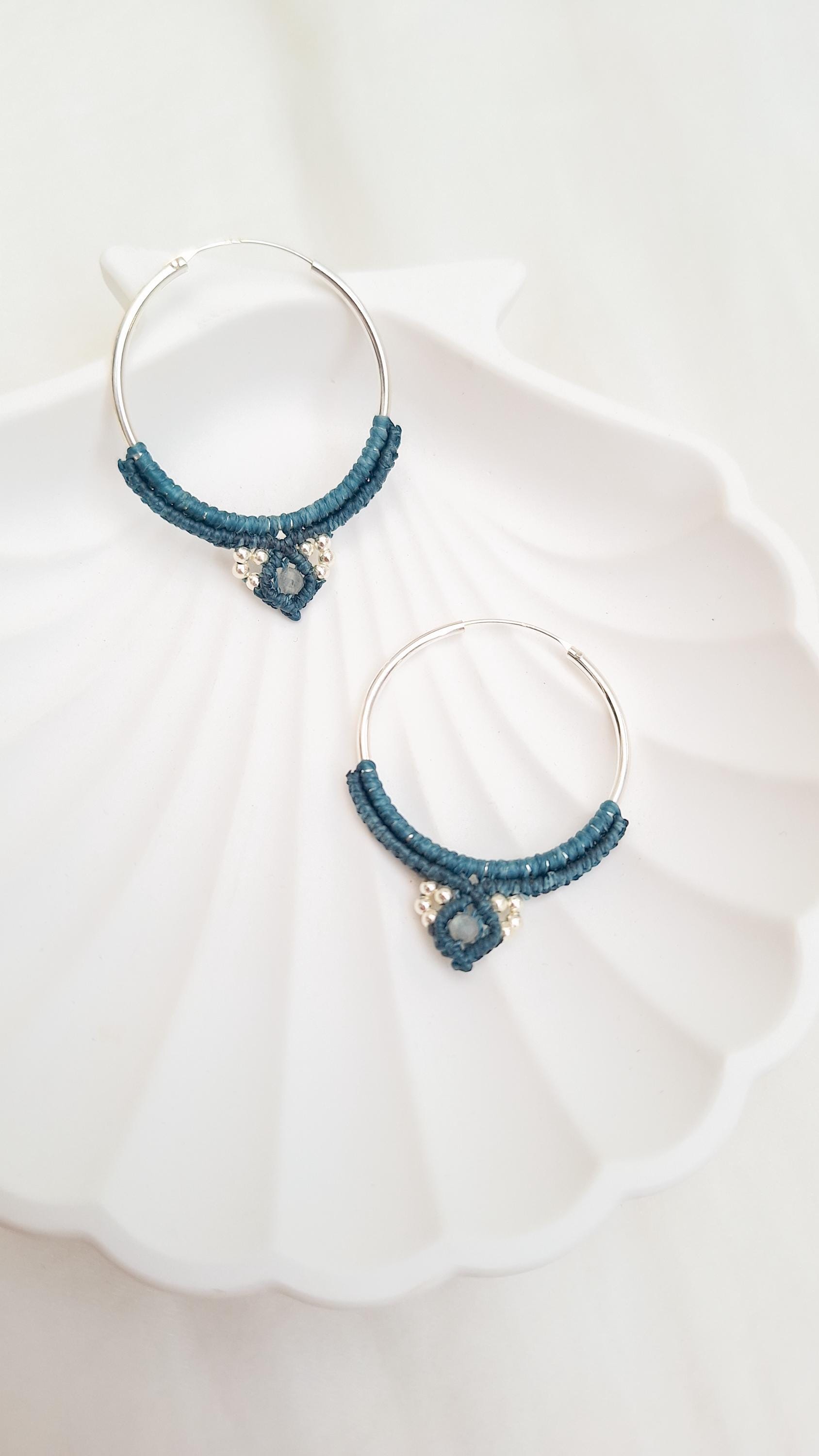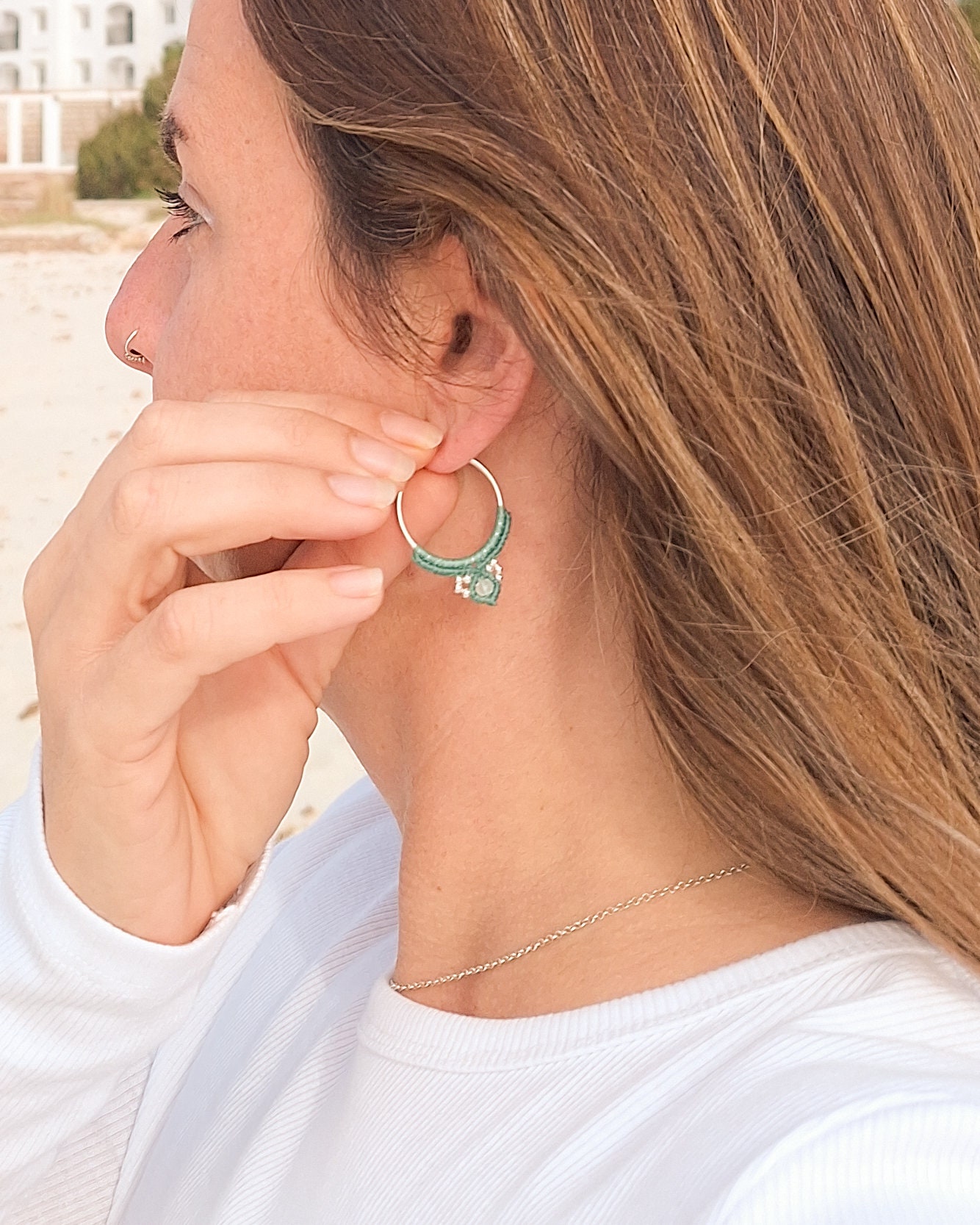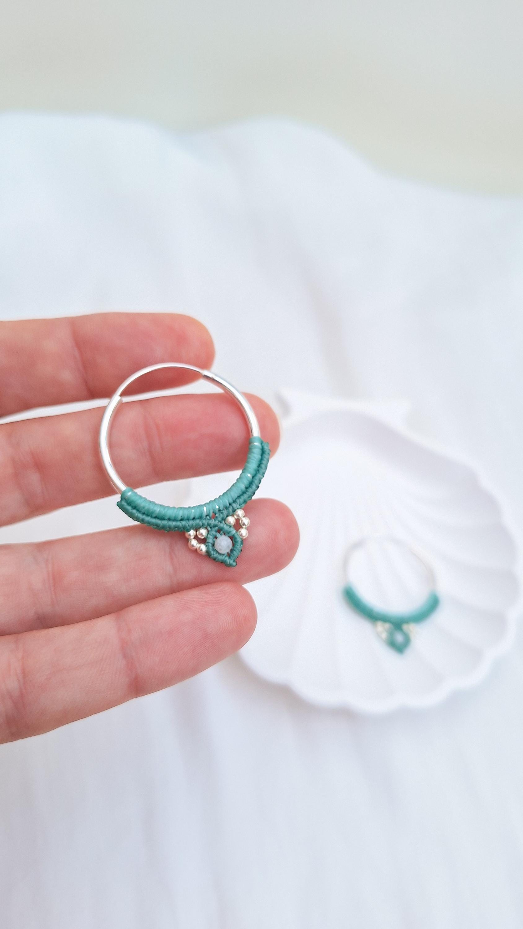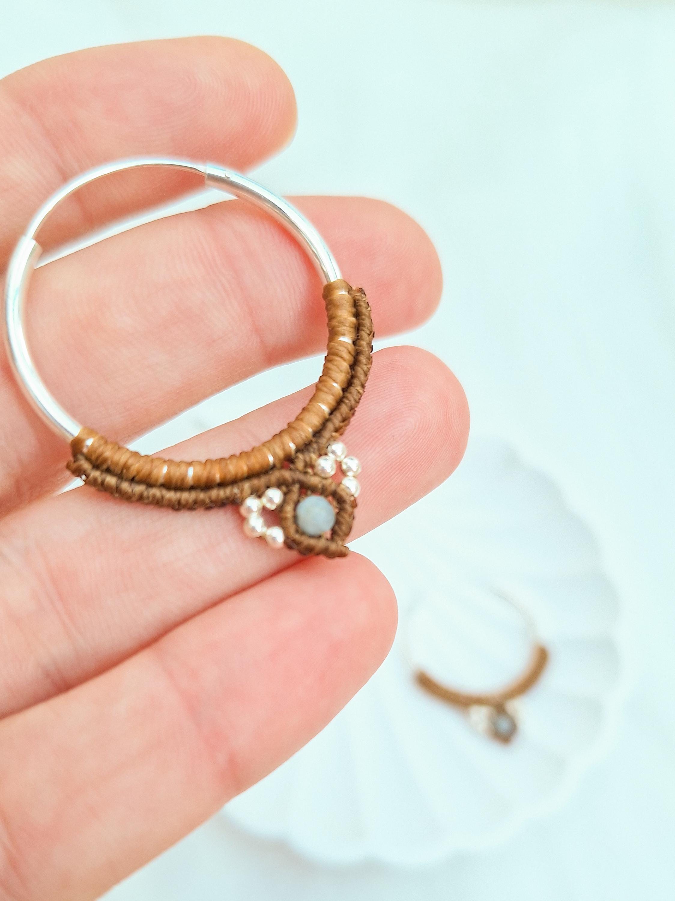 925 silver hoop earrings, handmade using macramé technique, with faceted natural stones and waxed thread. Their minimalist design with fine lines blends subtlety and originality. These comfortable earrings are perfect for enhancing your everyday look. The materials are durable, hypoallergenic, and water-resistant.