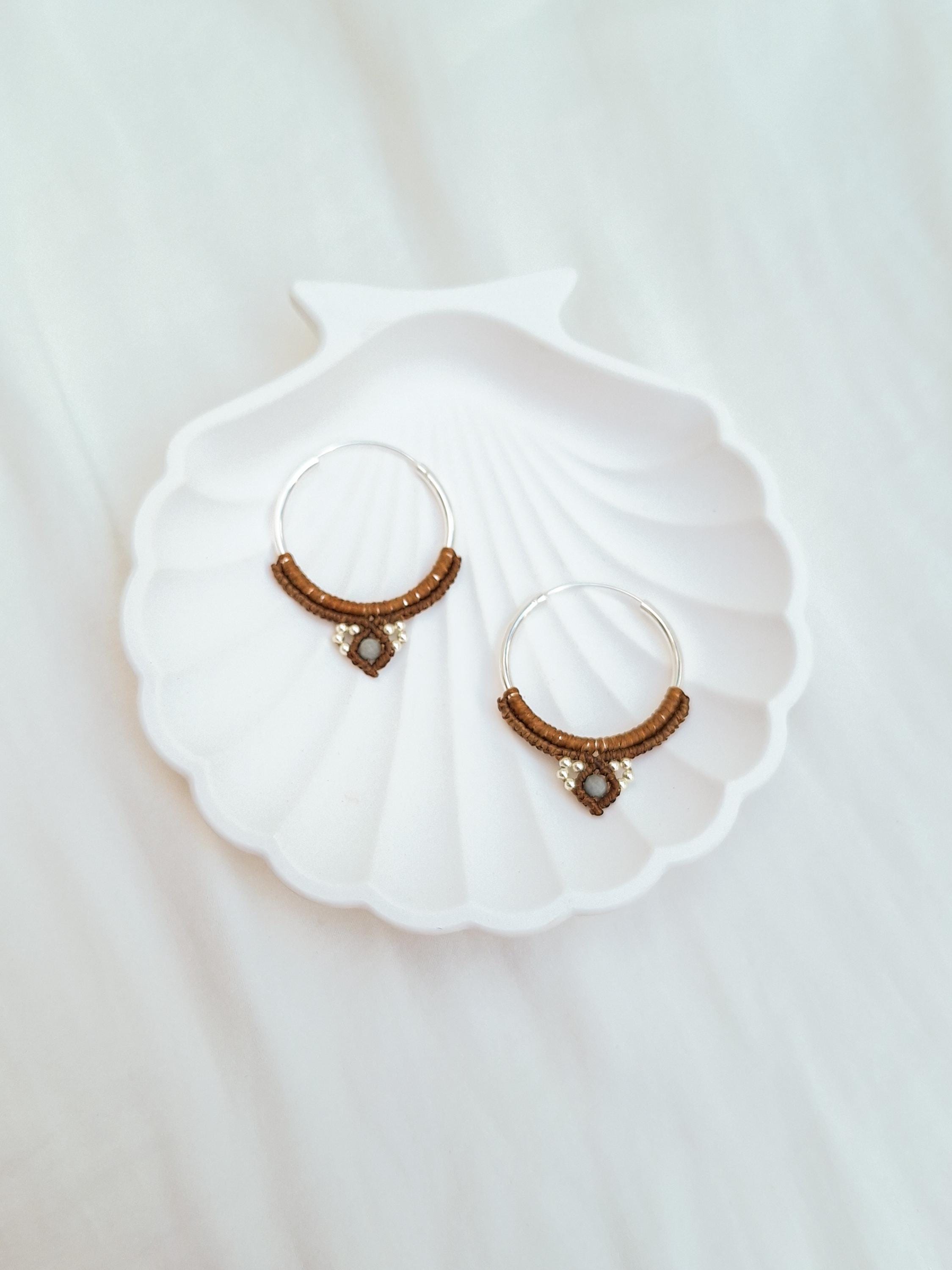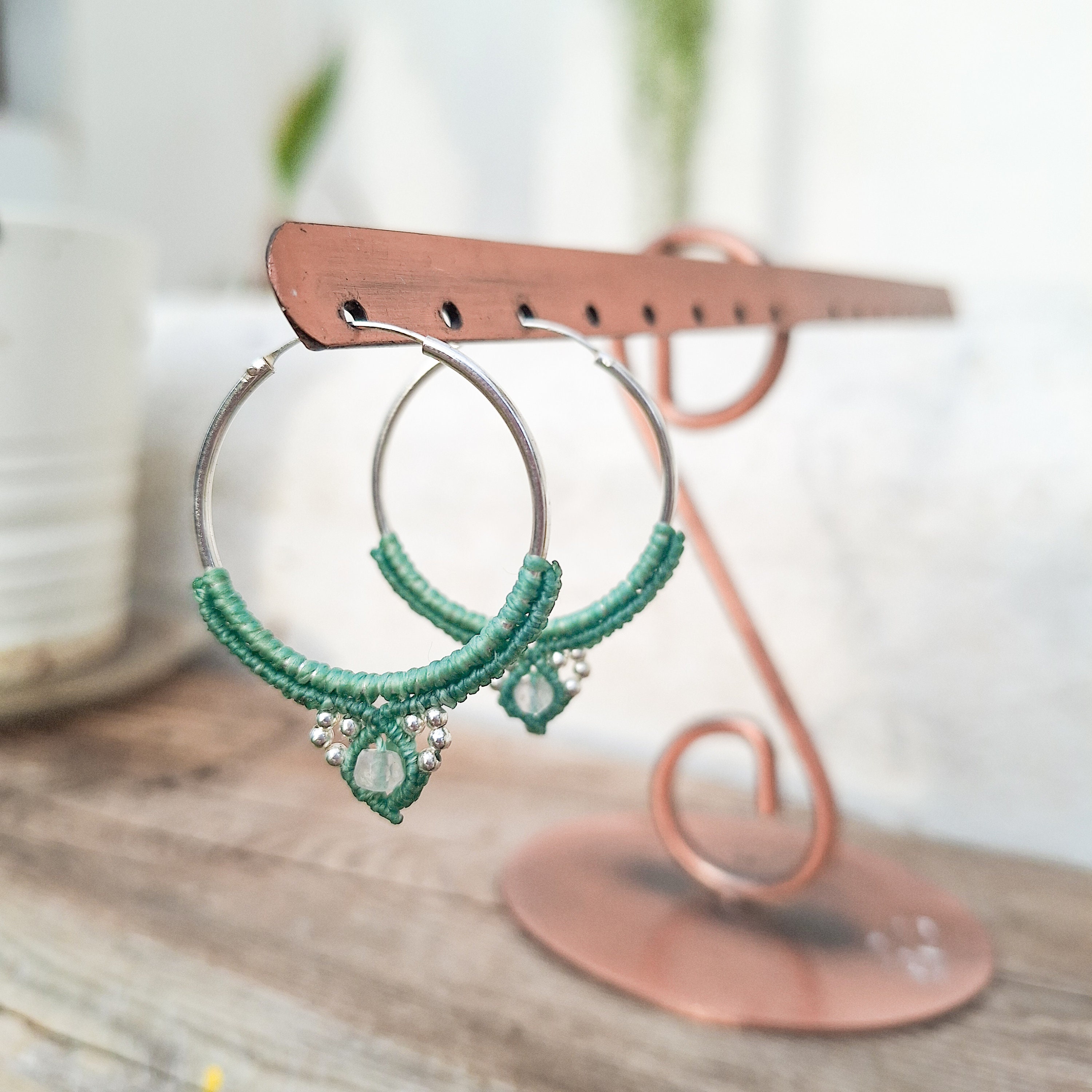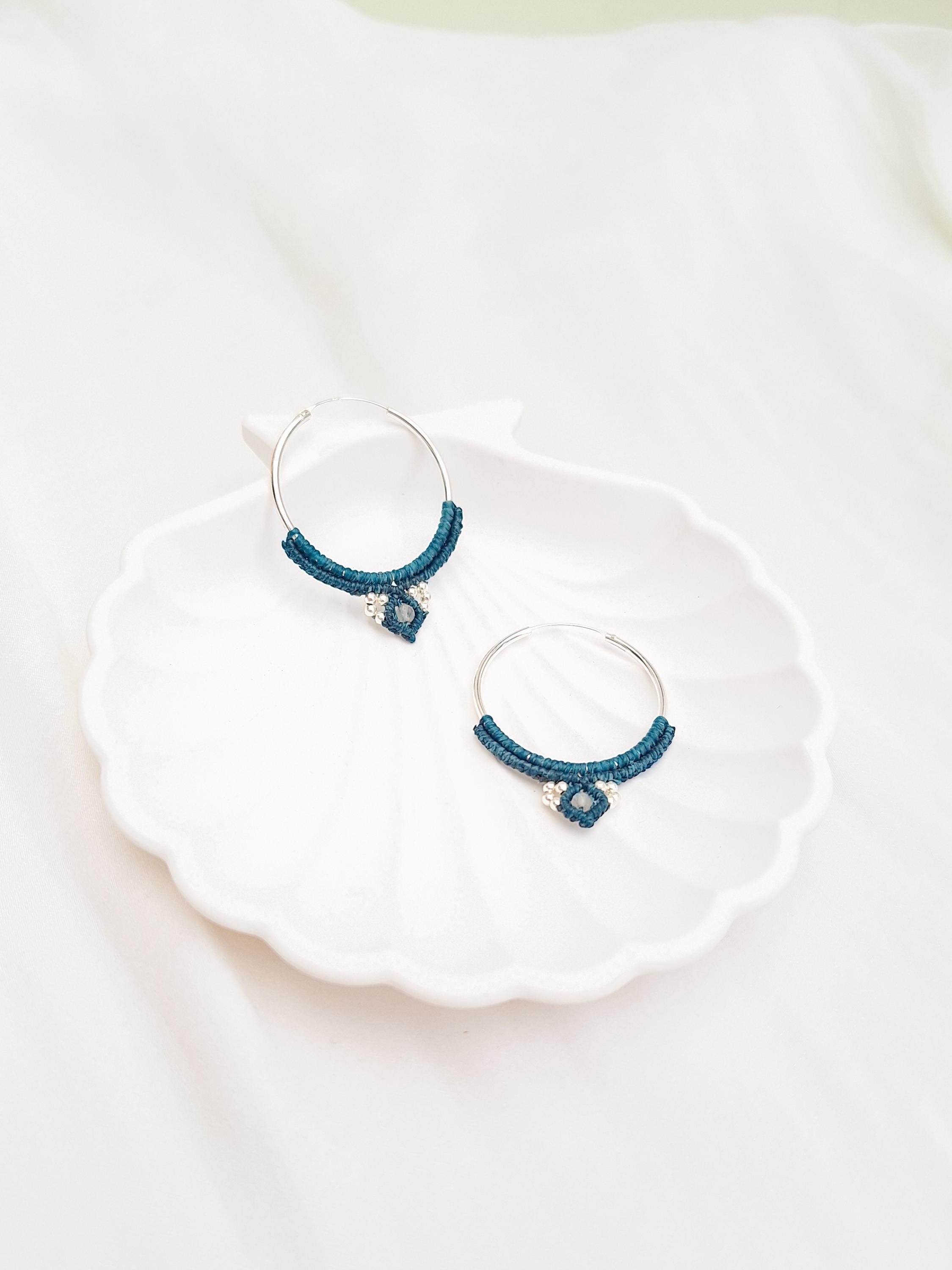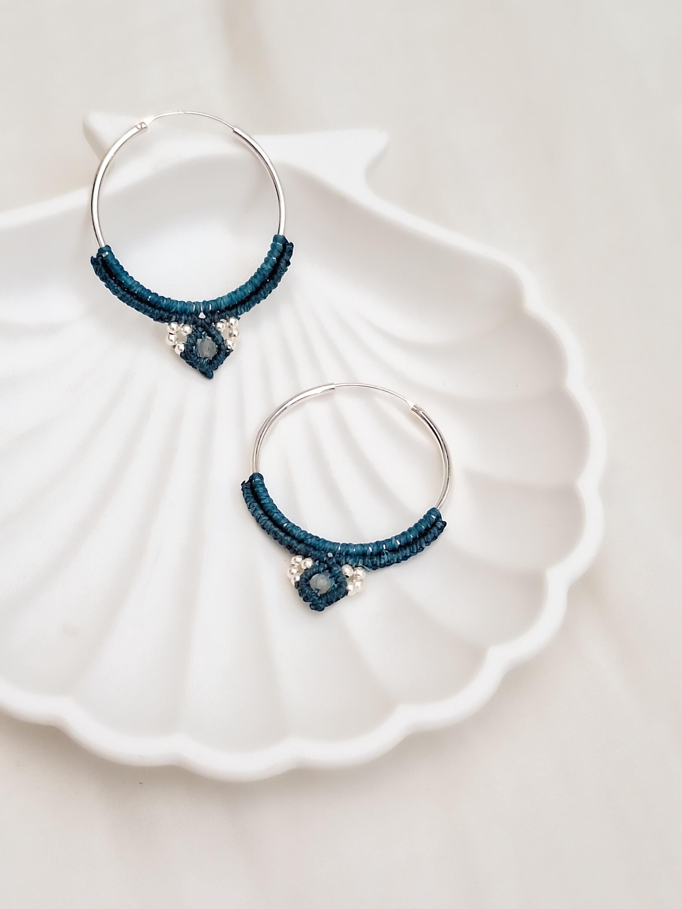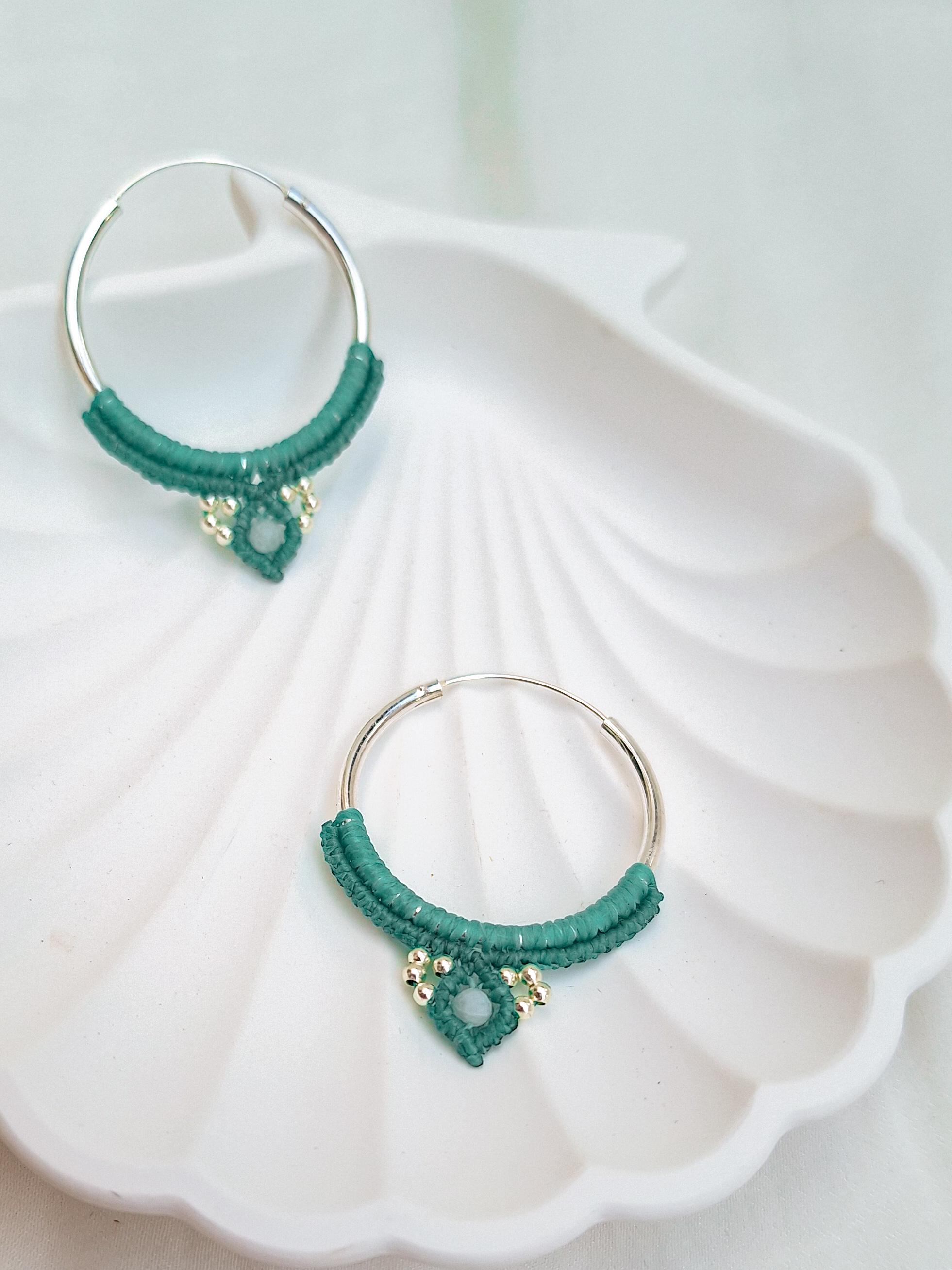 925 silver hoop earrings, handmade using macramé technique, with faceted natural stones and waxed thread. Their minimalist design with fine lines blends subtlety and originality. These comfortable earrings are perfect for enhancing your everyday look. The materials are durable, hypoallergenic, and water-resistant.