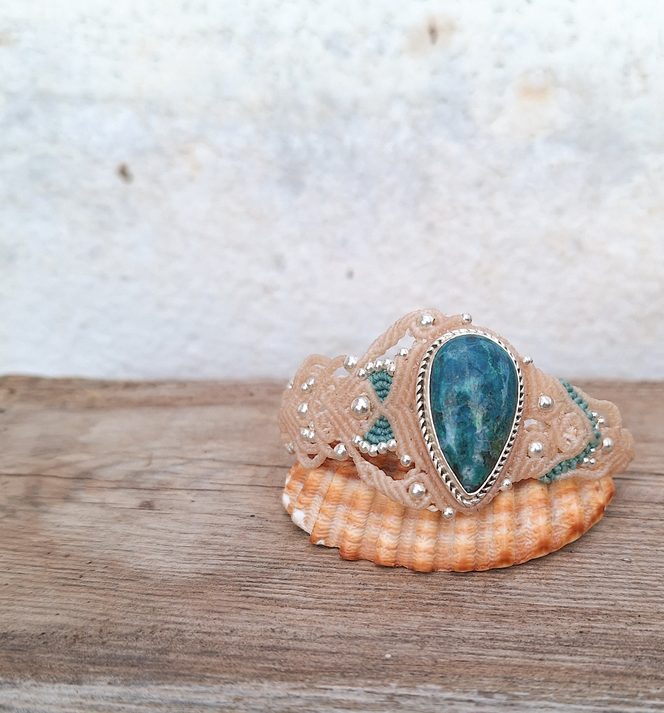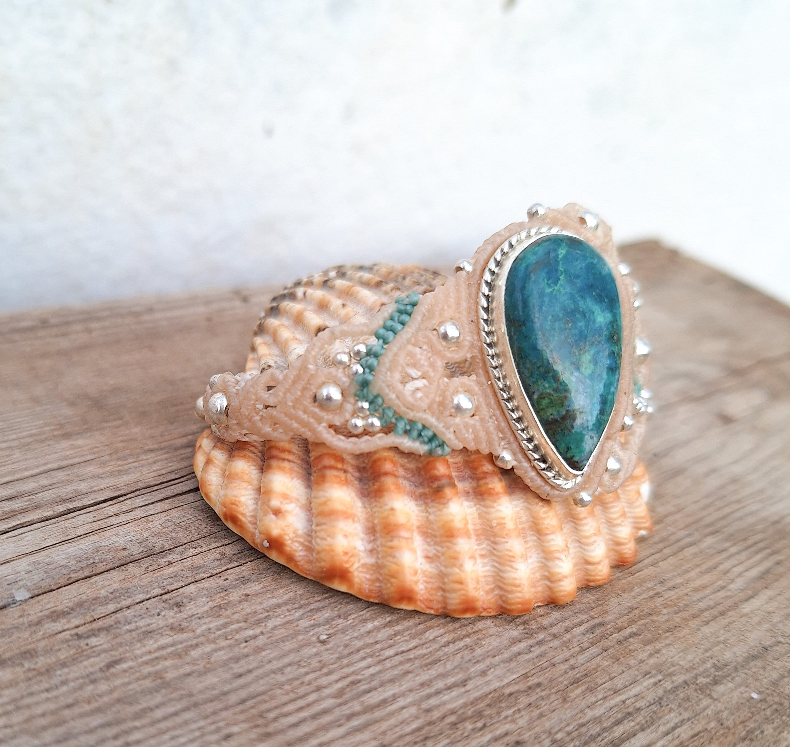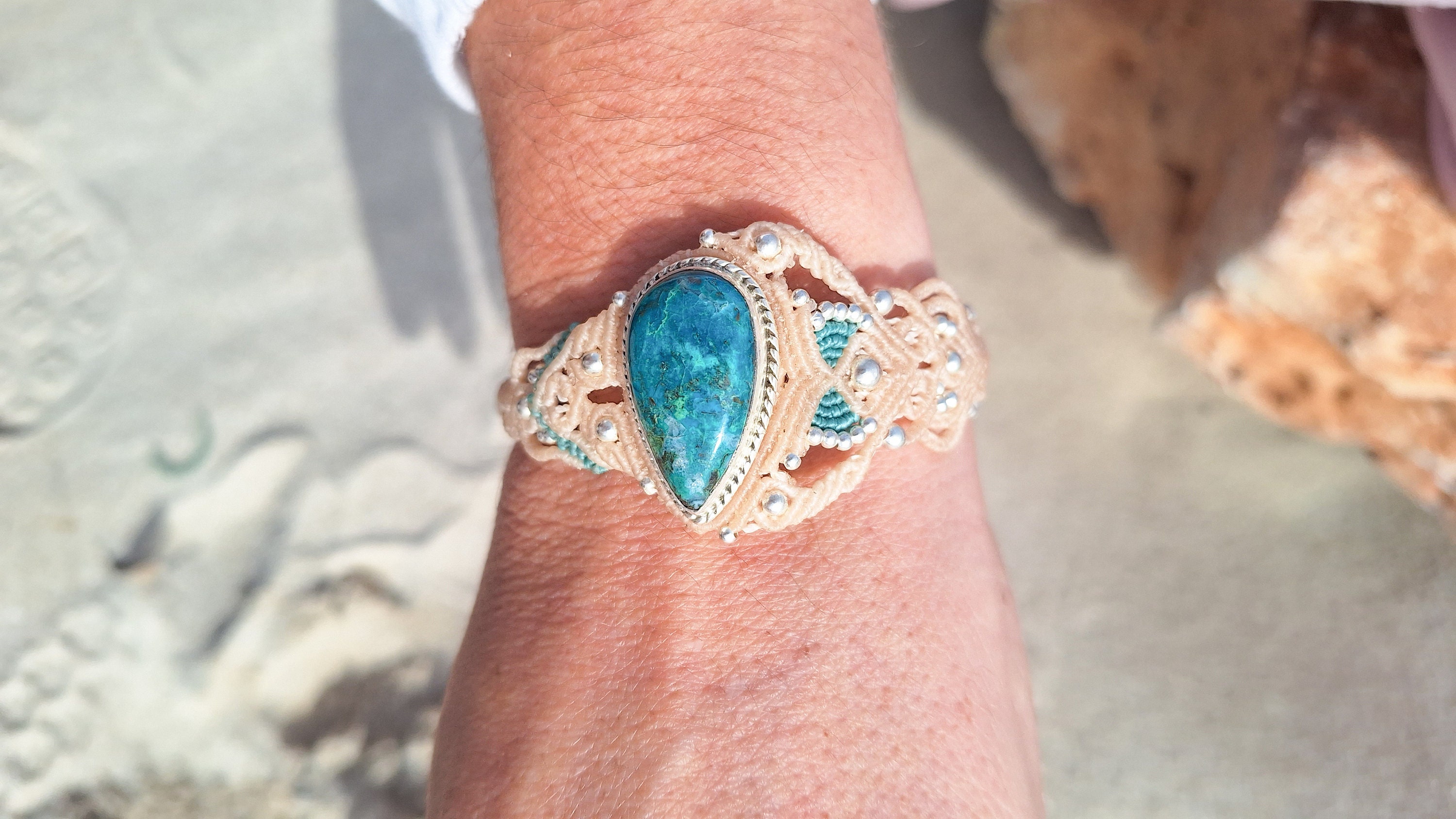 Bracelet designed with Chrysocolla stone and 925 Silver. Bracelet handcrafted using the macrame technique and decorated with silver beads. The stone is a spectacular turquoise color, teardrop-shaped and set in 925 silver. It is an exclusive bracelet, with a unique style and a special design. It can be the perfect outfit for an event or to enhance your style at any time.
