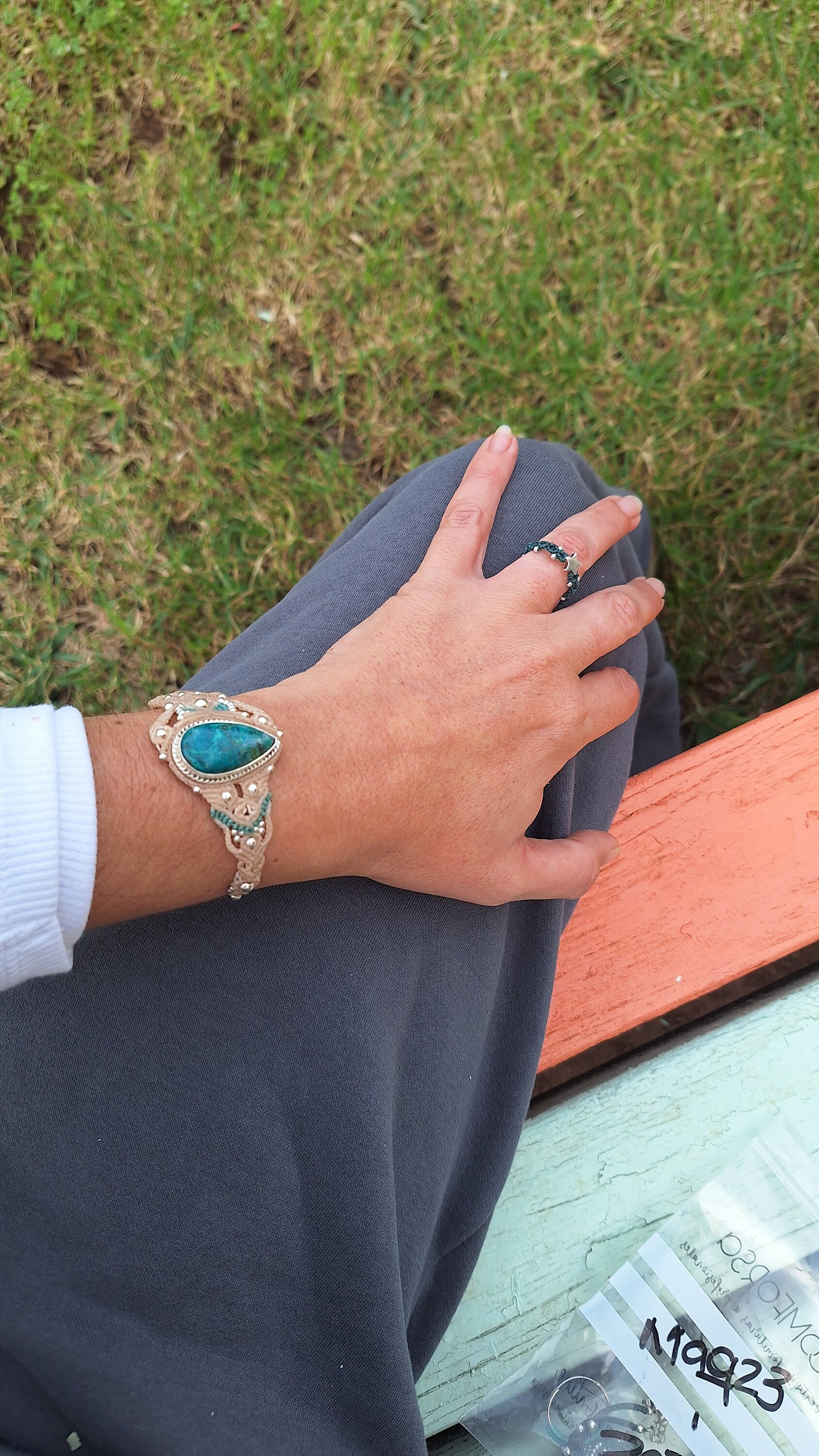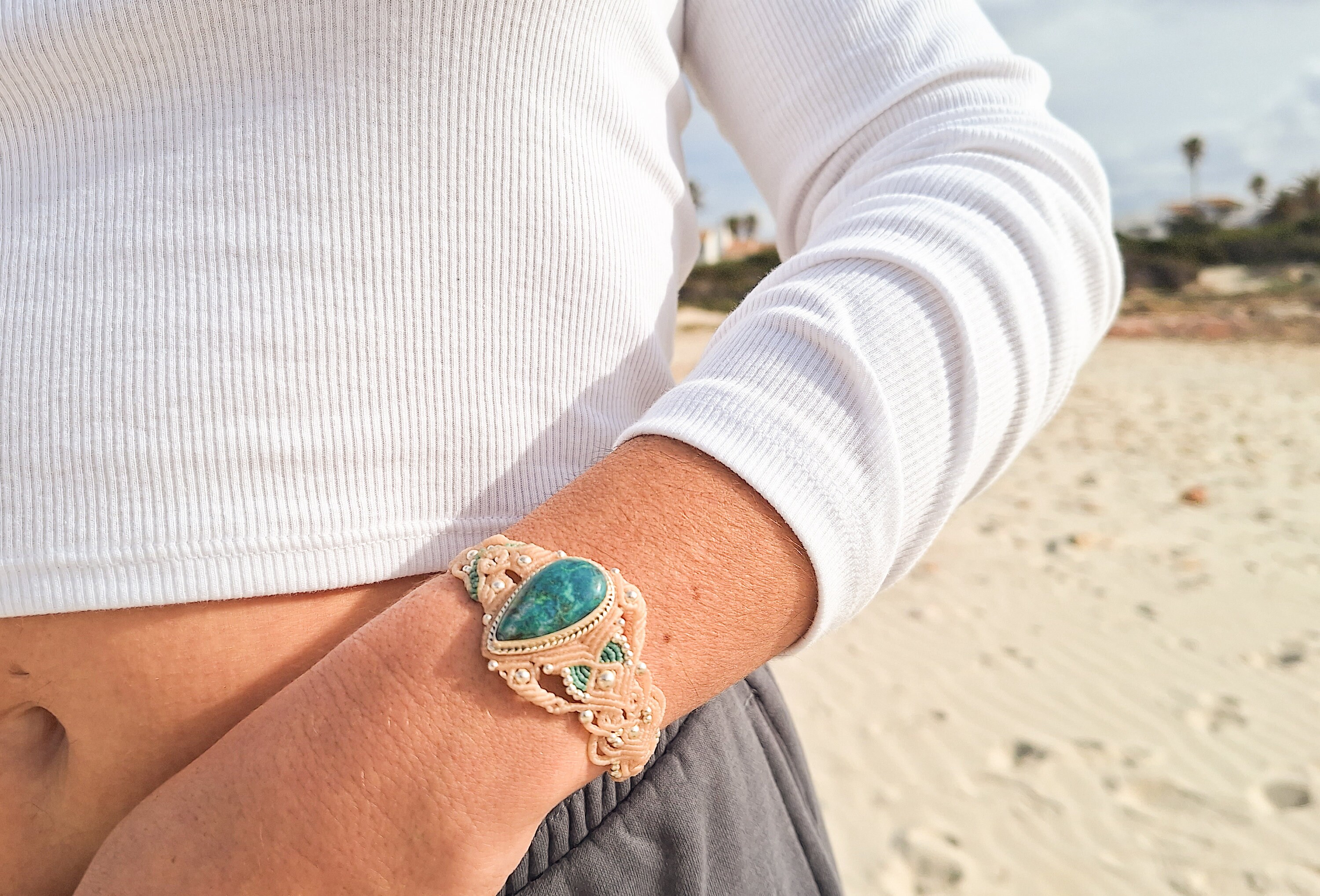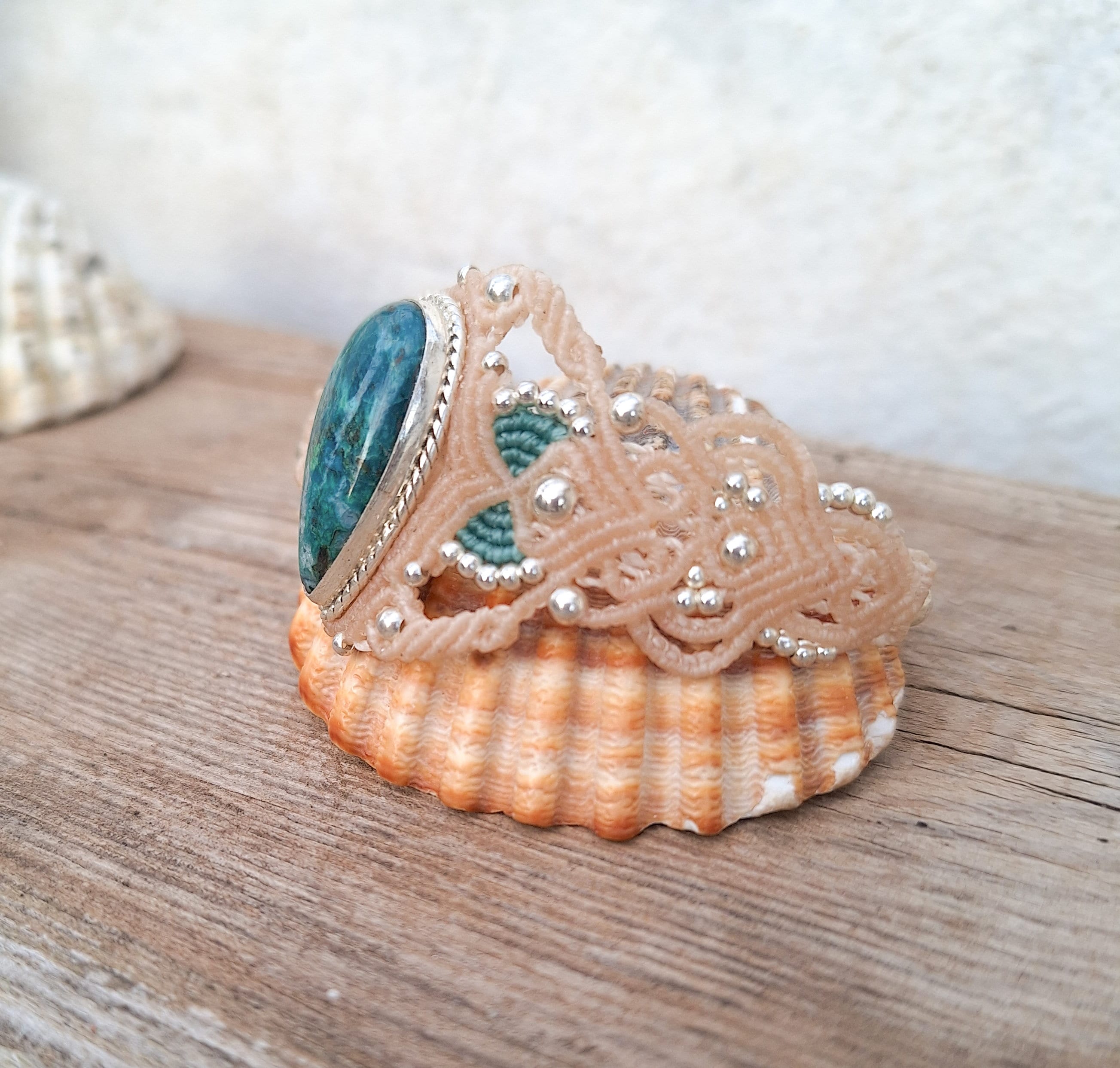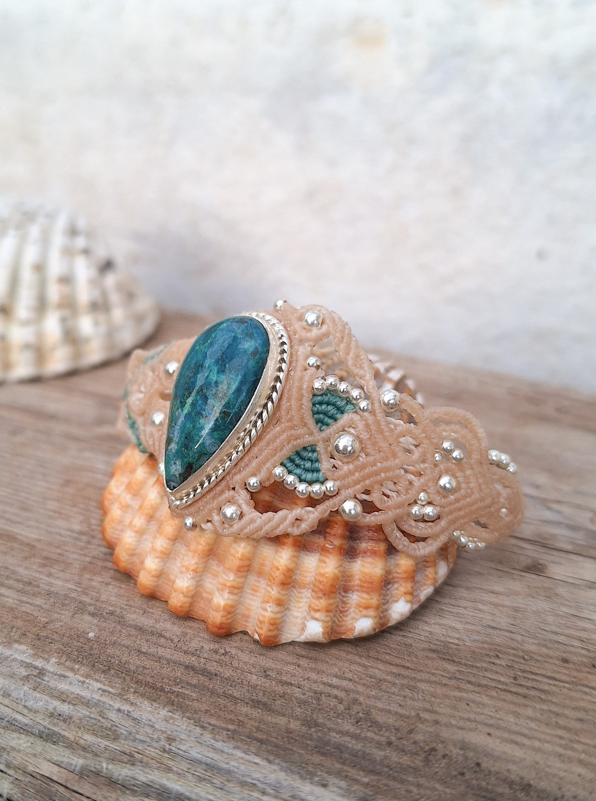 Bracelet designed with Chrysocolla stone and 925 Silver. Bracelet handcrafted using the macrame technique and decorated with silver beads. The stone is a spectacular turquoise color, teardrop-shaped and set in 925 silver. It is an exclusive bracelet, with a unique style and a special design. It can be the perfect outfit for an event or to enhance your style at any time.