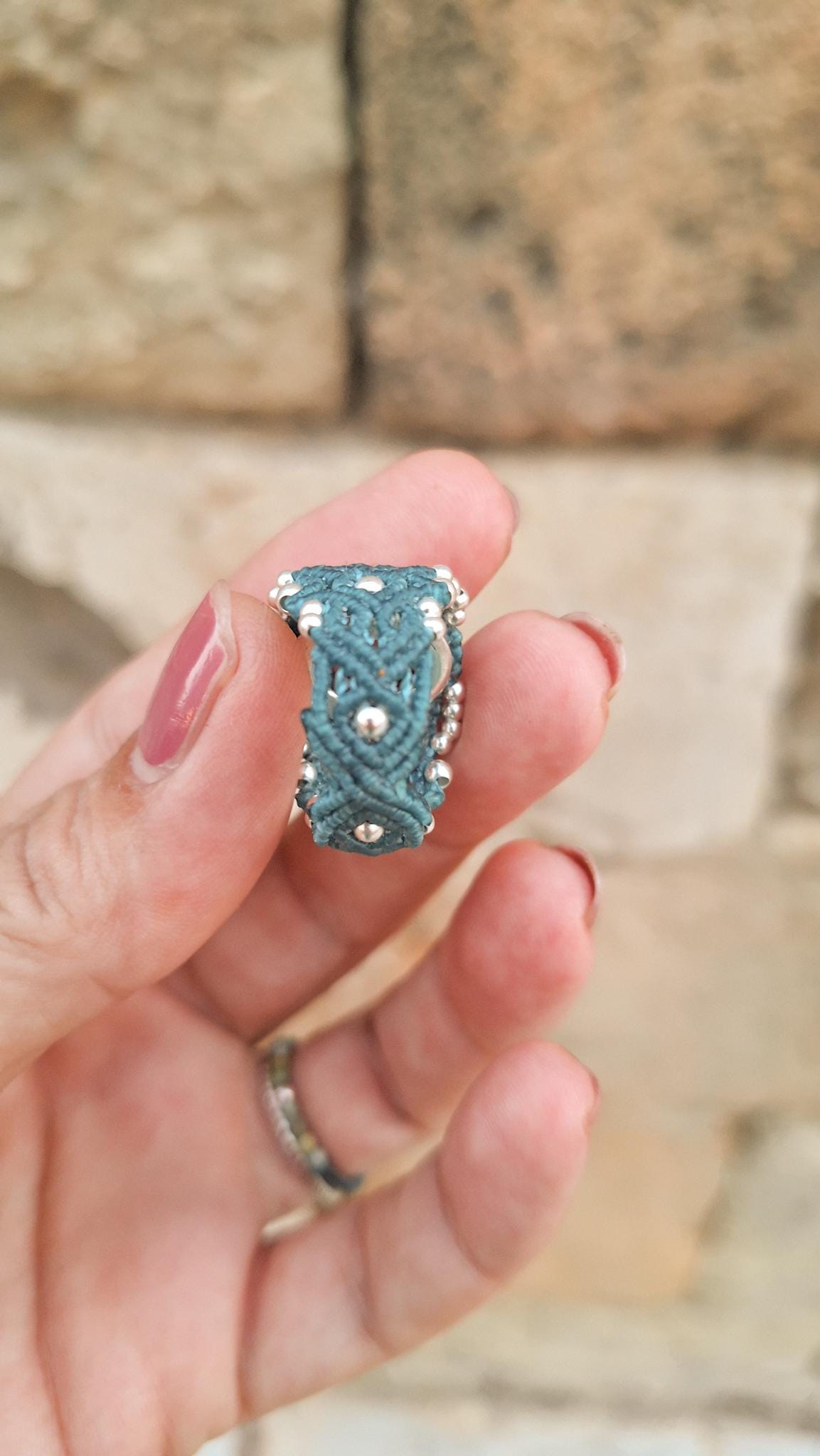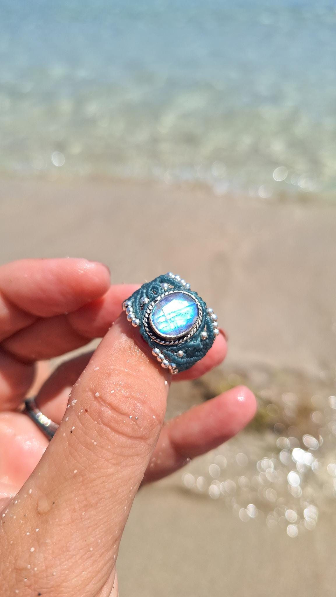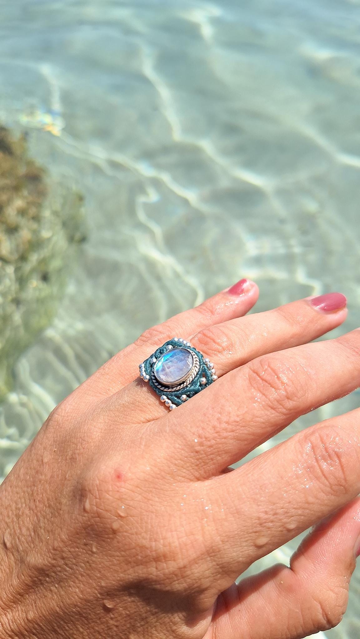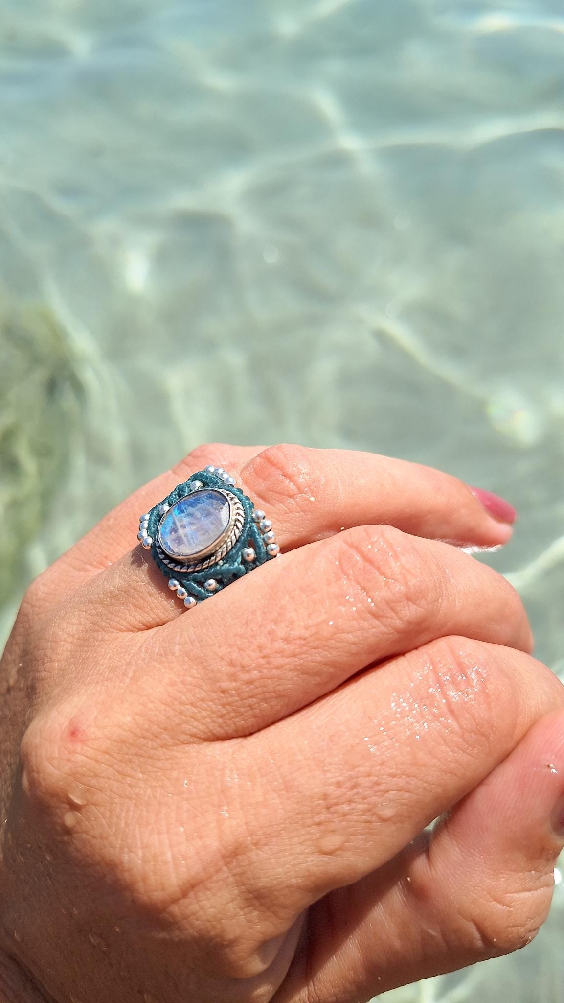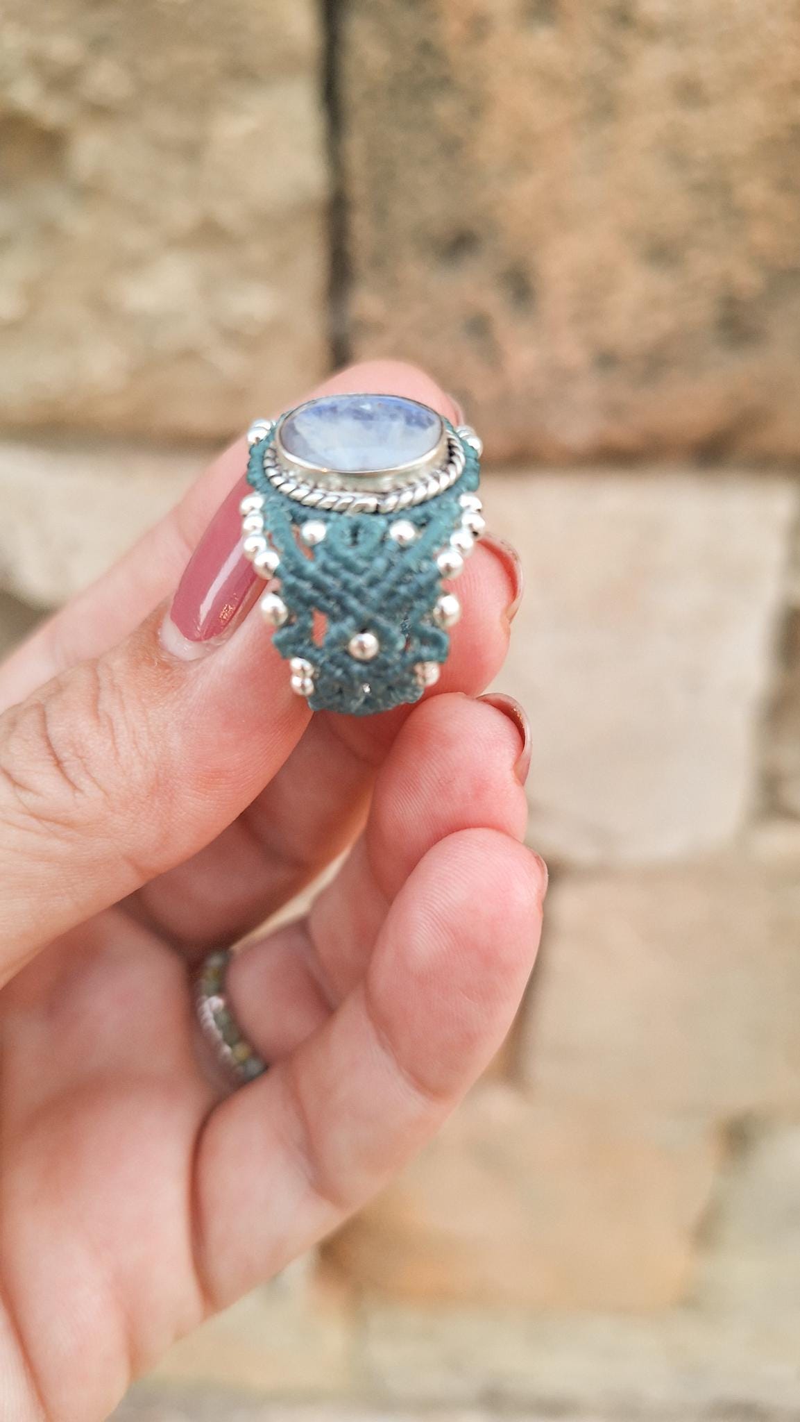 Handmade ring with a delicate macramé design, created with a spectacular faceted Moonstone set in sterling silver, turquoise waxed thread, and silver beads.