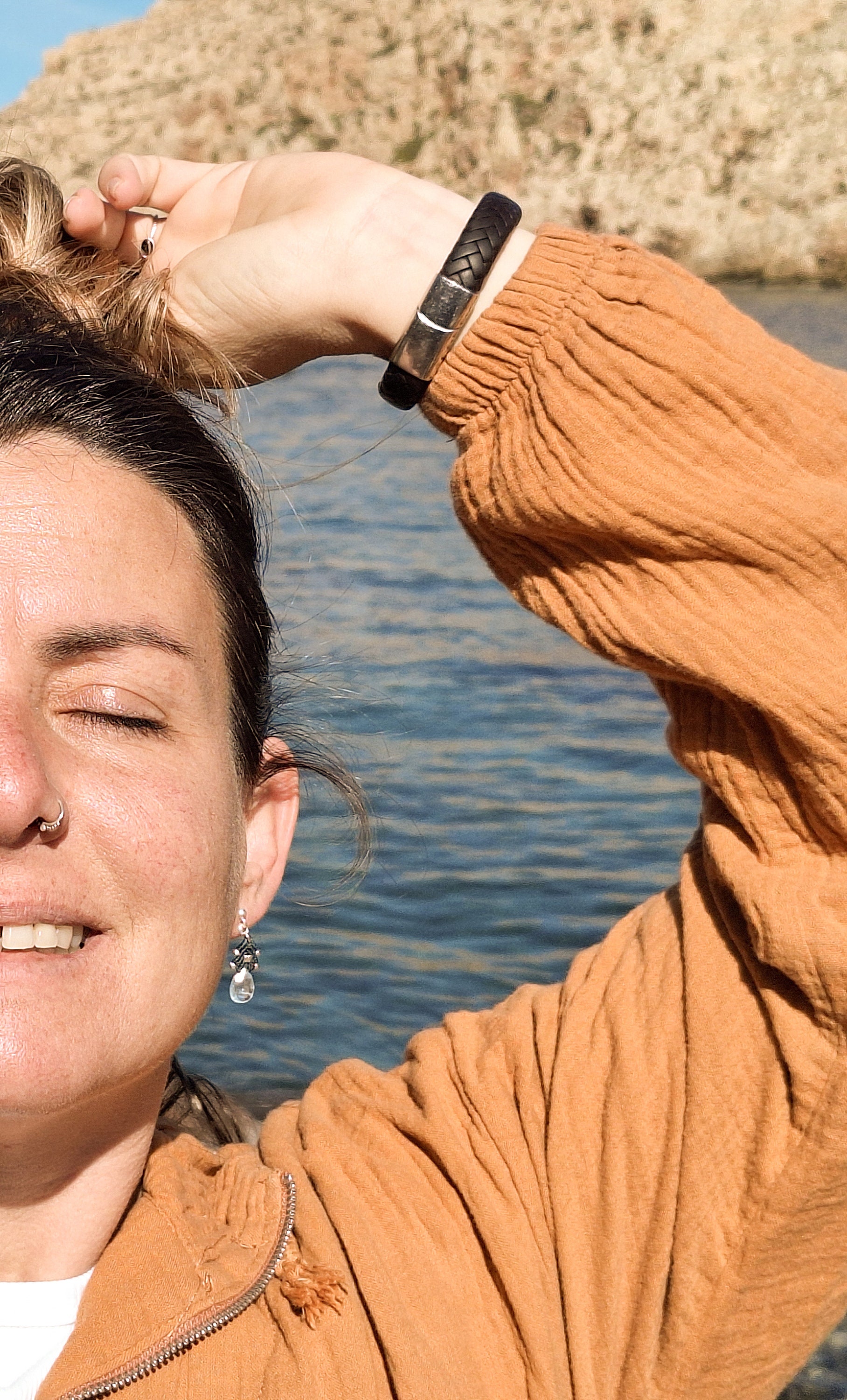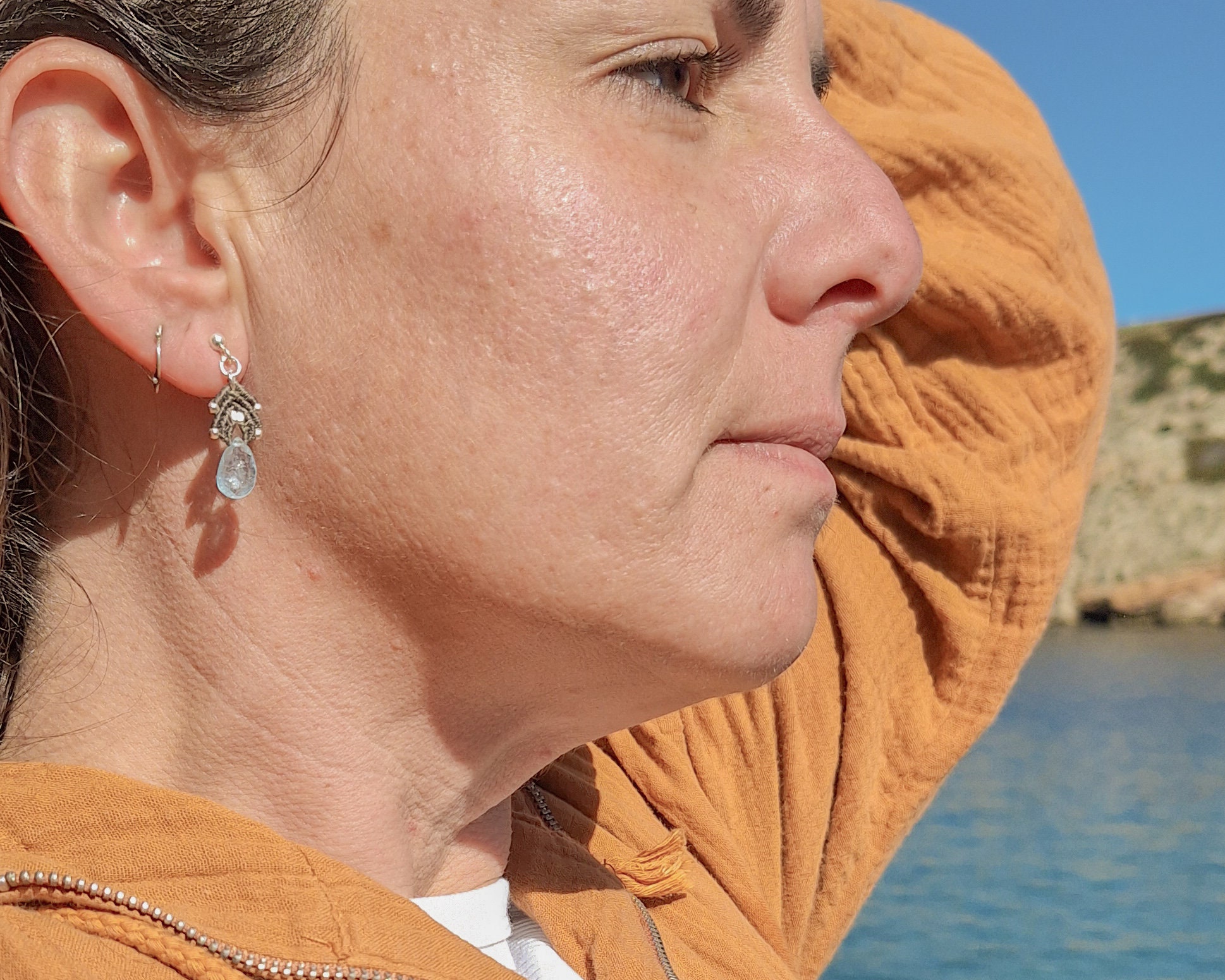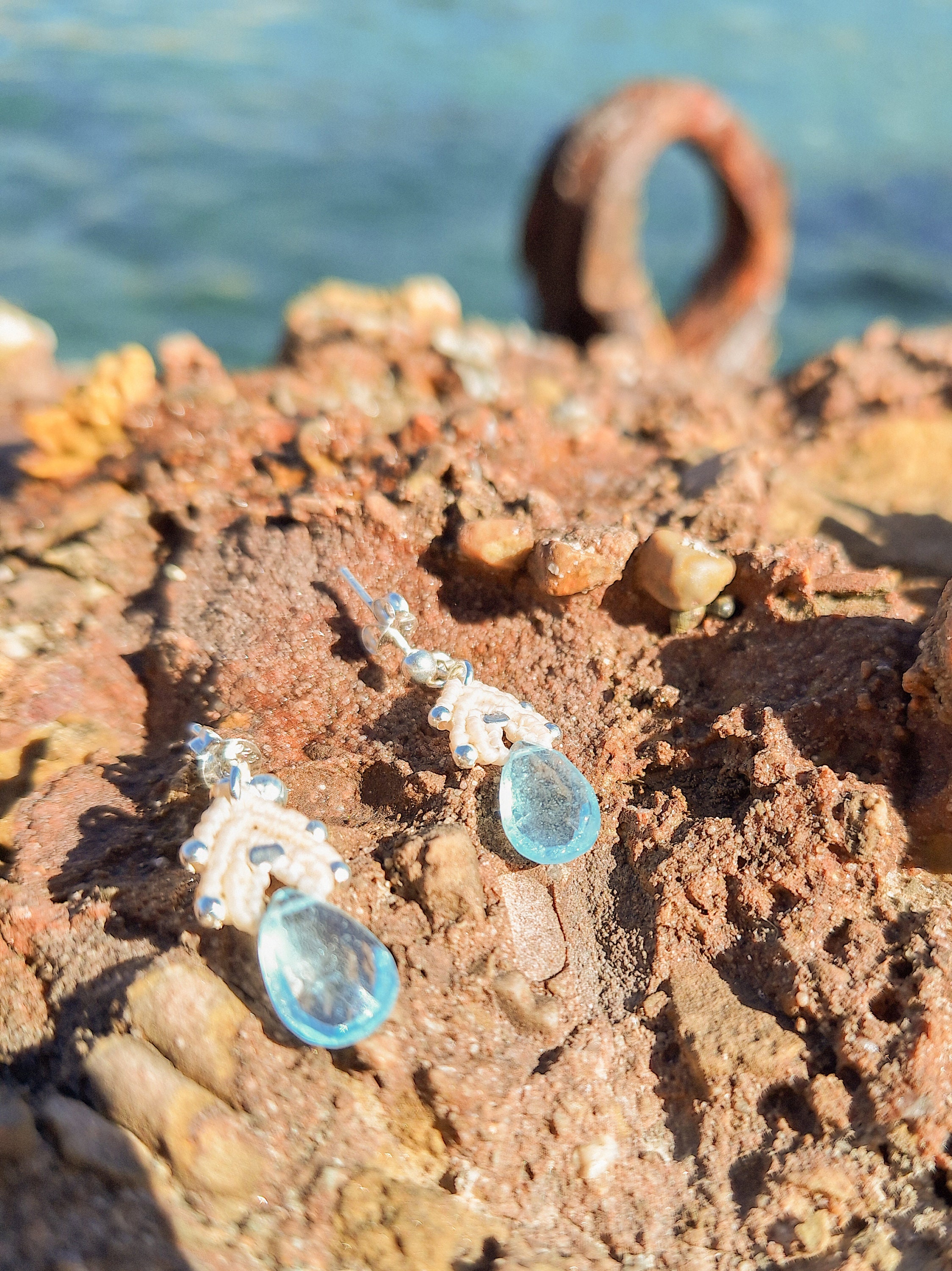 The teardrop-shaped Apatite stone is faceted, enhancing its shine and colour. Its translucent blue tone provides a vibrant and refined touch, creating a unique and attractive piece. The earrings are meticulously woven with cream, dark turquoise or grey waxed thread, and embellished with 925 silver details that add shine, style and quality. The earring clasp is a butterfly type.