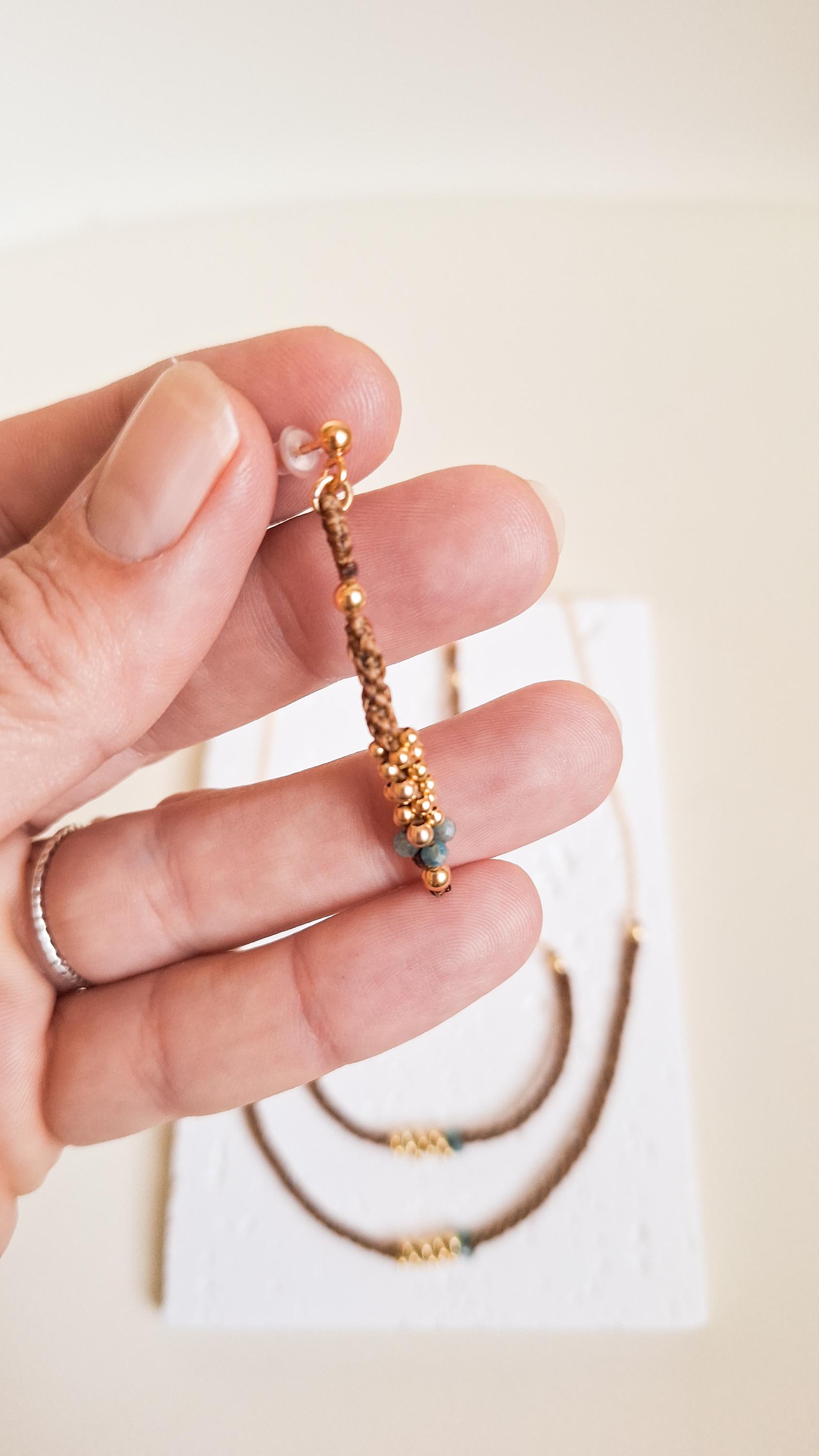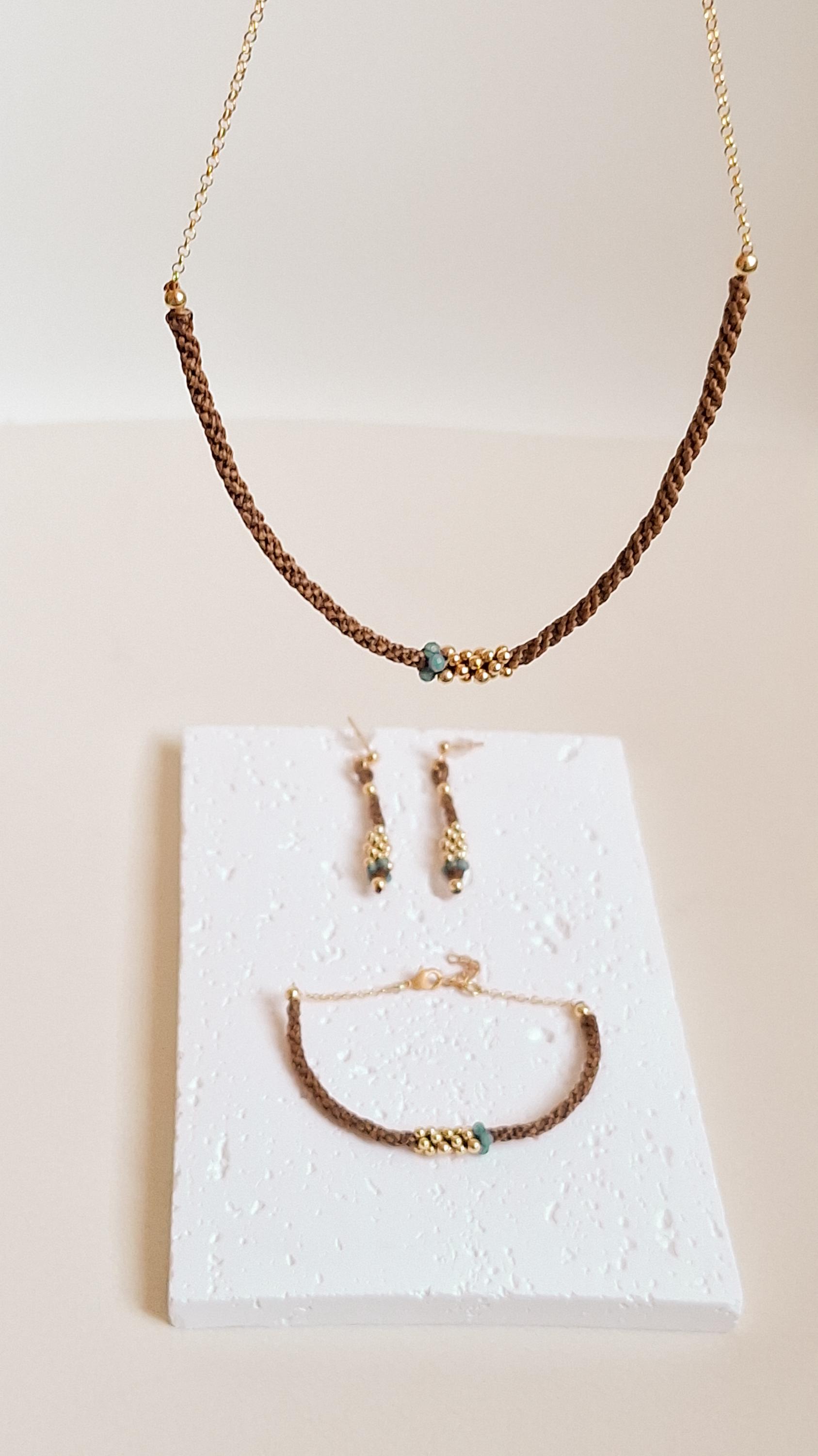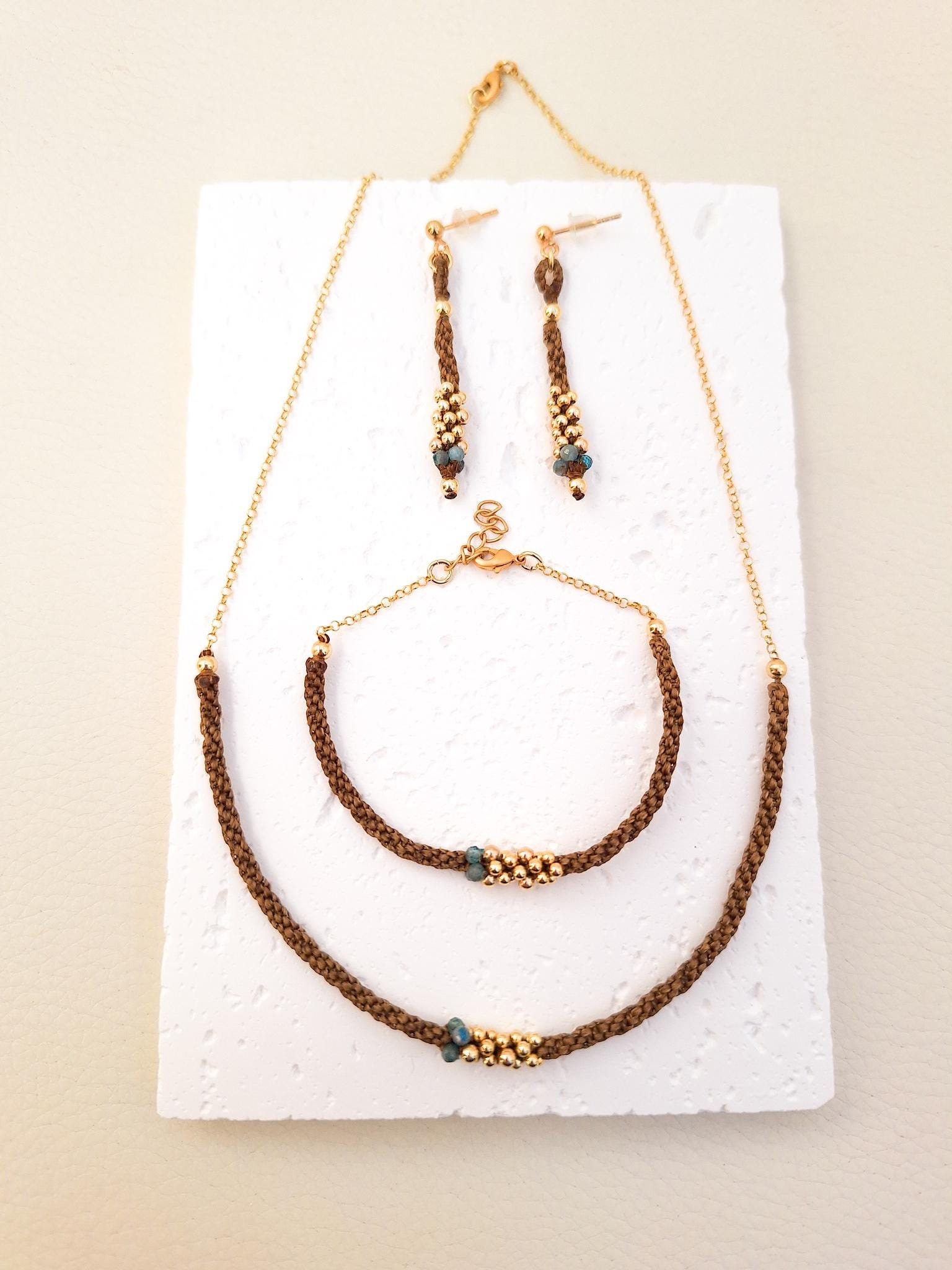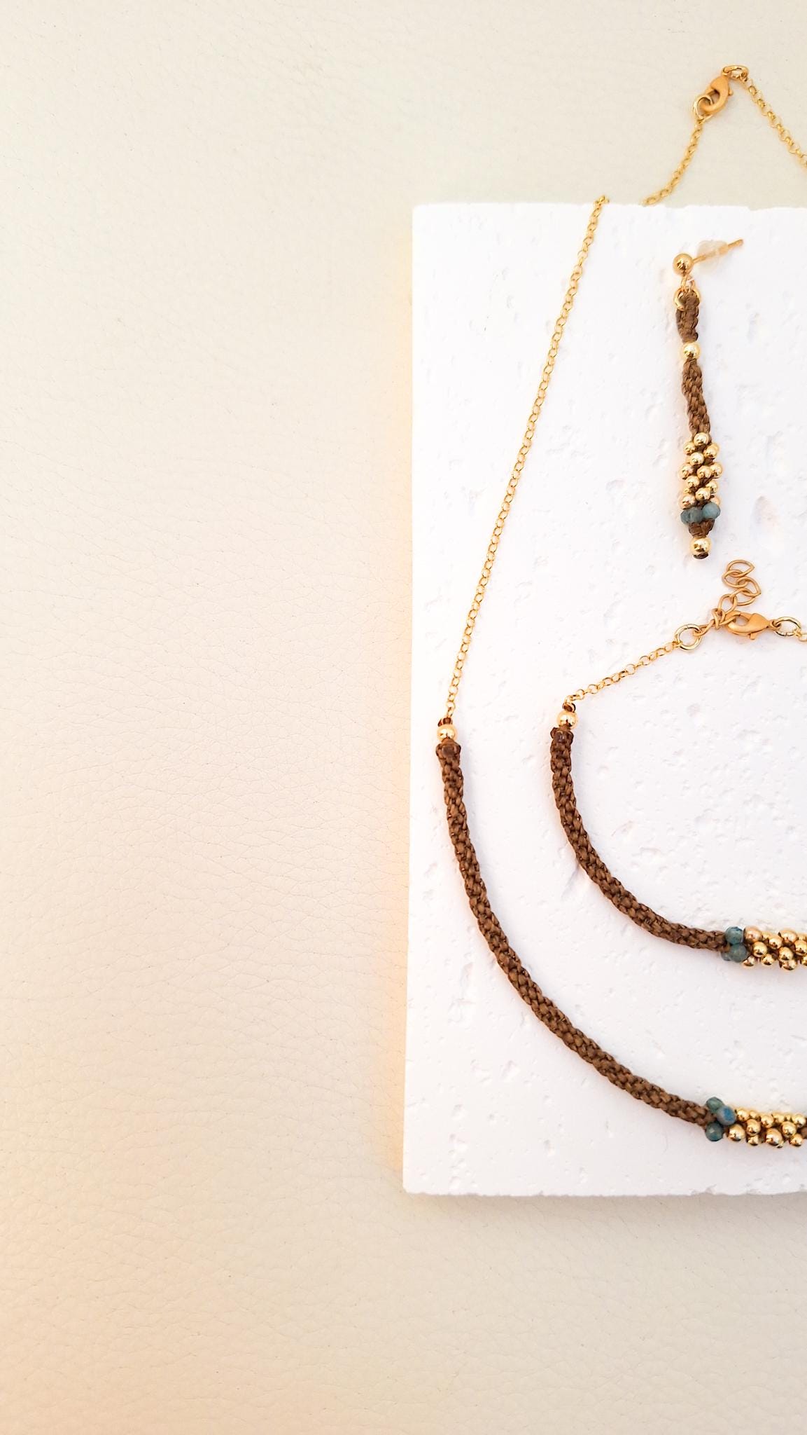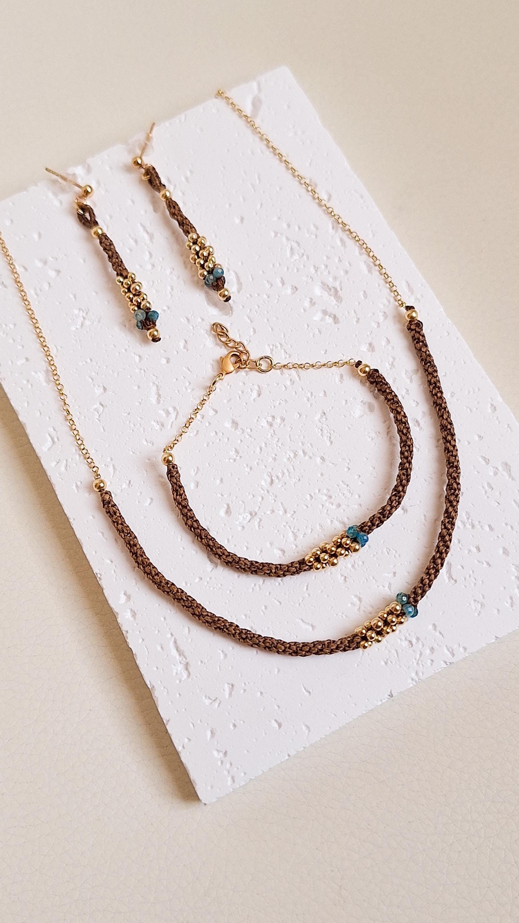 Set of necklace, earrings and bracelet in macramé from the Marea Collection. These jewels are handmade using the macramé technique that gives shape and color, creating a unique design. The design is made with golden brown waxed thread, gold-plated sterling silver beads and Apatite stones. The chains and the clasps of the earrings are made of gold-plated sterling silver. KALA Jewels are created consciously and pampering every detail.