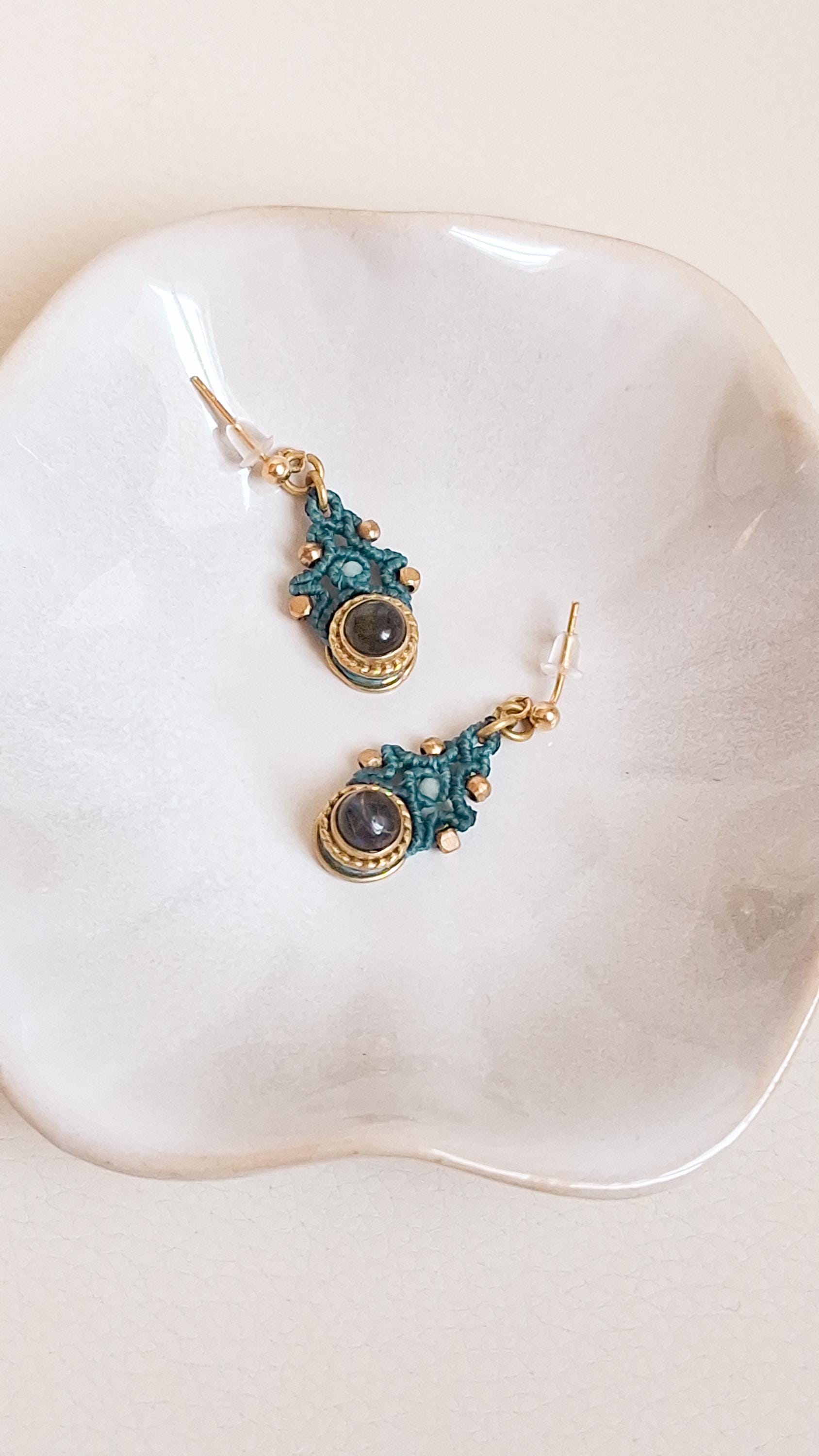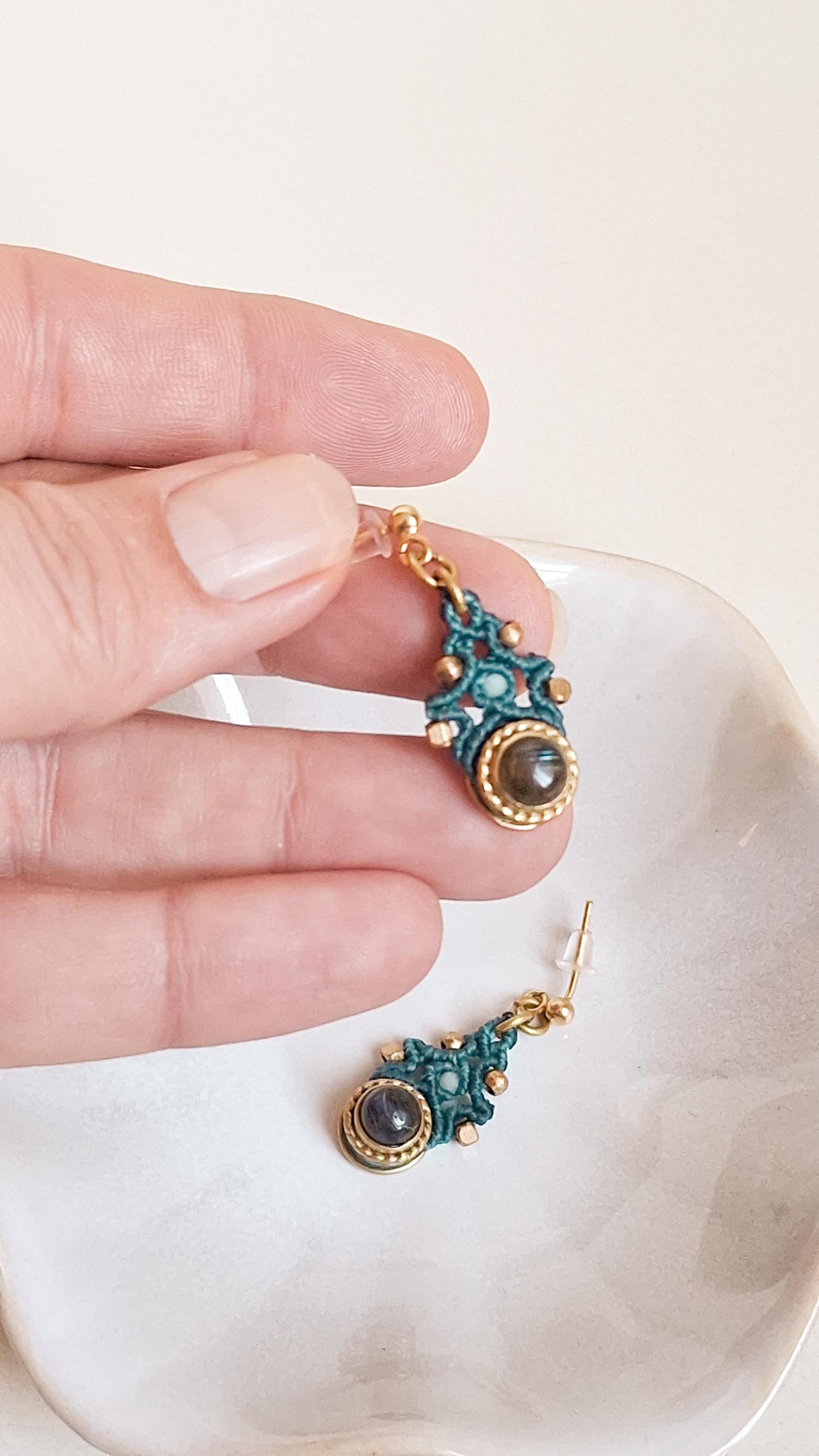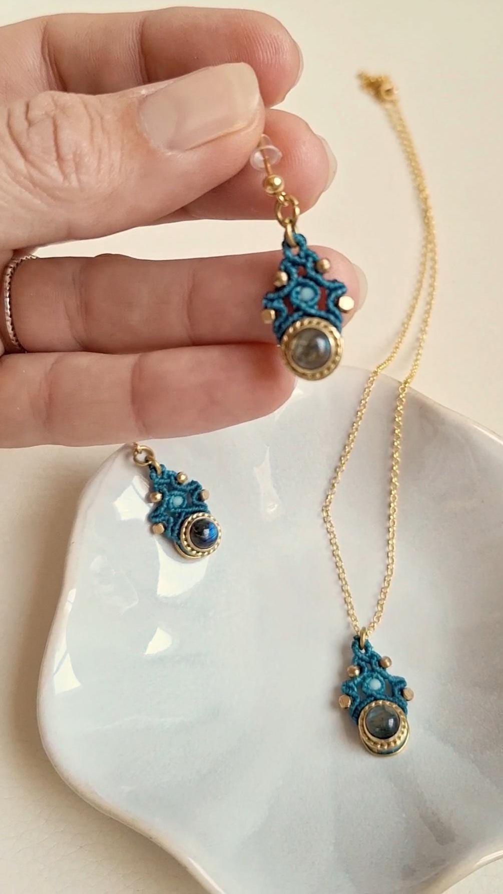 Long macramé earrings from the Eós Collection. They are designed with a round Labradorite stone set in brass, petroleum blue waxed thread, Apatite stone beads and brass. The earrings have a gold-plated silver clasp. The earrings are consciously handmade using the macramé technique that gives shape and colour to this jewel, creating a unique, versatile and timeless design.