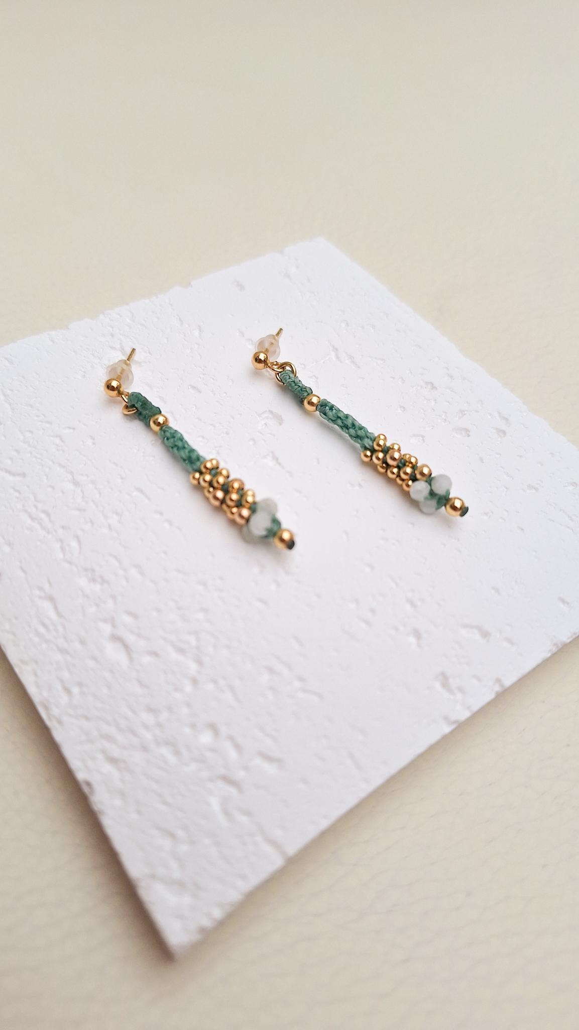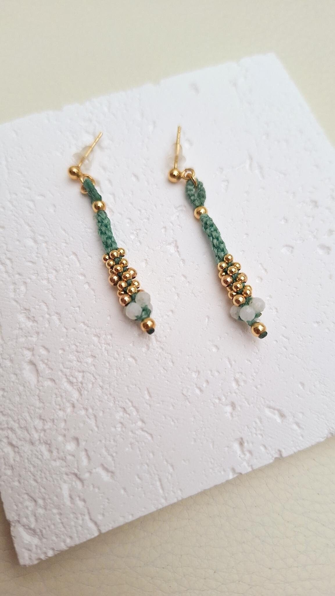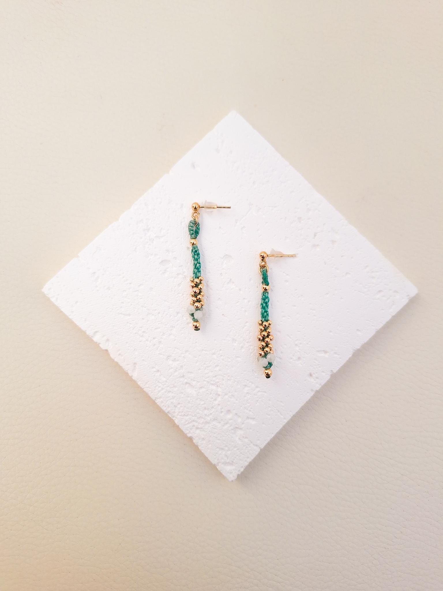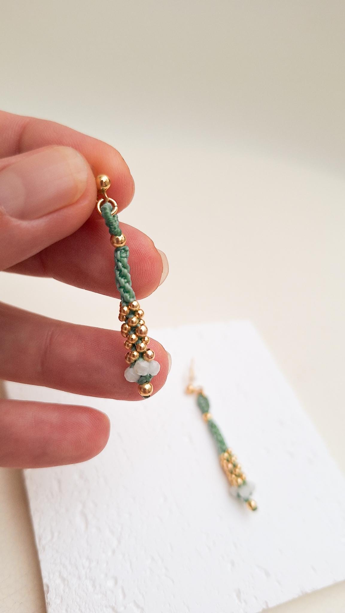 Long macramé earrings from the Marea Collection. These earrings are handmade using the macramé technique that gives shape and color, creating a unique design. The design is made with turquoise green waxed thread, gold-plated sterling silver beads and Moonstone. KALA Jewelry is created consciously and pampering every detail.