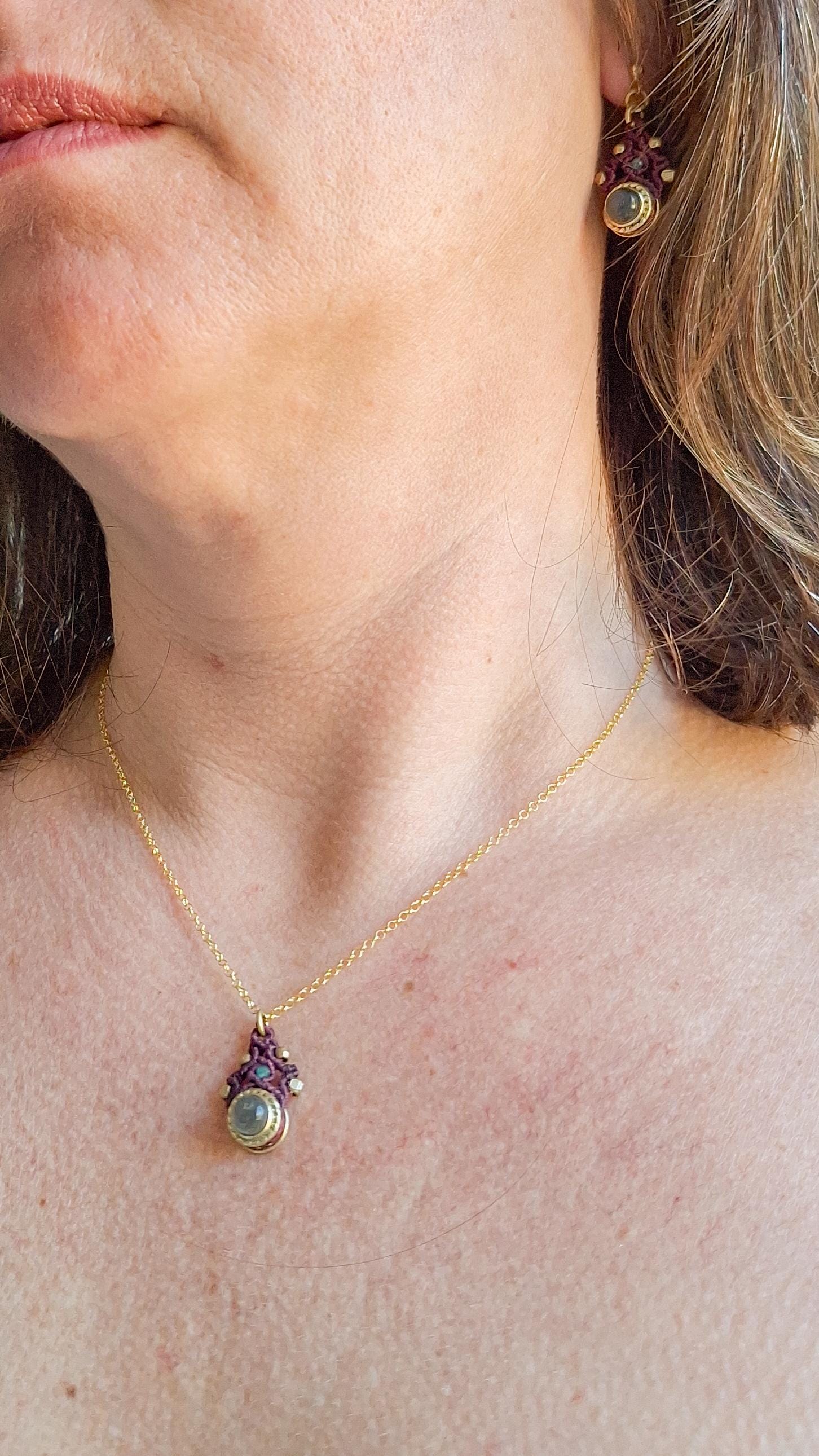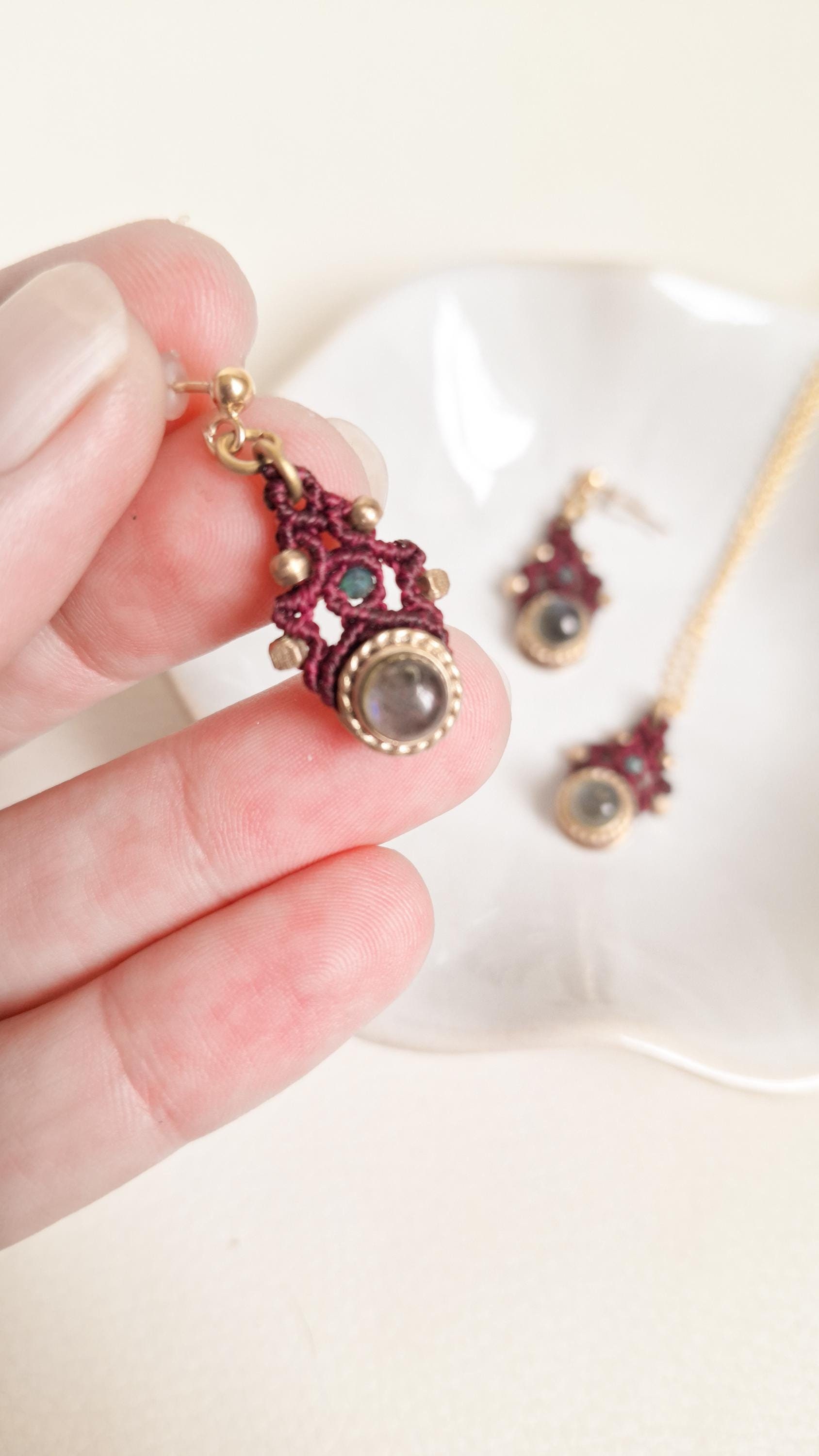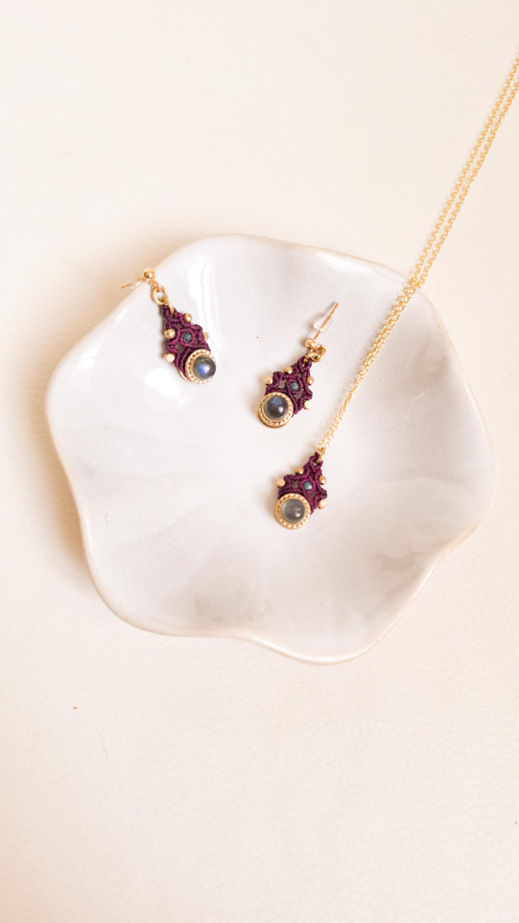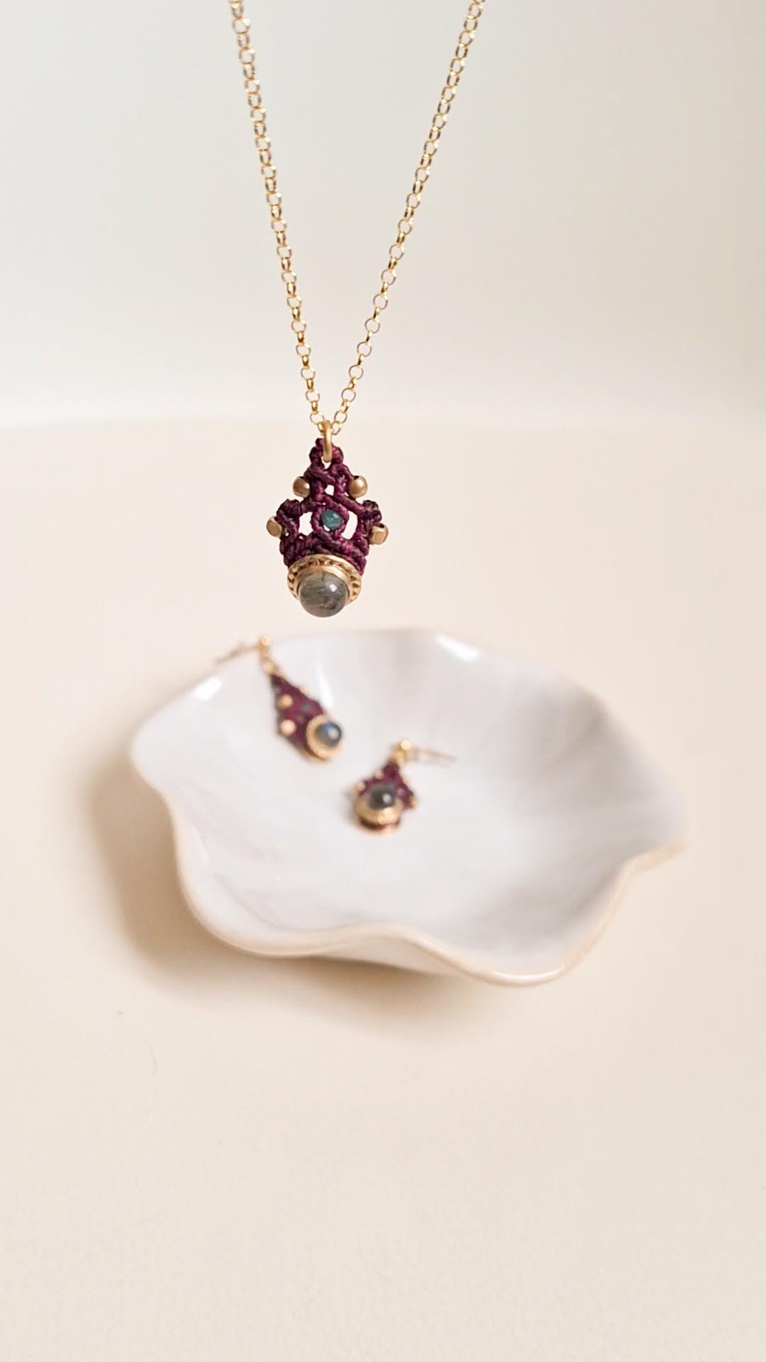 Set of pendant and long macramé earrings from the Eós Collection. They are designed with round Labradorite Stone set in brass, wine-colored waxed thread, Apatite stone beads and brass. The pendant chain and the earrings clasp are made of gold-plated silver. They are consciously handmade using the macramé technique that gives shape and color to this jewel, creating a unique, versatile and timeless design.