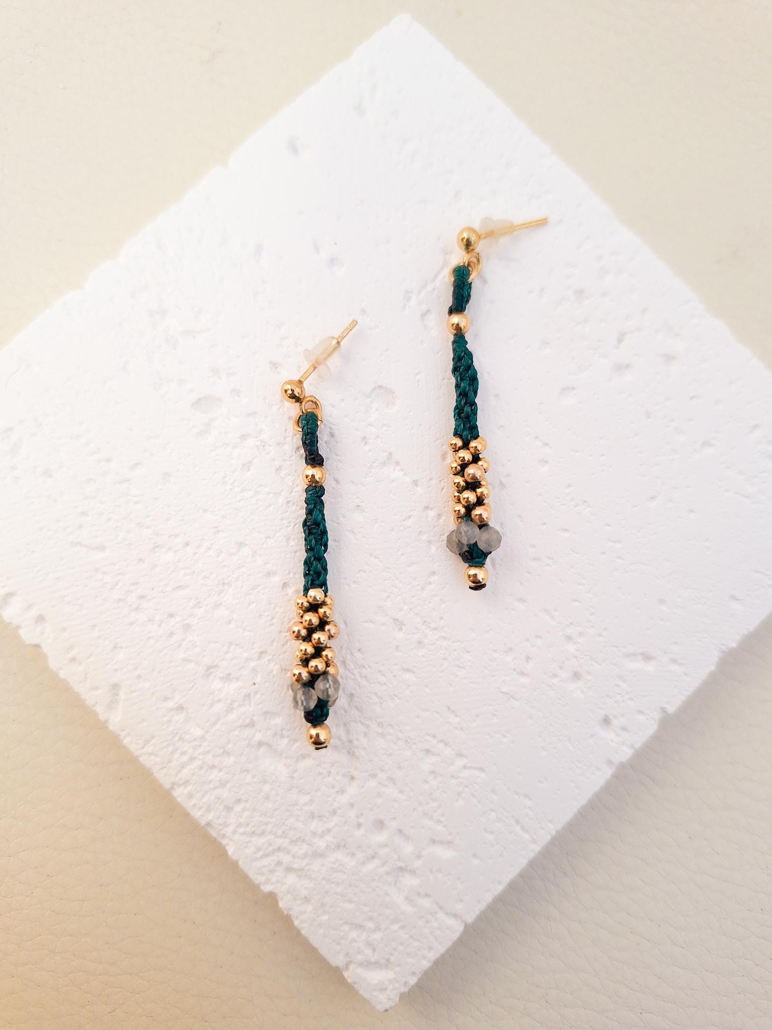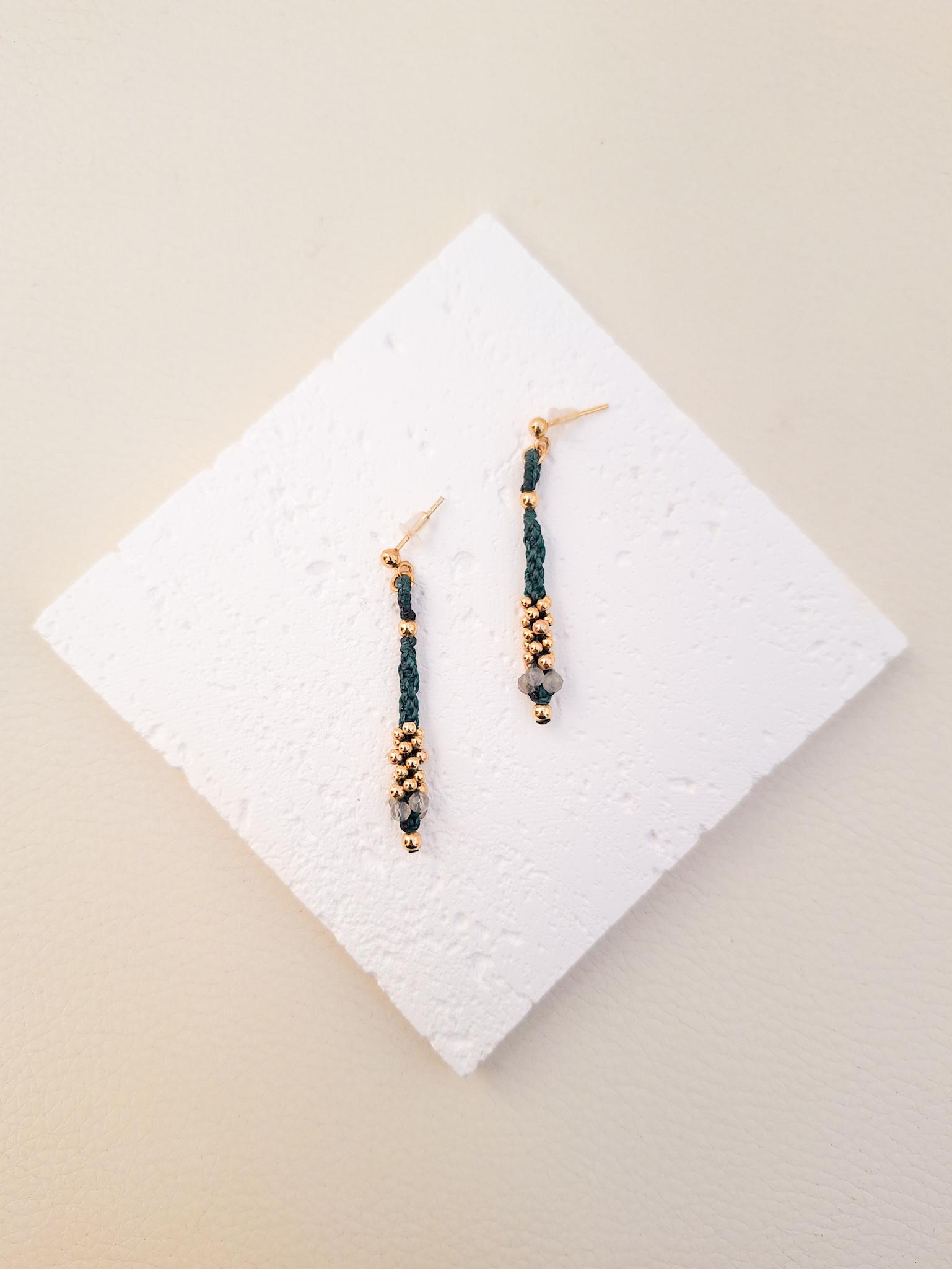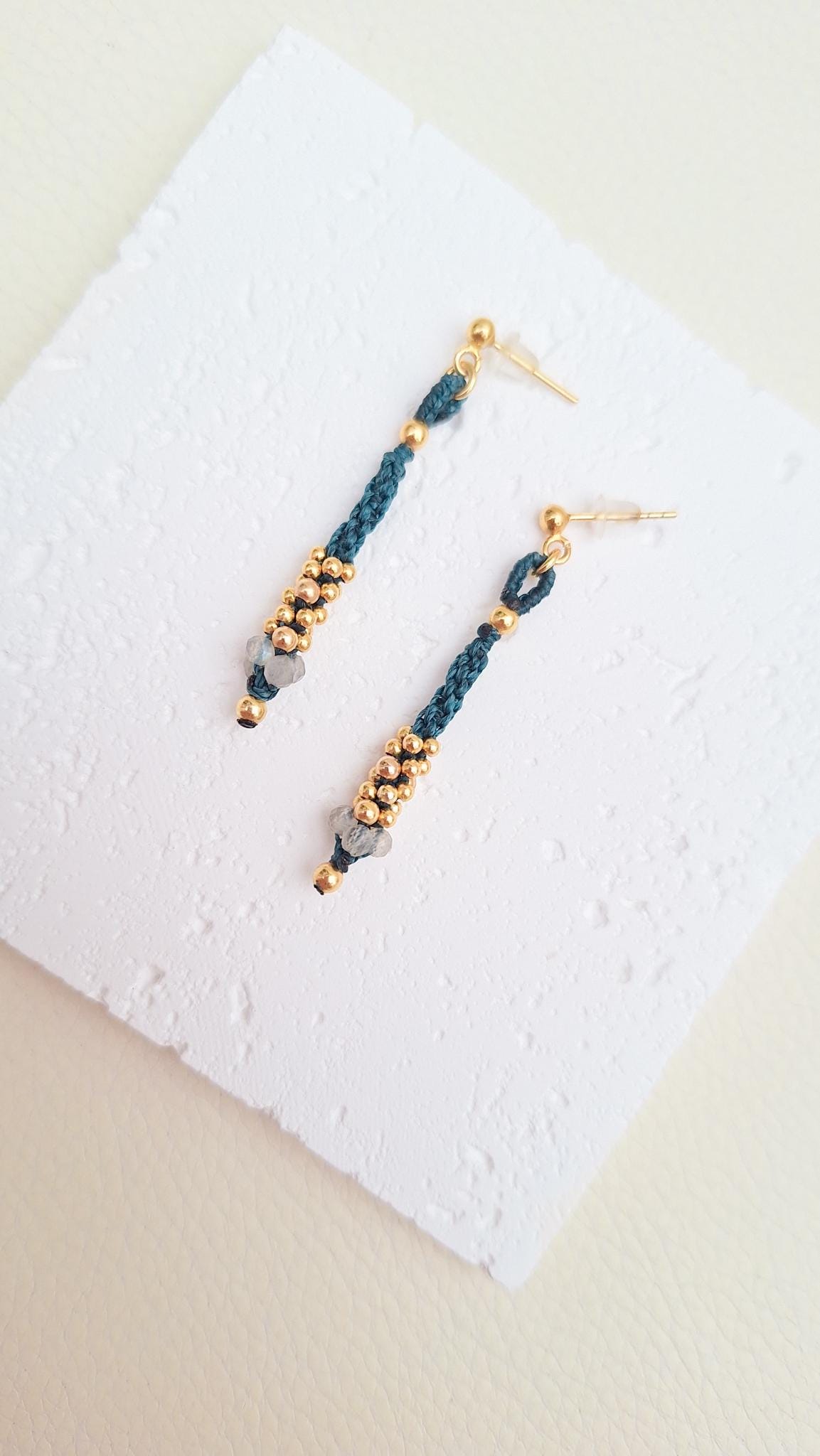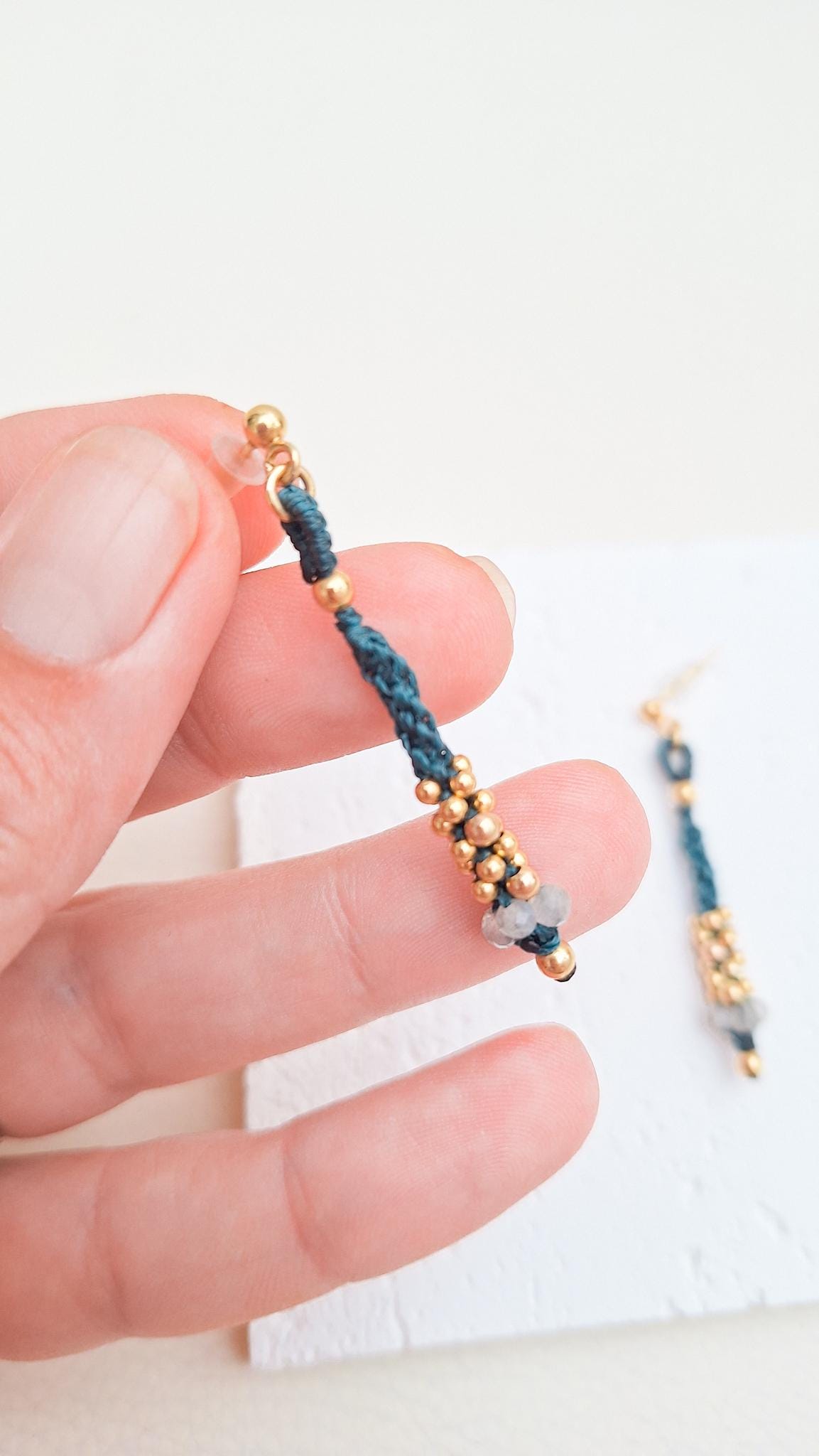 Long macramé earrings from the Marea Collection. These earrings are handmade using the macramé technique that gives shape and color, creating a unique design. The design is made with dark turquoise waxed thread, gold-plated sterling silver beads and Labradorite stones. KALA Jewelry is created consciously and pampering every detail.