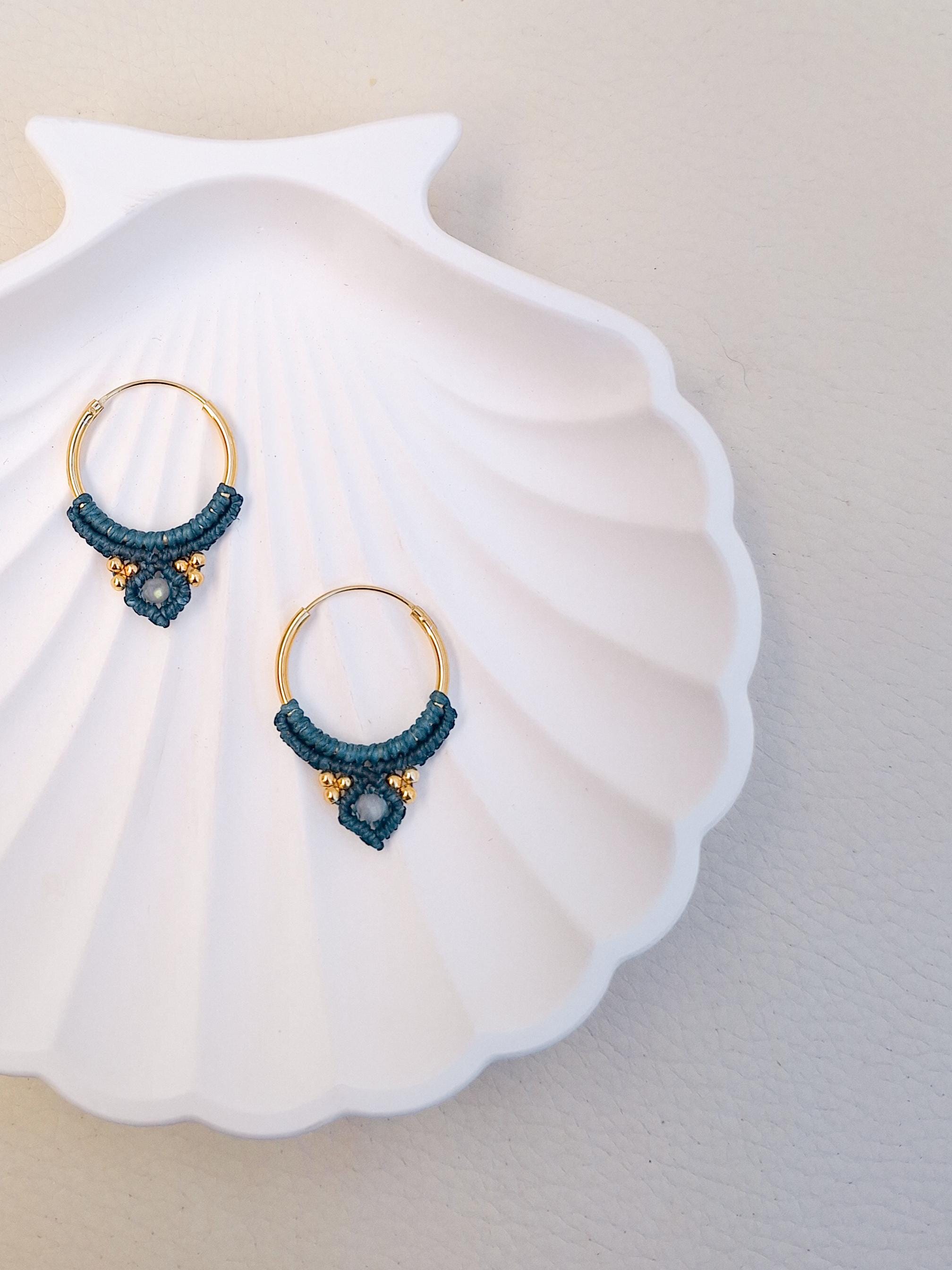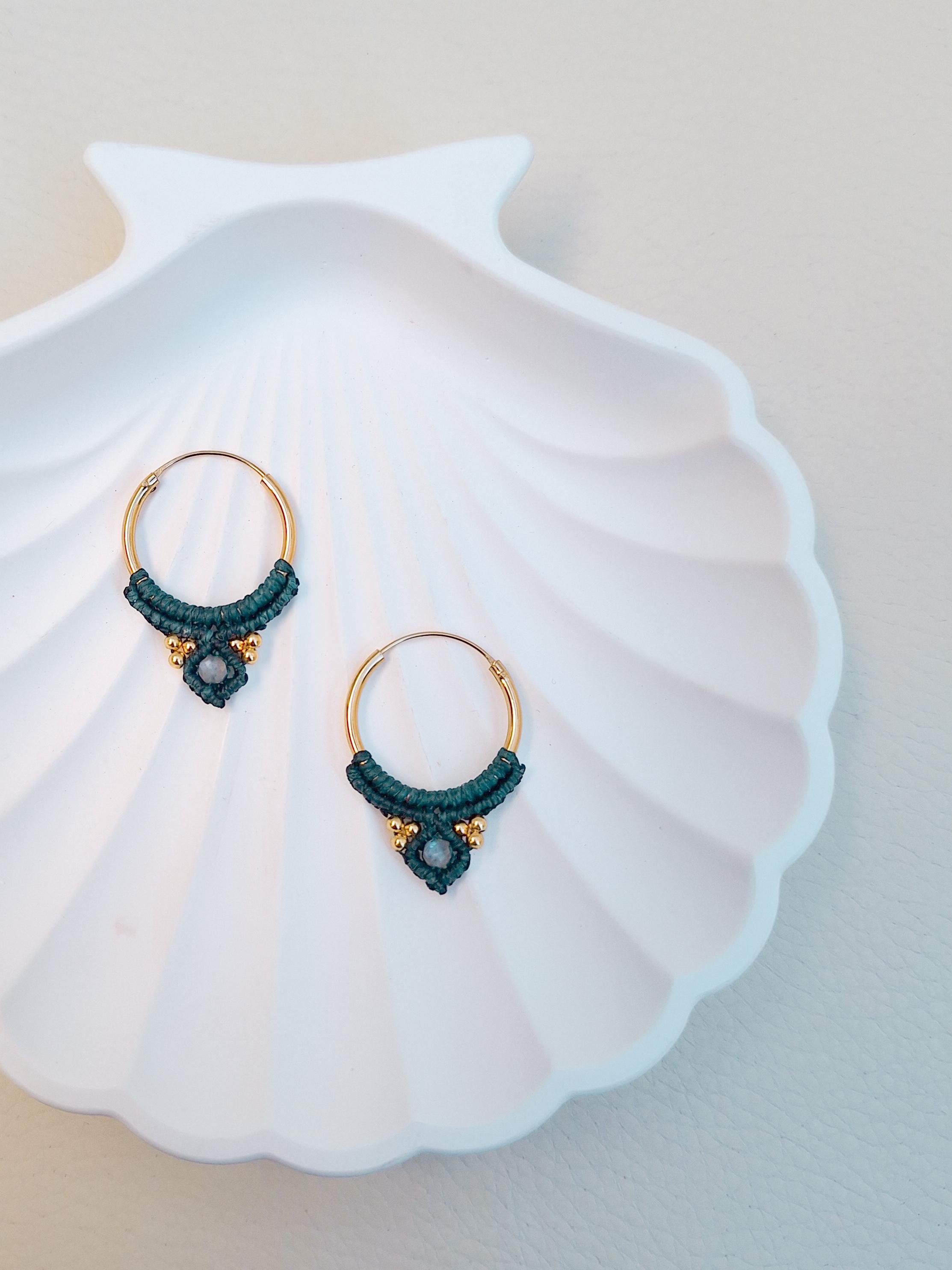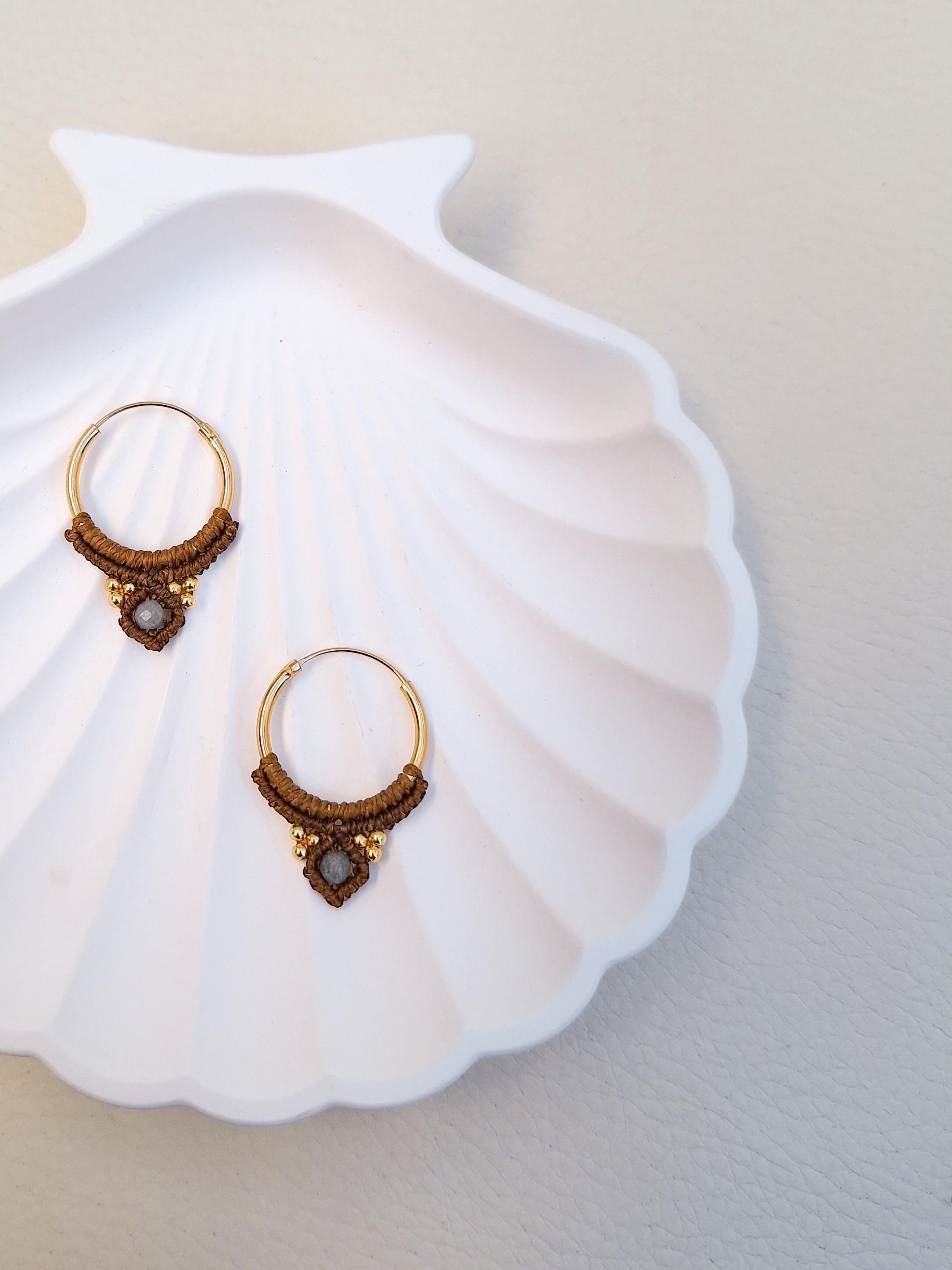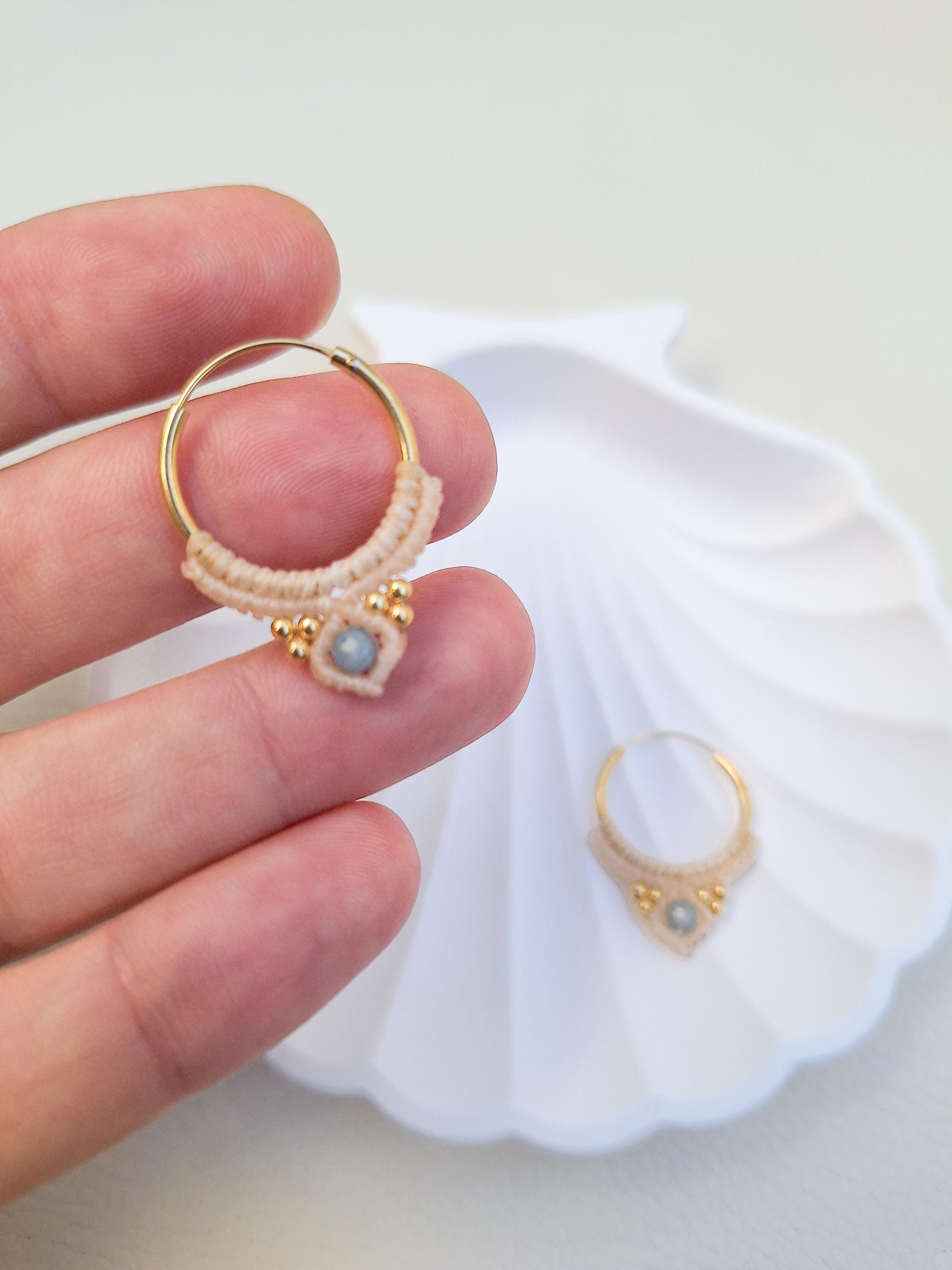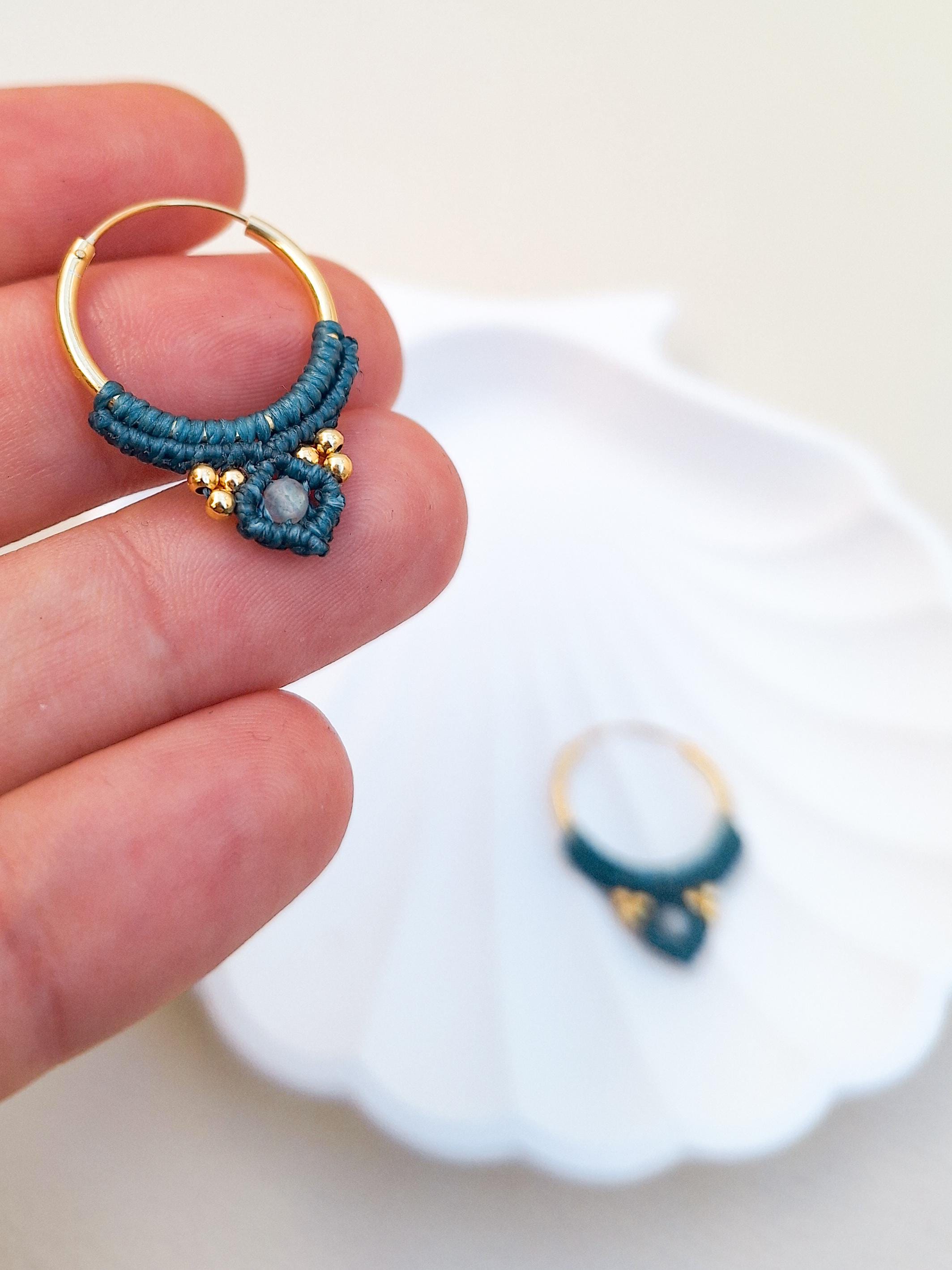 Gold-plated sterling silver hoop earrings. Handmade in macramé, faceted natural stones and waxed thread. Its design is minimalist with fine lines that fuse subtlety and originality. These are comfortable earrings and perfect for enhancing your daily look. The materials are long-lasting and hypoallergenic.