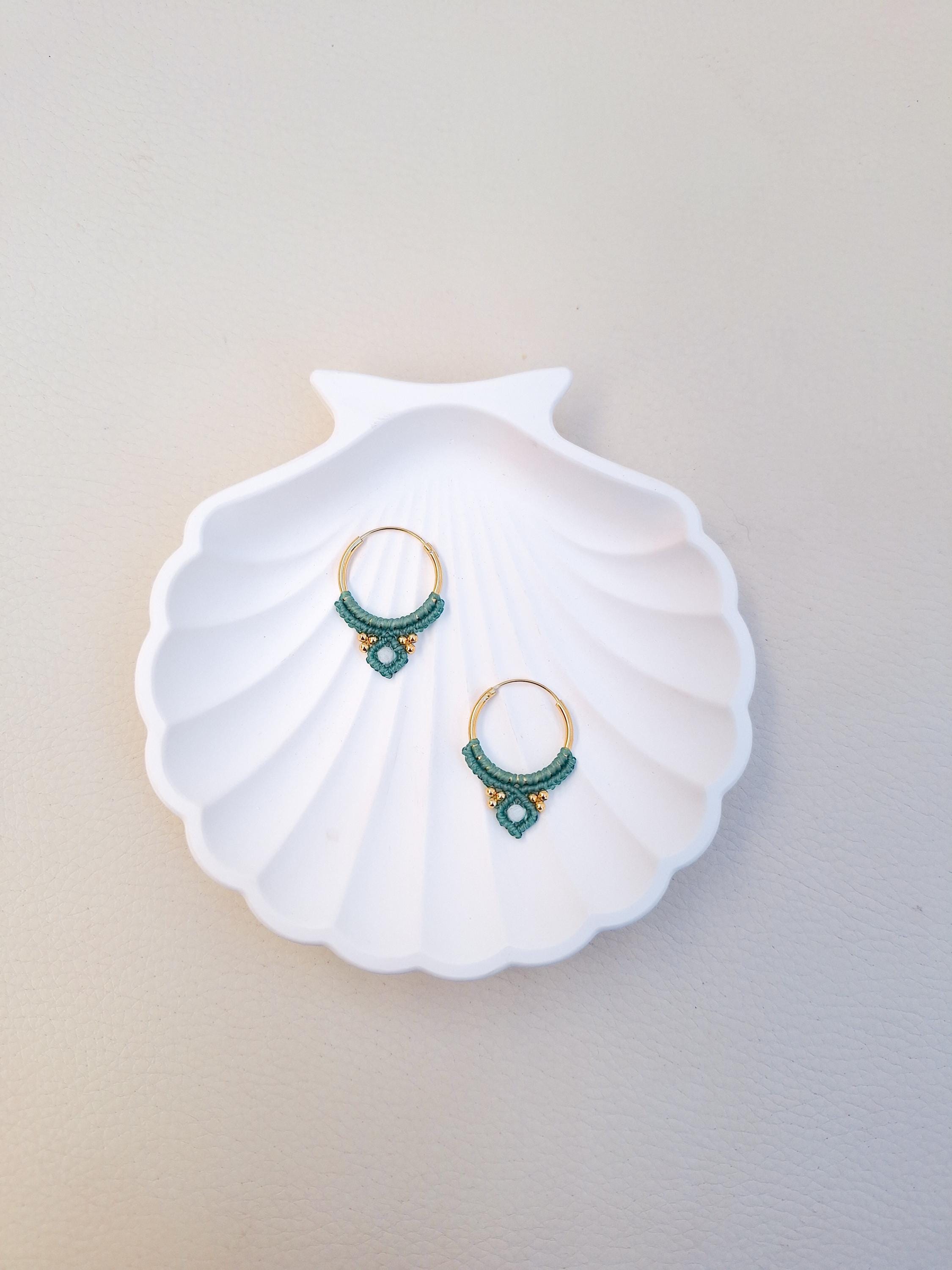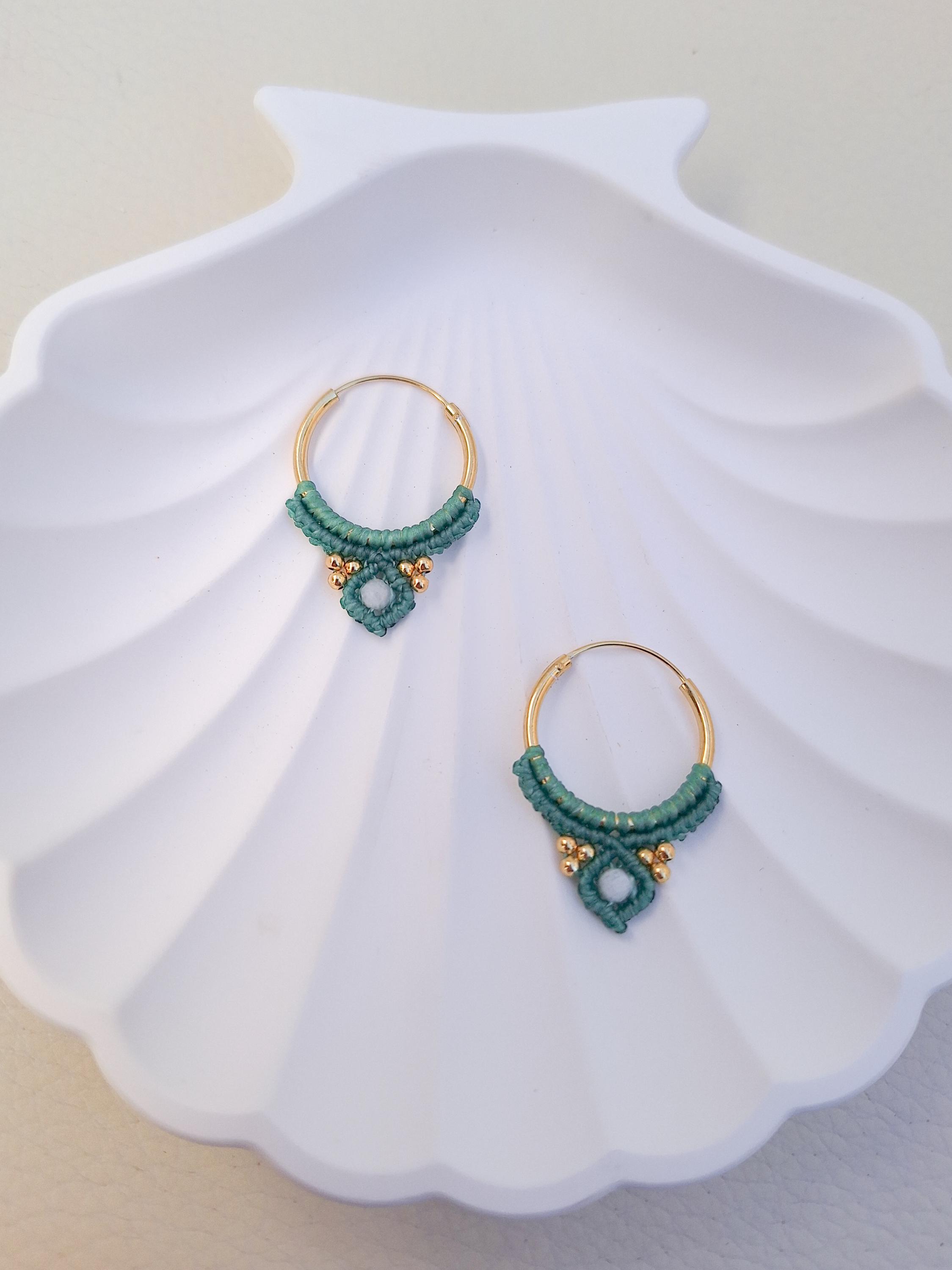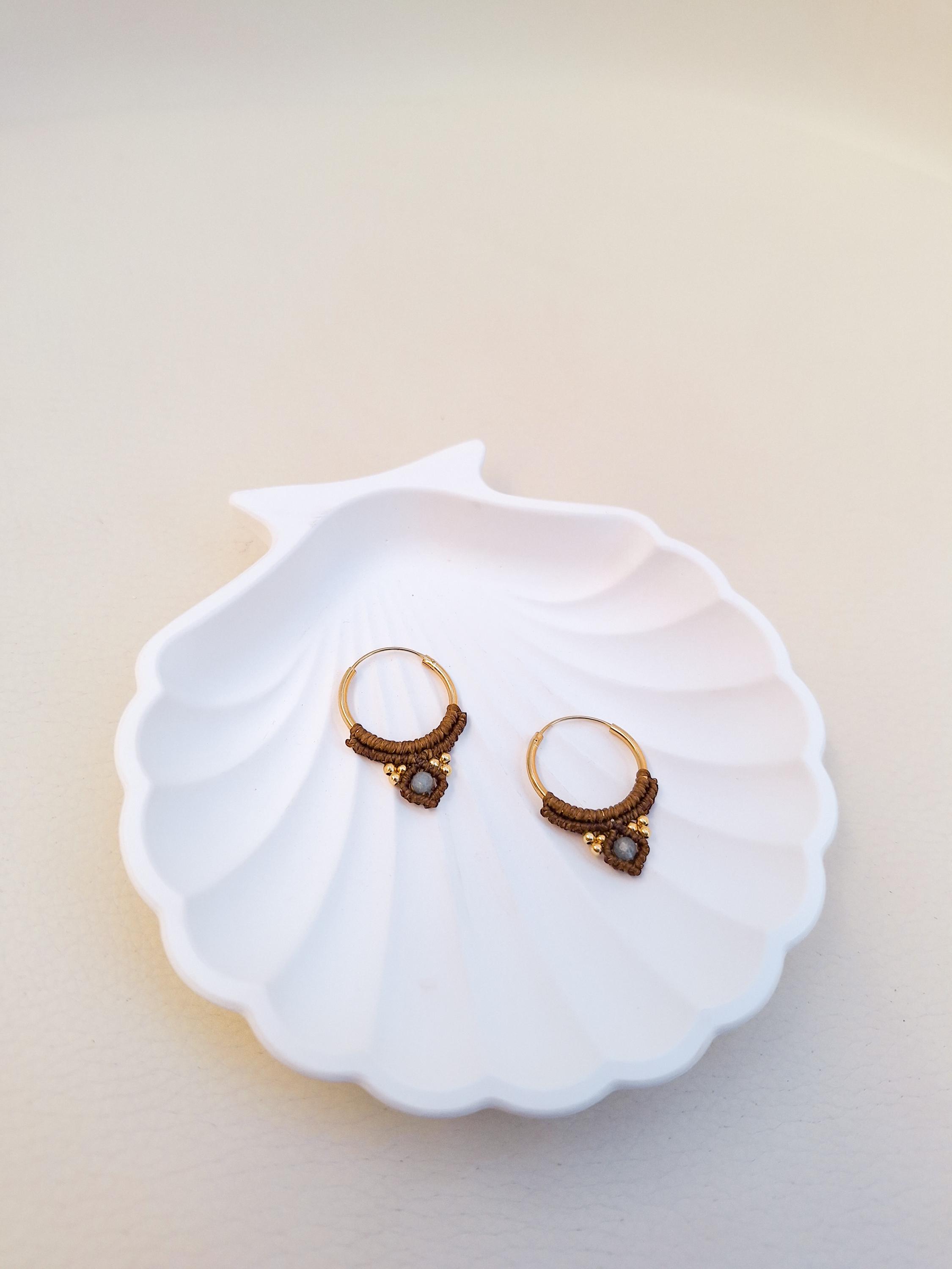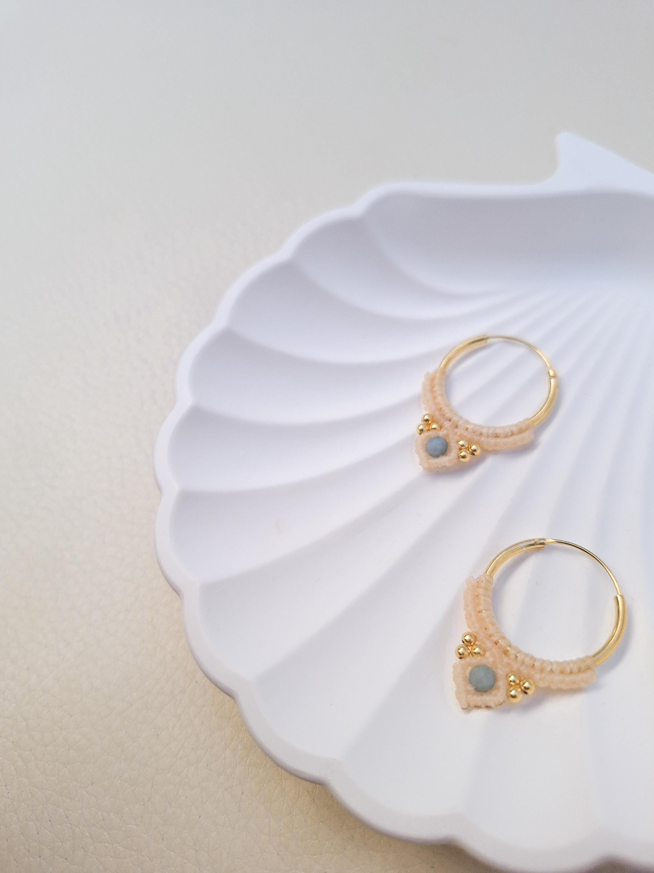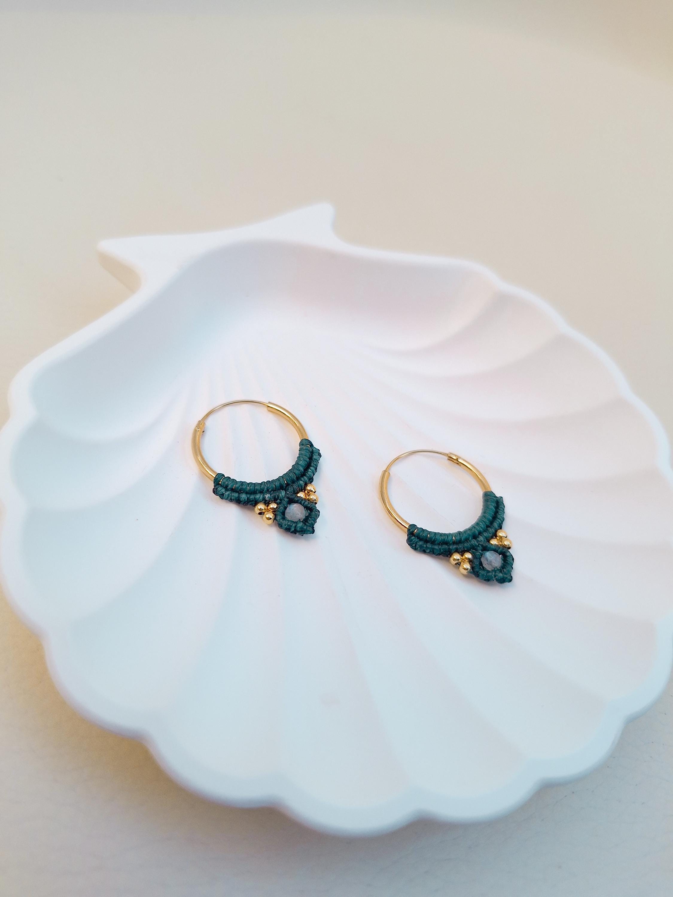 Gold-plated sterling silver hoop earrings. Handmade in macramé, faceted natural stones and waxed thread. Its design is minimalist with fine lines that fuse subtlety and originality. These are comfortable earrings and perfect for enhancing your daily look. The materials are long-lasting and hypoallergenic.