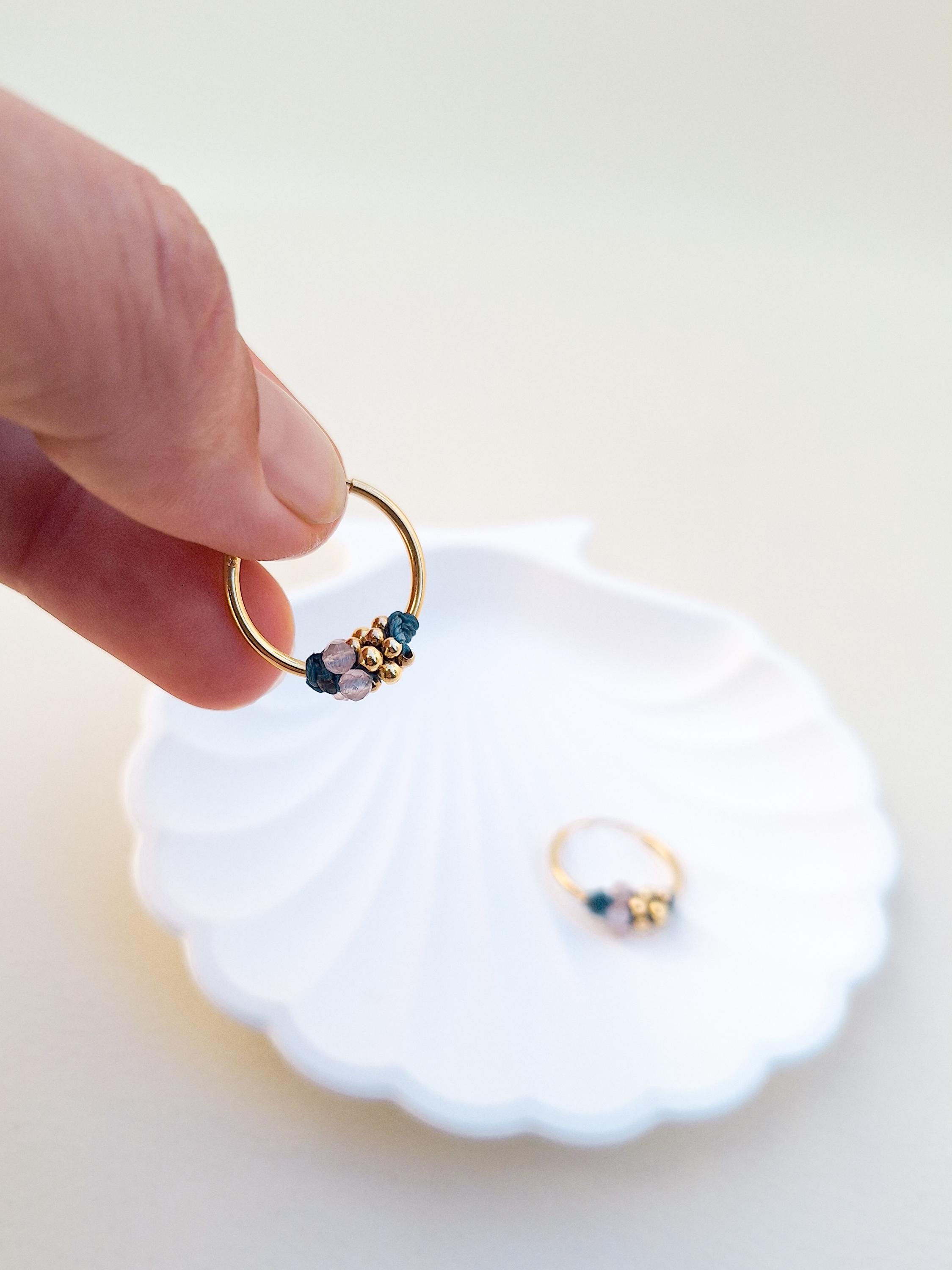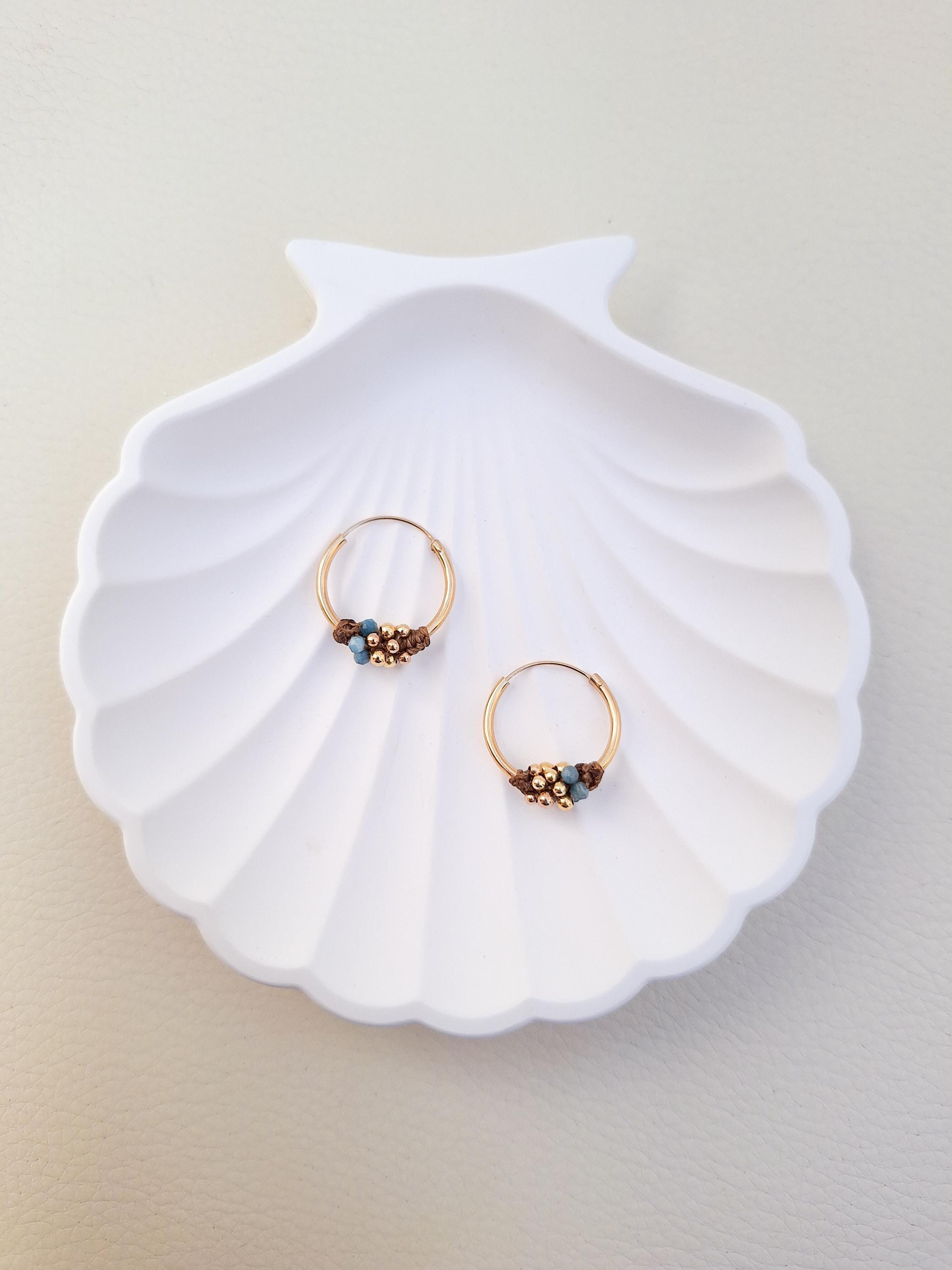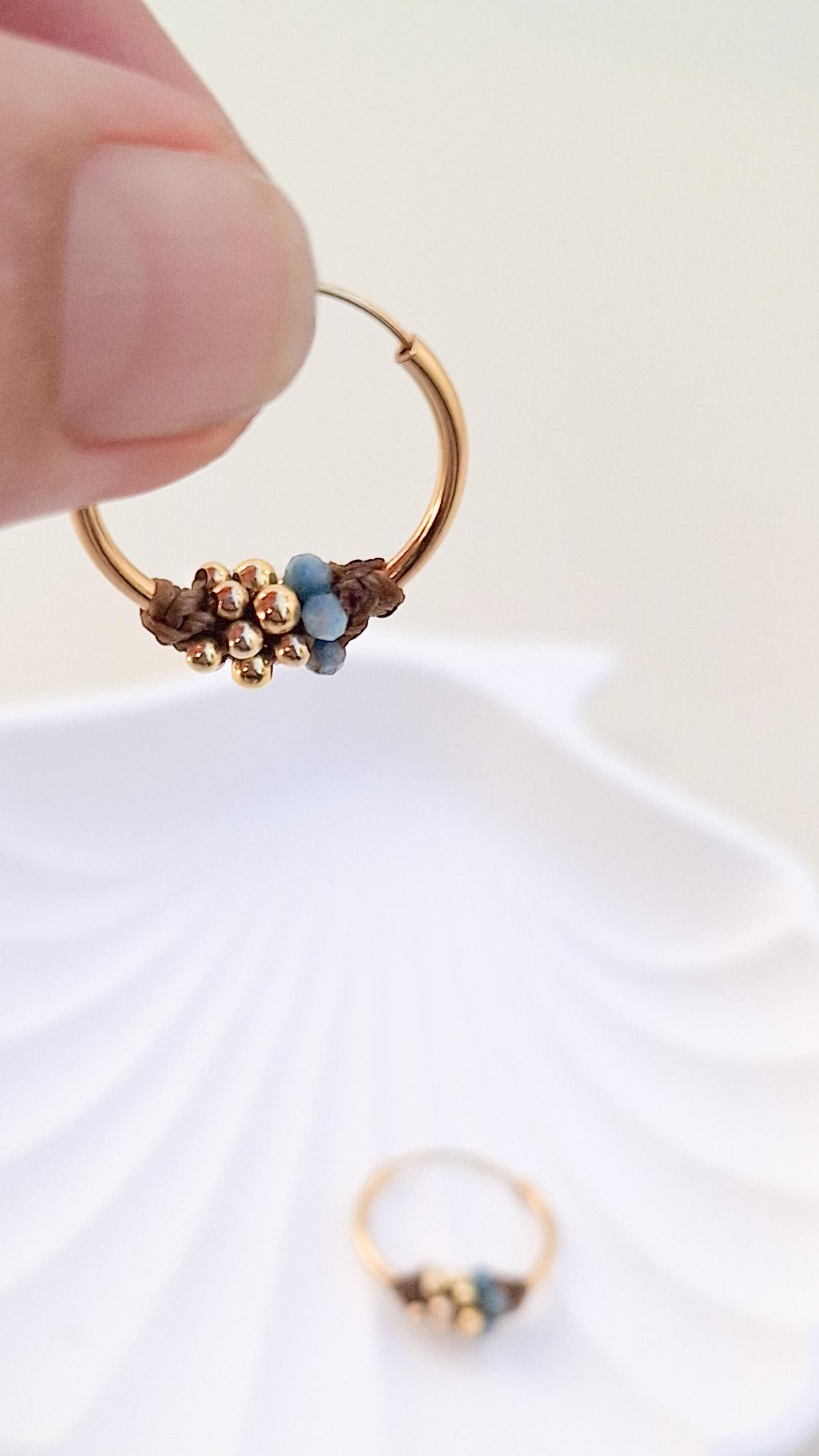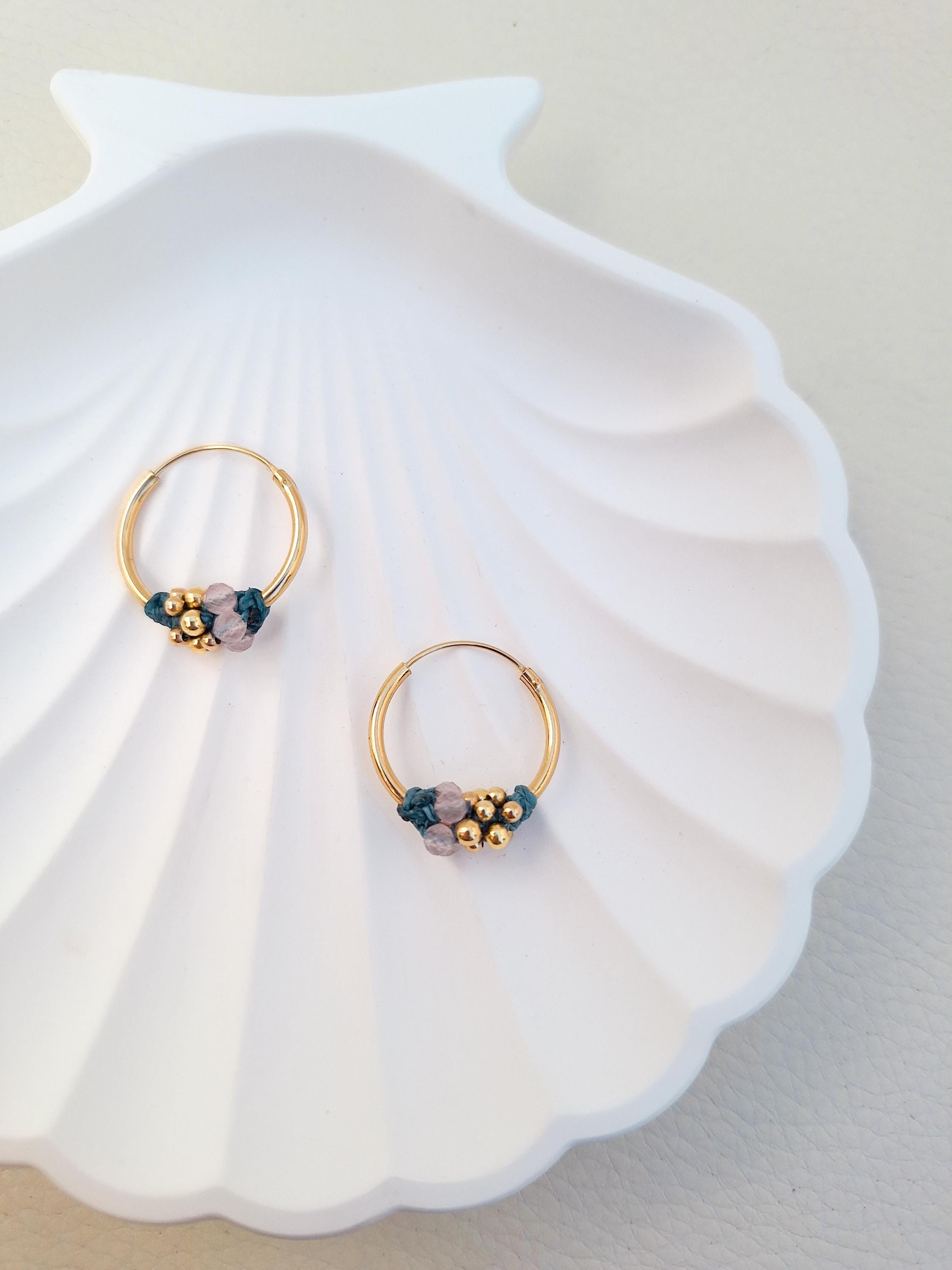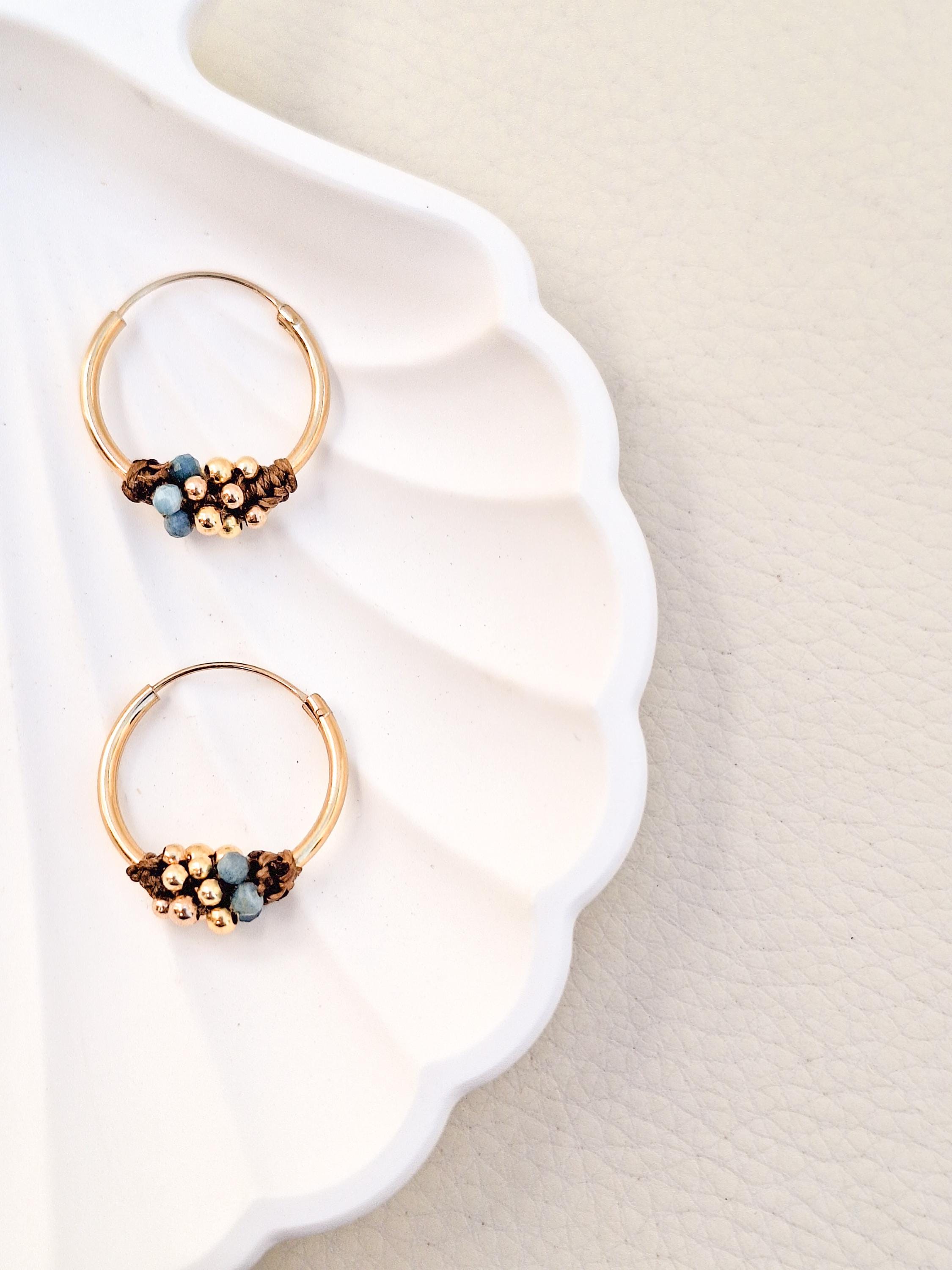 Hoop earrings from the Marea Collection. Handmade in macramé, gold-plated sterling silver, faceted natural stones and waxed thread. Its design is minimalist with fine lines that fuse subtlety and originality. These are comfortable earrings that are perfect for enhancing your daily look. The materials are long-lasting and hypoallergenic.