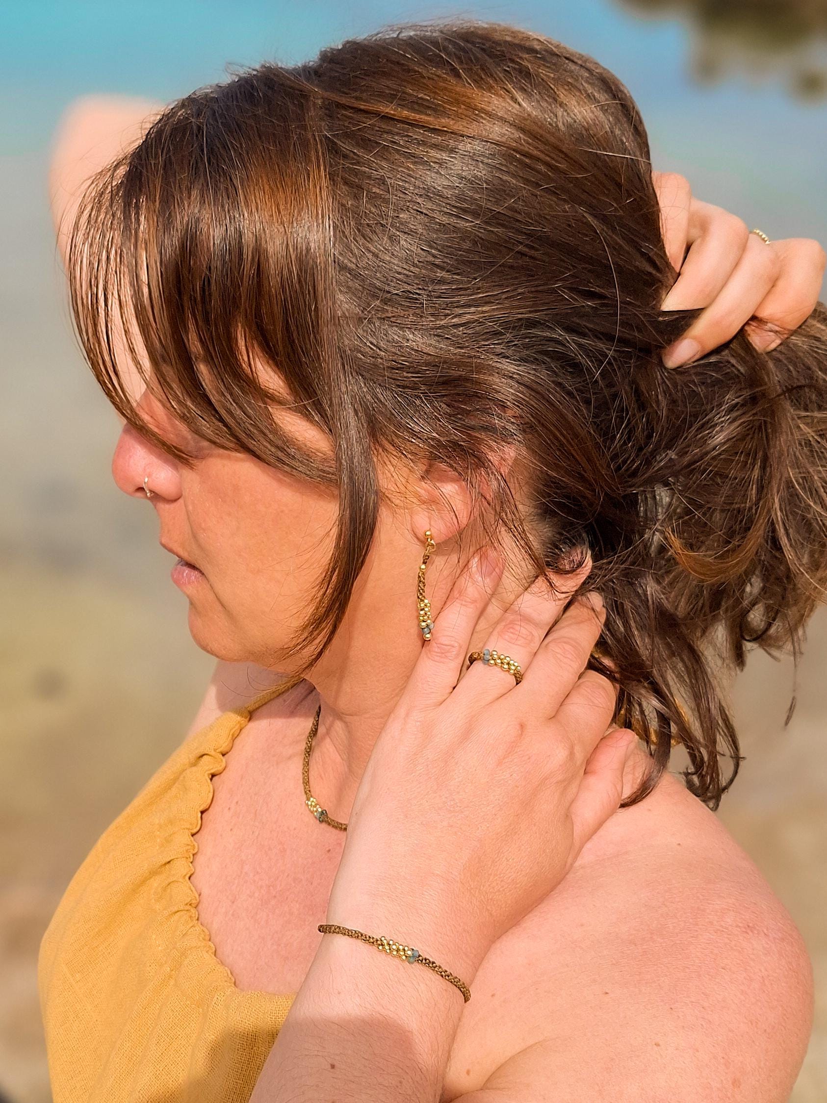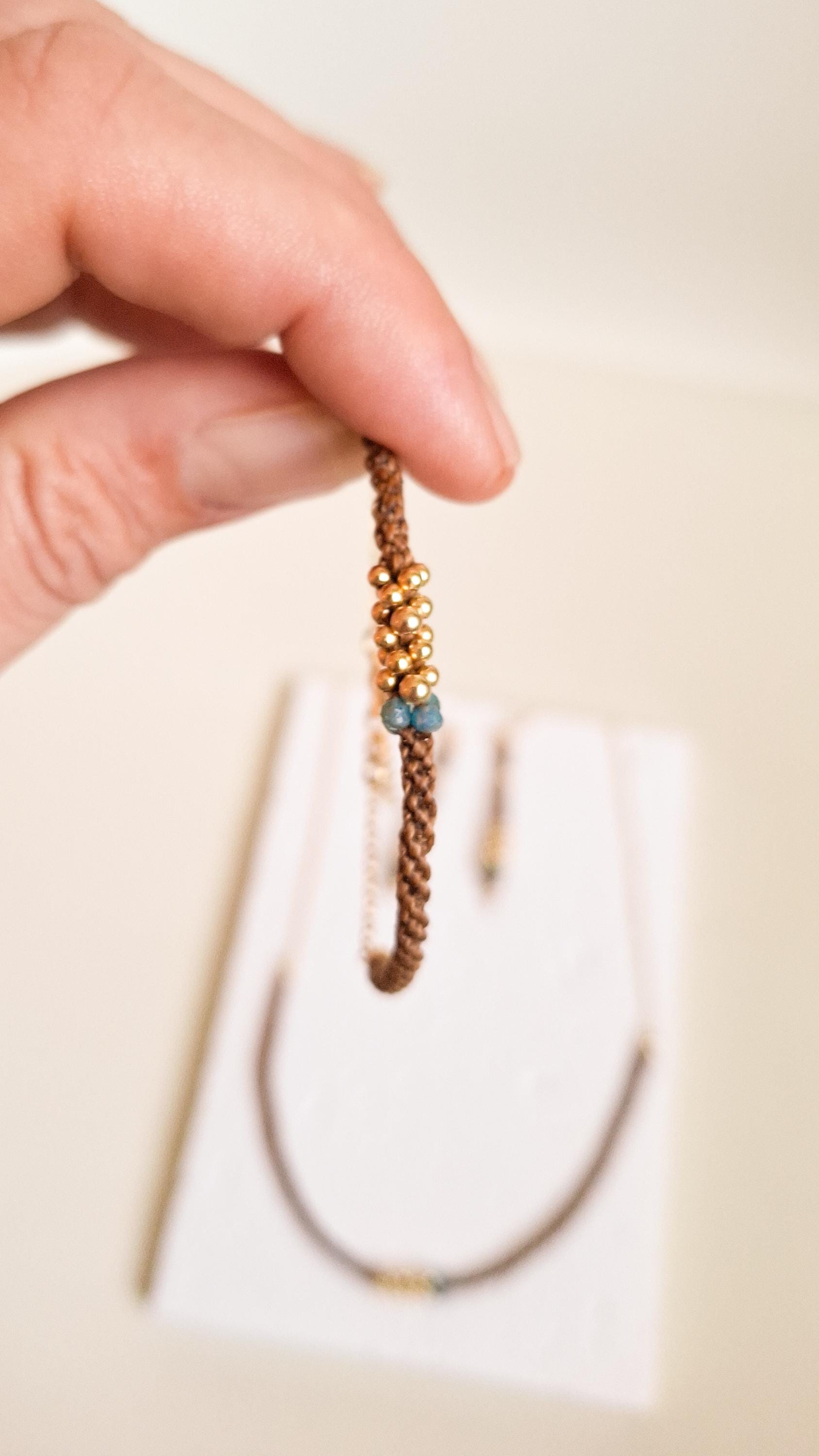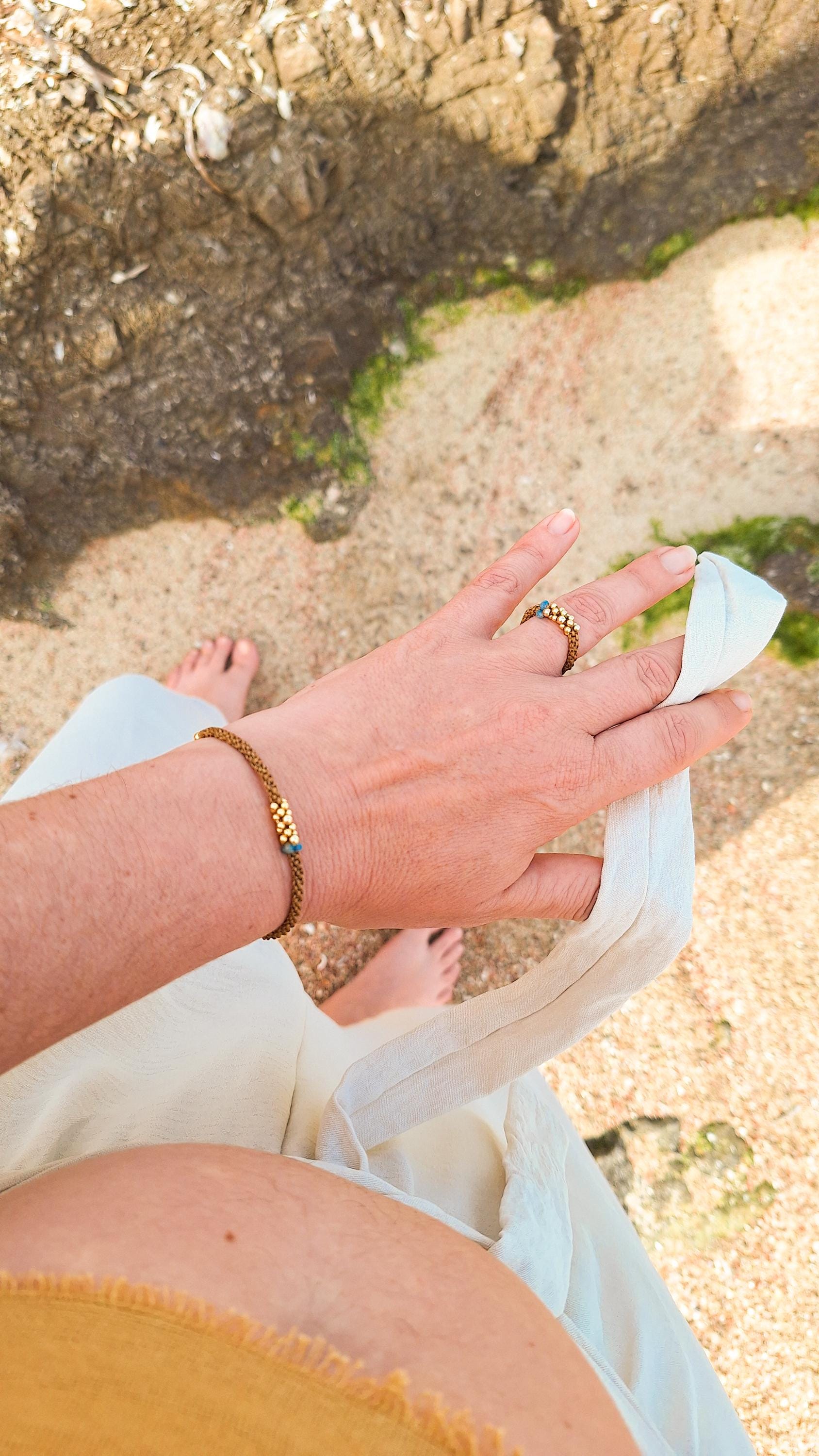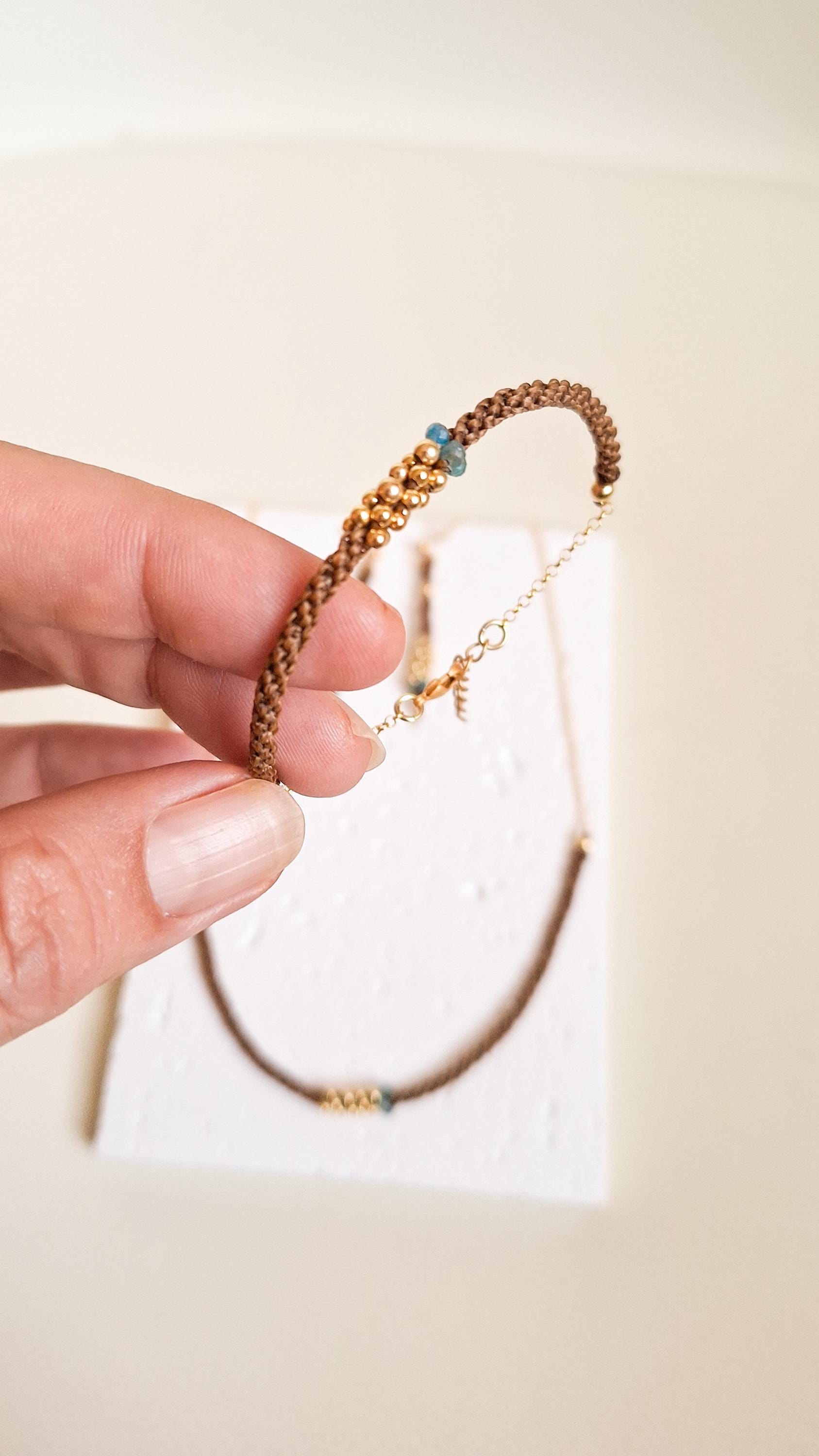 Macramé bracelet from the Marea Collection. This bracelet is handmade using the macramé technique that gives shape and color, creating a unique design. The design is made with golden brown waxed thread, gold-plated sterling silver chain and beads, and Apatite stones. KALA Jewelry is created consciously and pampering every detail.