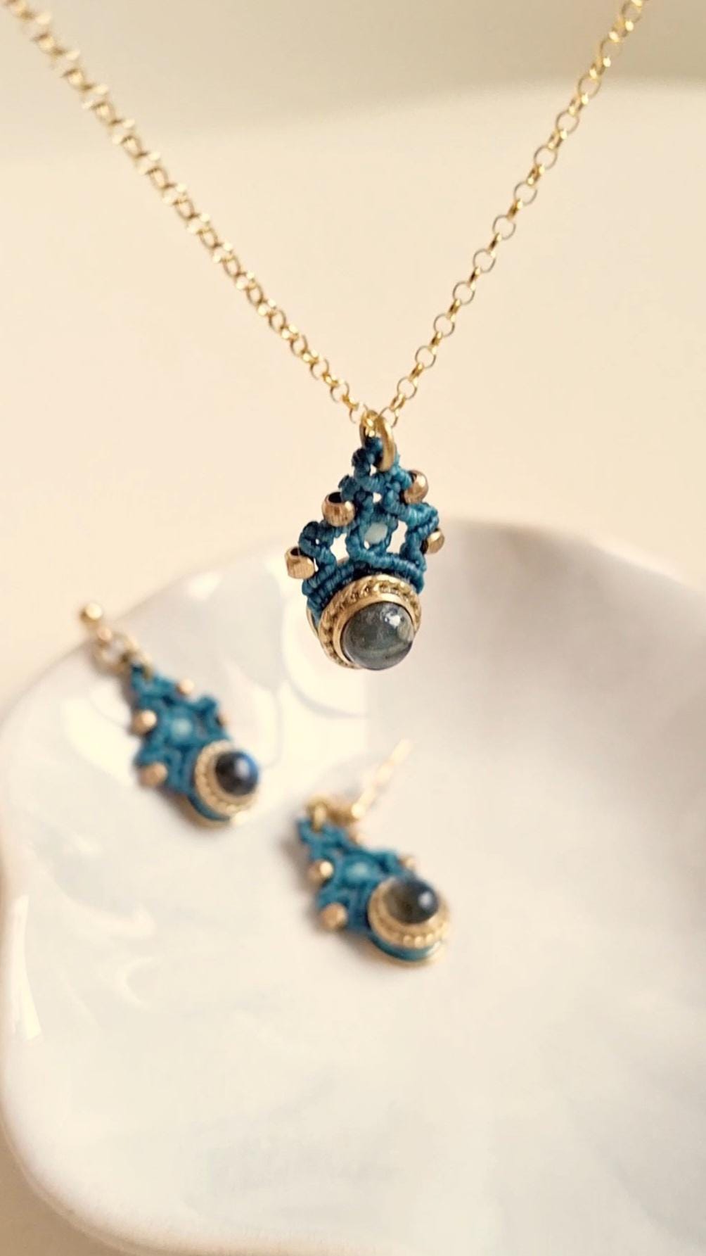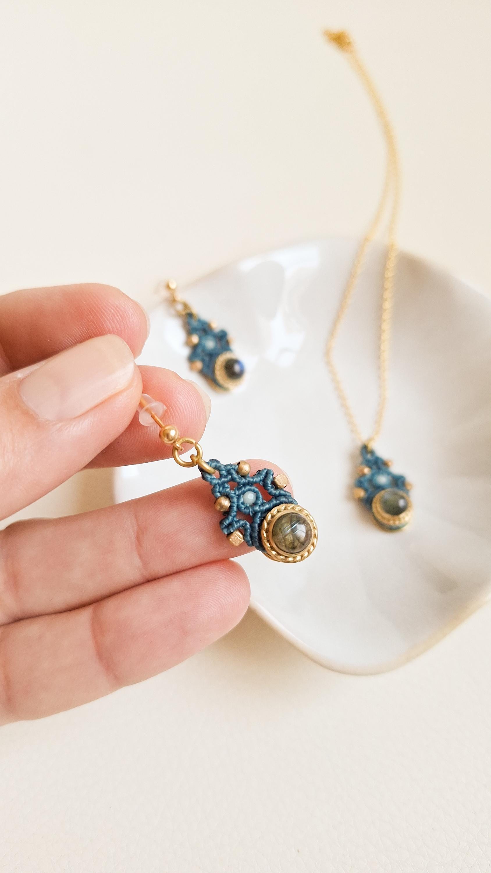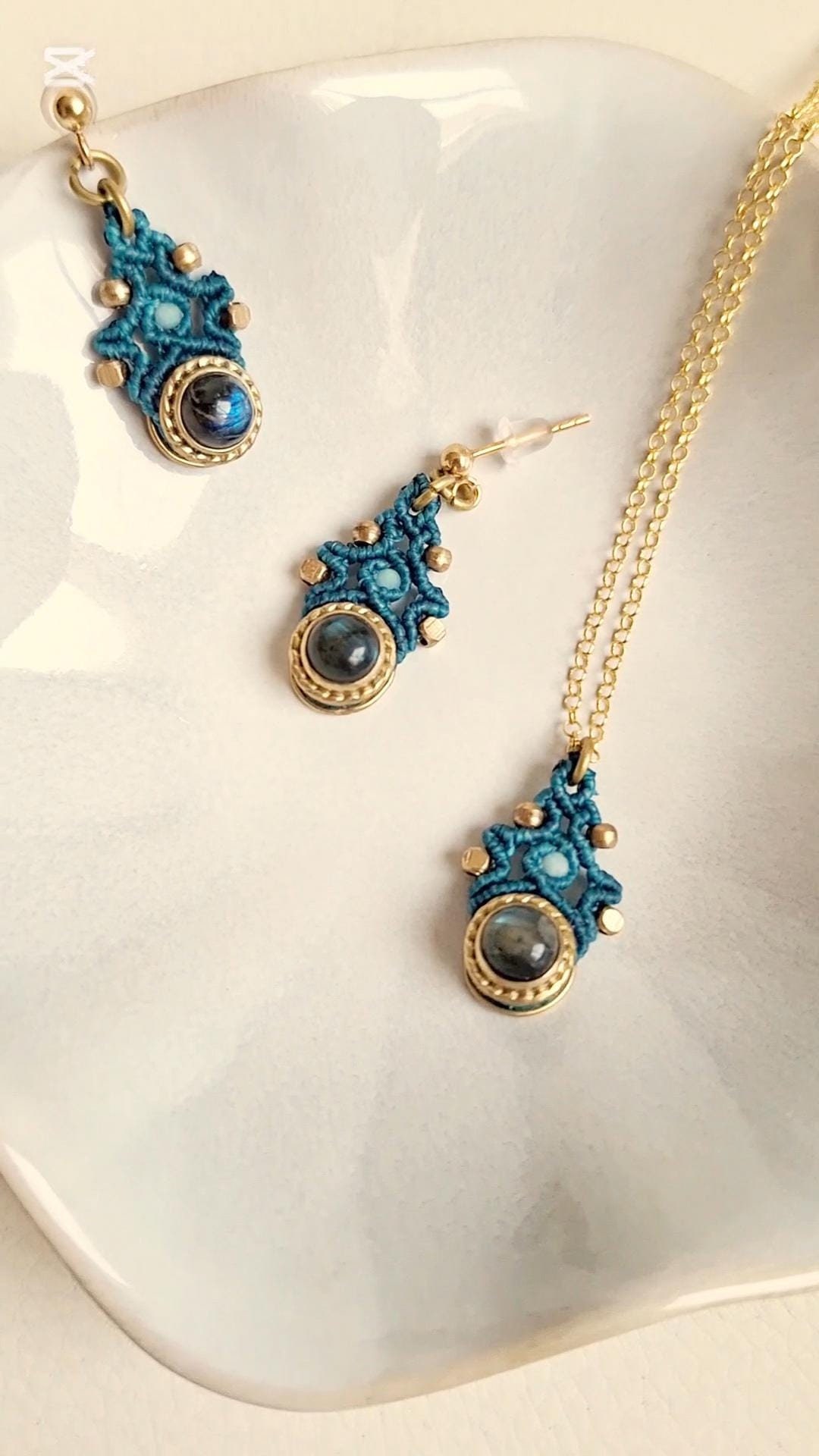 Set of pendant and long macramé earrings from the Eós Collection. They are designed with round Labradorite Stone set in brass, petrol blue waxed thread, Apatite stone beads and brass. The pendant chain and the earrings clasp are made of gold-plated silver. They are consciously handmade using the macramé technique that gives shape and color to this jewel, creating a unique, versatile and timeless design.