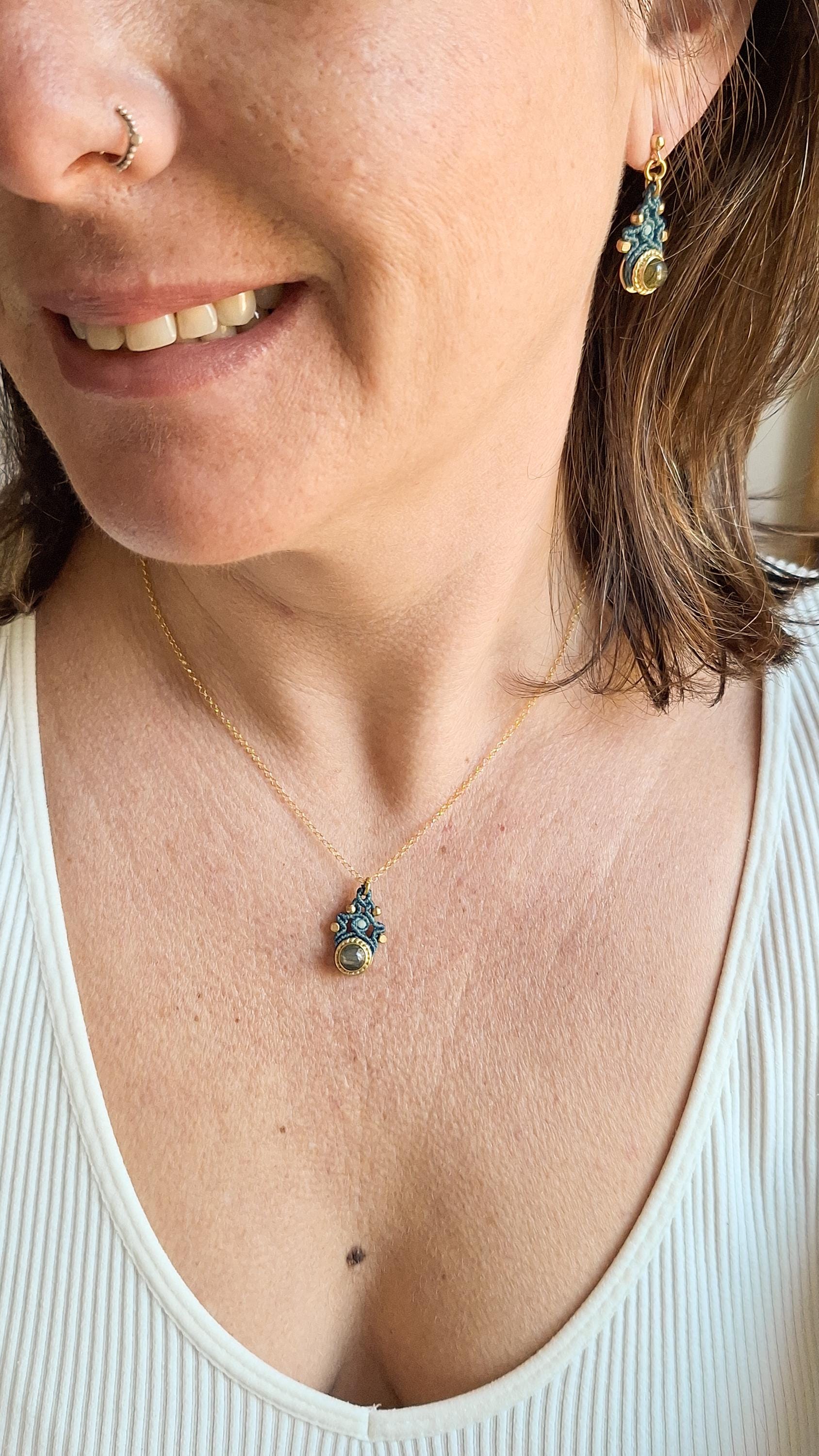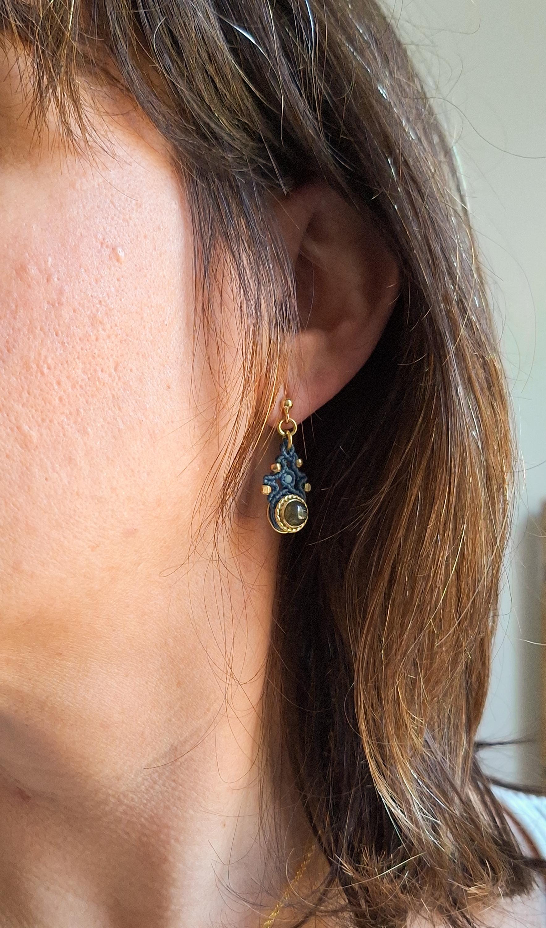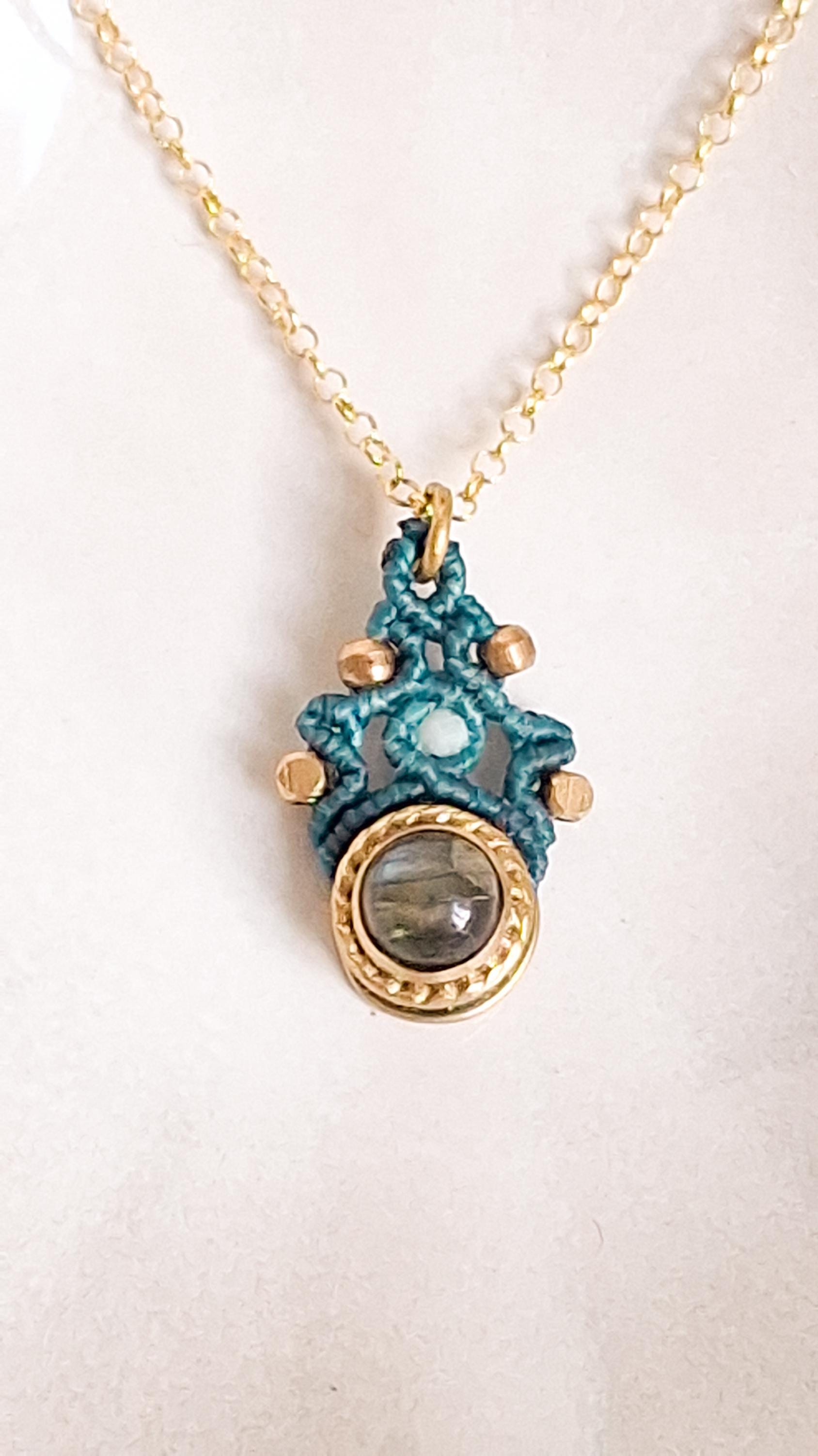 Set of pendant and long macramé earrings from the Eós Collection. They are designed with round Labradorite Stone set in brass, petrol blue waxed thread, Apatite stone beads and brass. The pendant chain and the earrings clasp are made of gold-plated silver. They are consciously handmade using the macramé technique that gives shape and color to this jewel, creating a unique, versatile and timeless design.