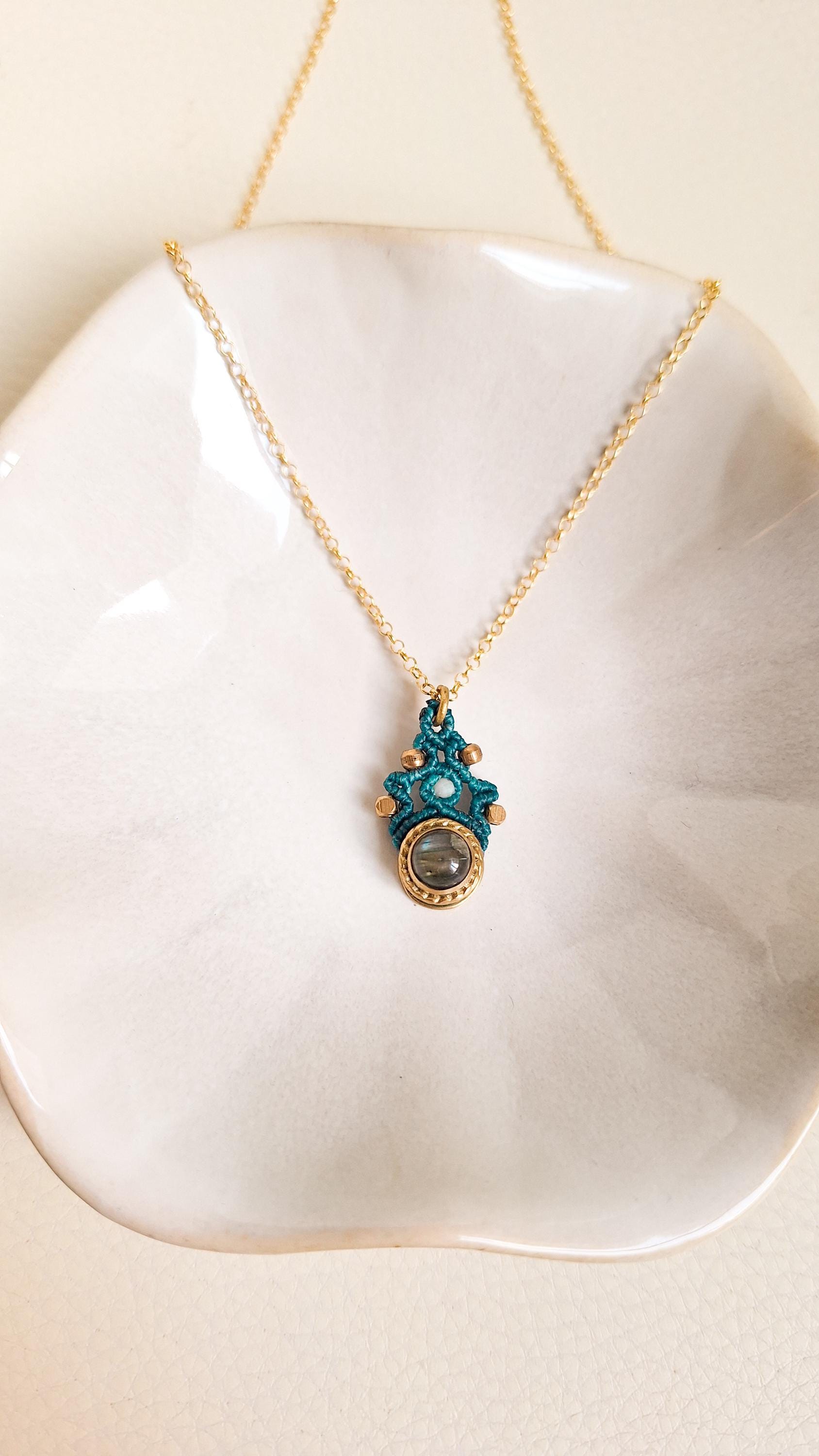 Blue macramé pendant from the Eós Collection. This gold necklace is designed with a small round Labradorite stone set in brass, petrol blue waxed thread, Apatite stone beads and brass. The pendant chain is made of gold-plated silver. The pendant is consciously handmade using the macramé technique, which gives shape and colour to this jewel, creating a unique, versatile and timeless design.
