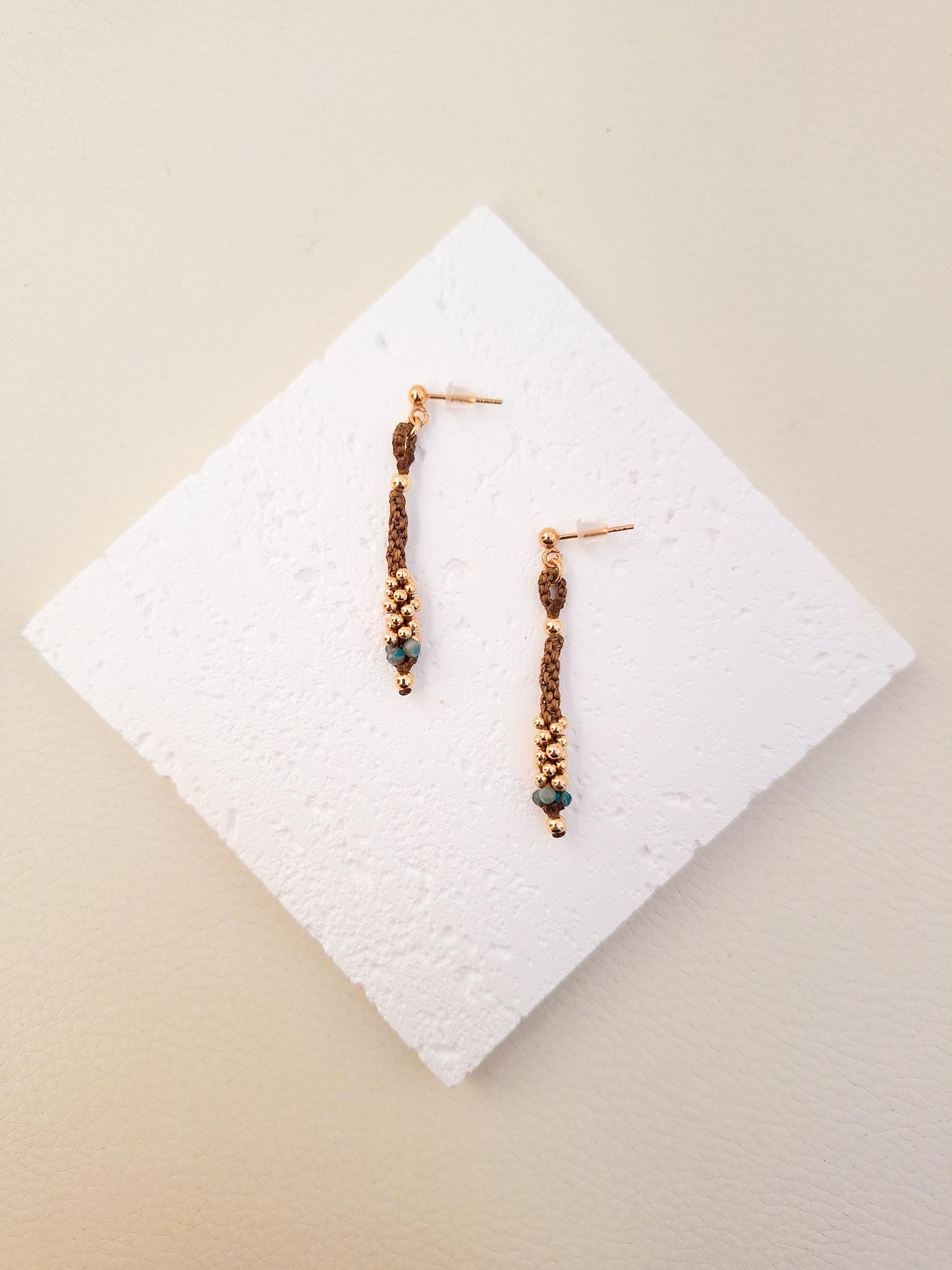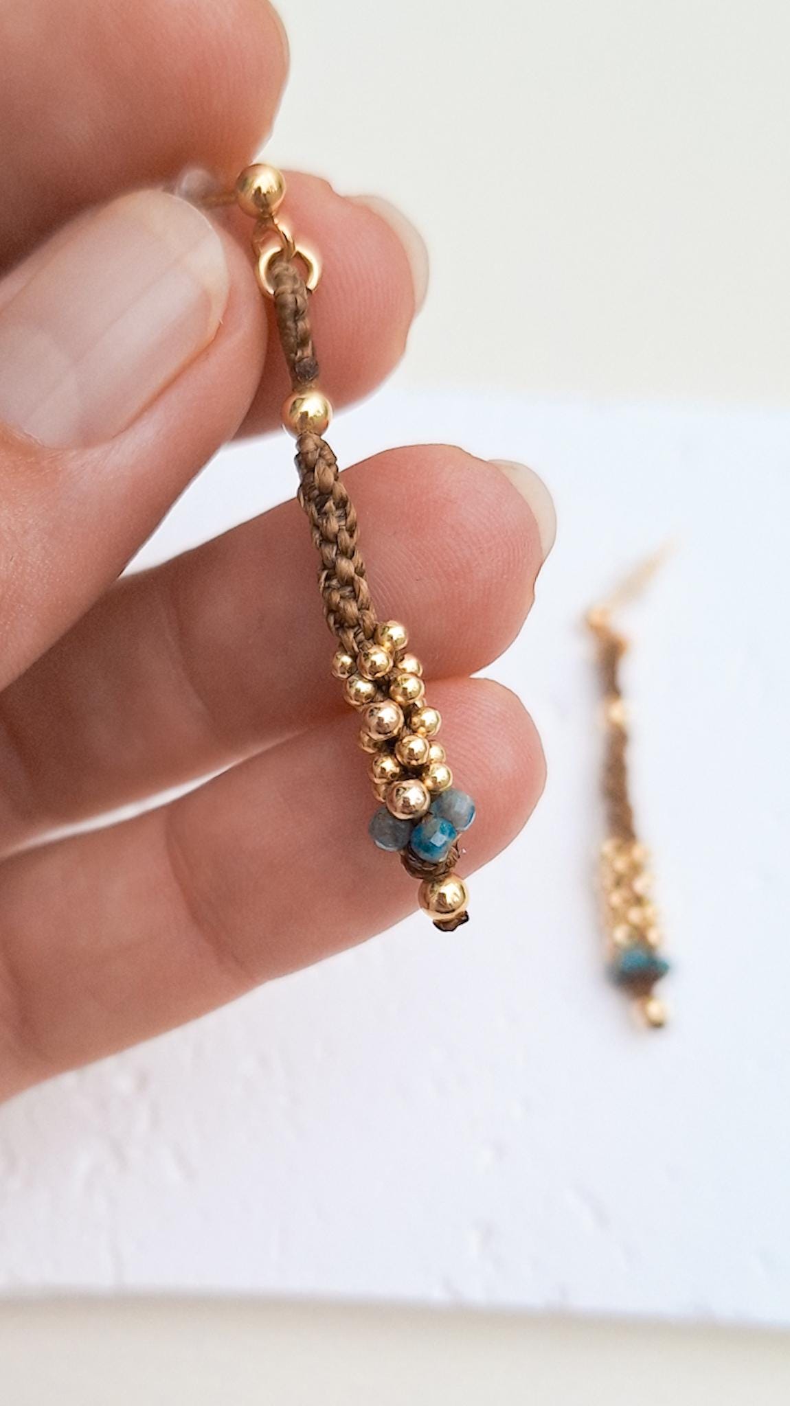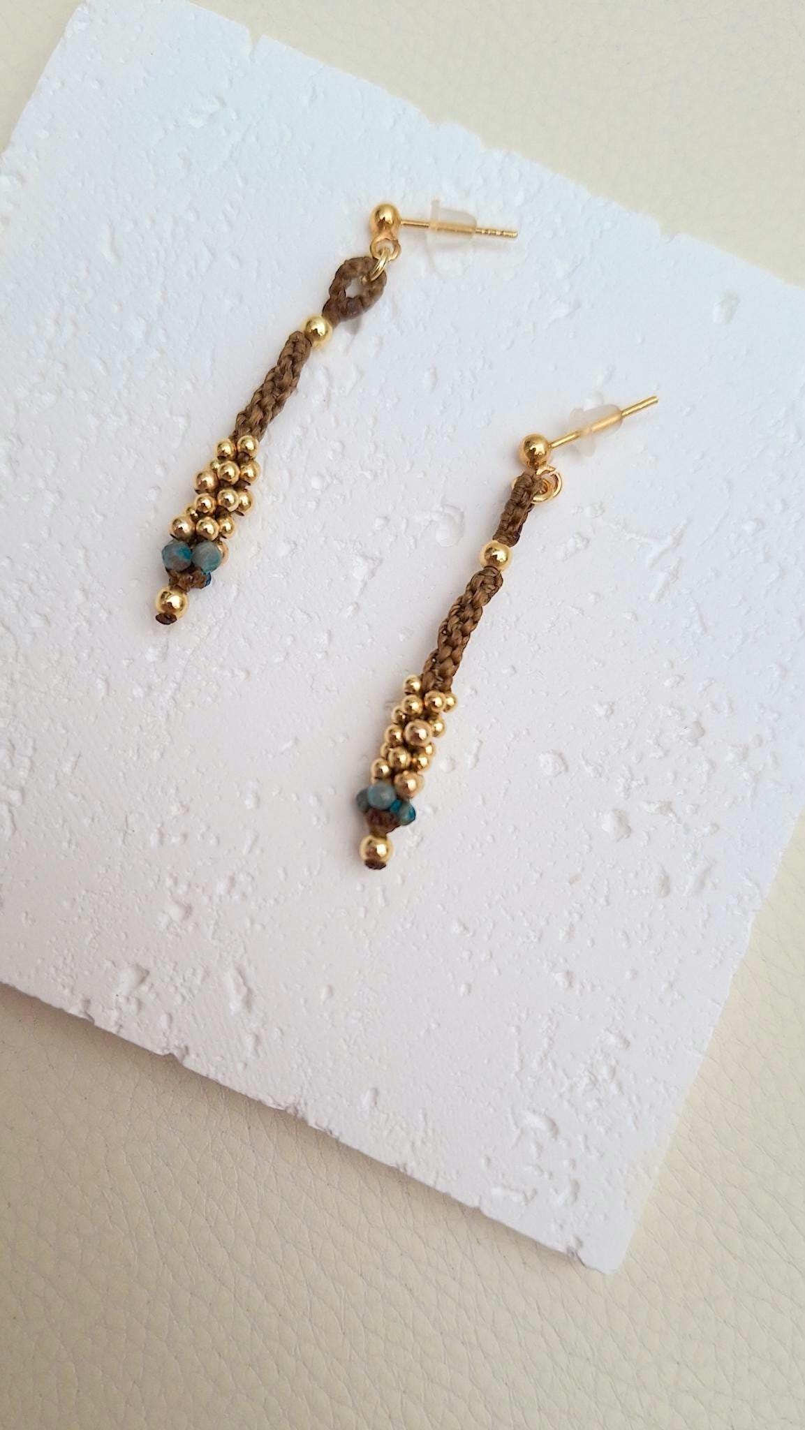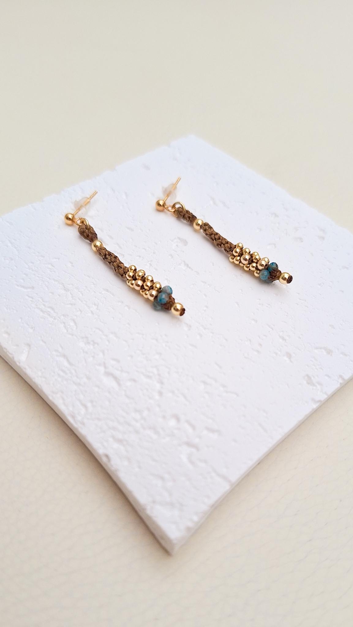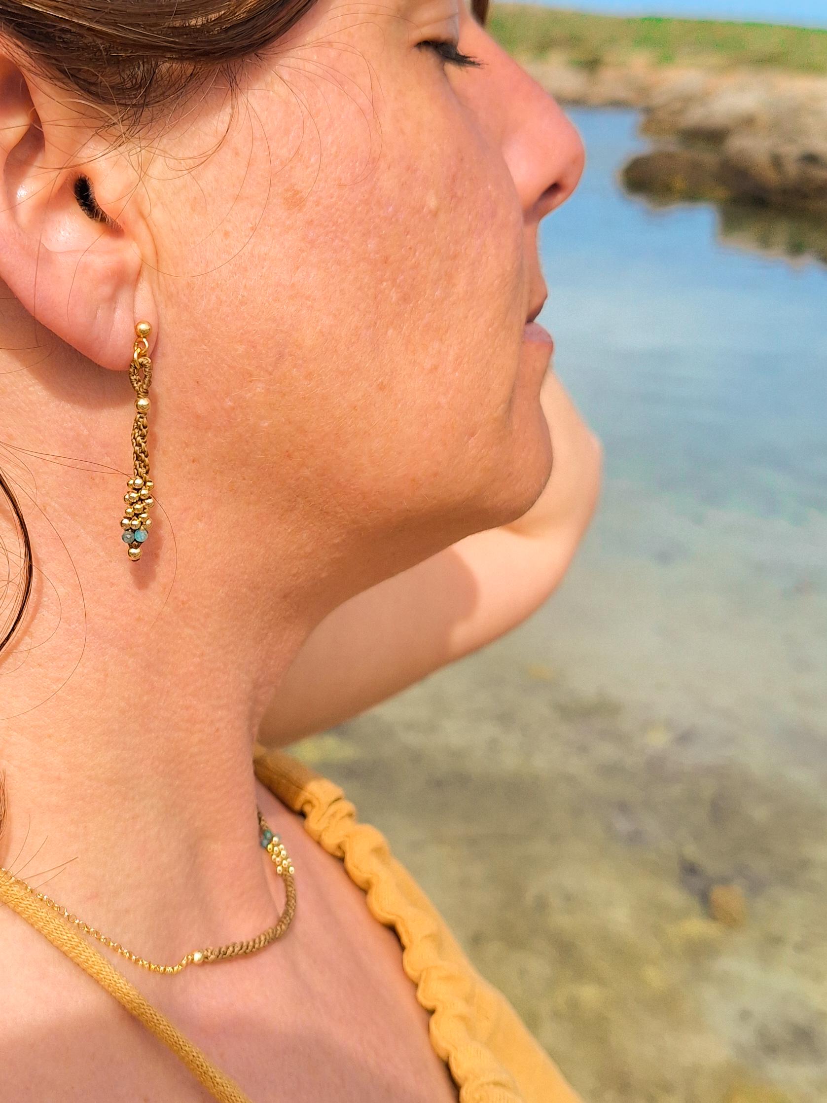 Long macramé earrings from the Marea Collection. These earrings are handmade using the macramé technique that gives shape and color, creating a unique design. The design is made with golden brown waxed thread, gold-plated sterling silver beads and Apatite stones. KALA Jewelry is created consciously and pampering every detail.