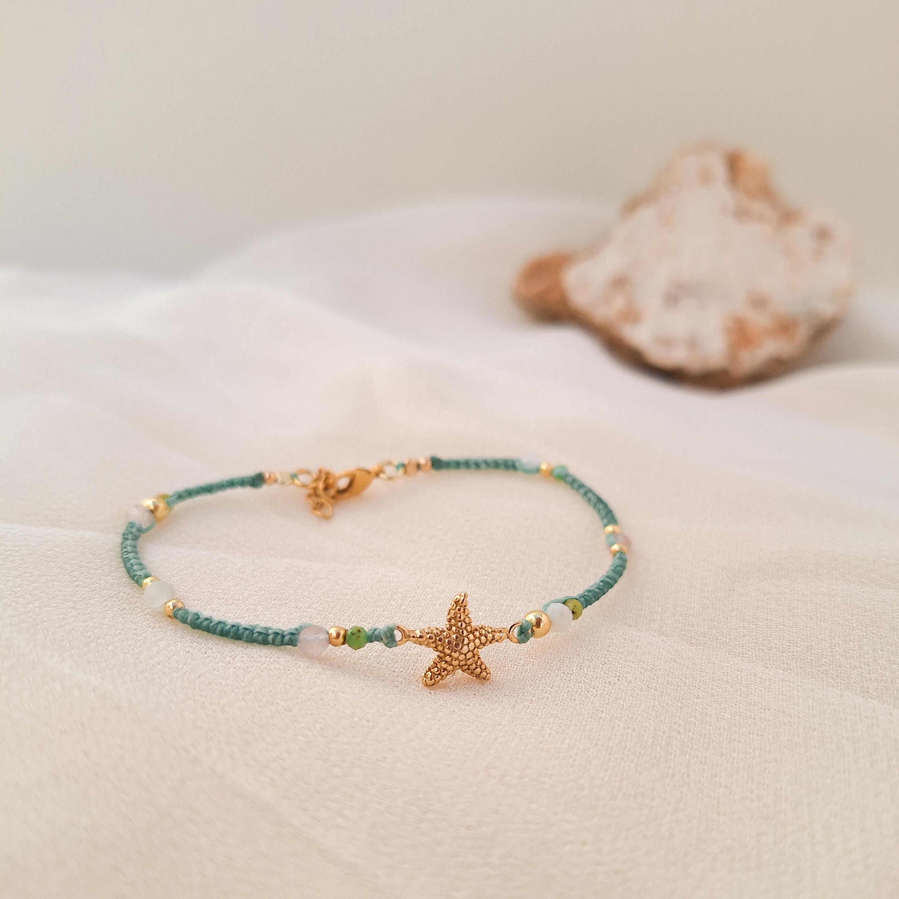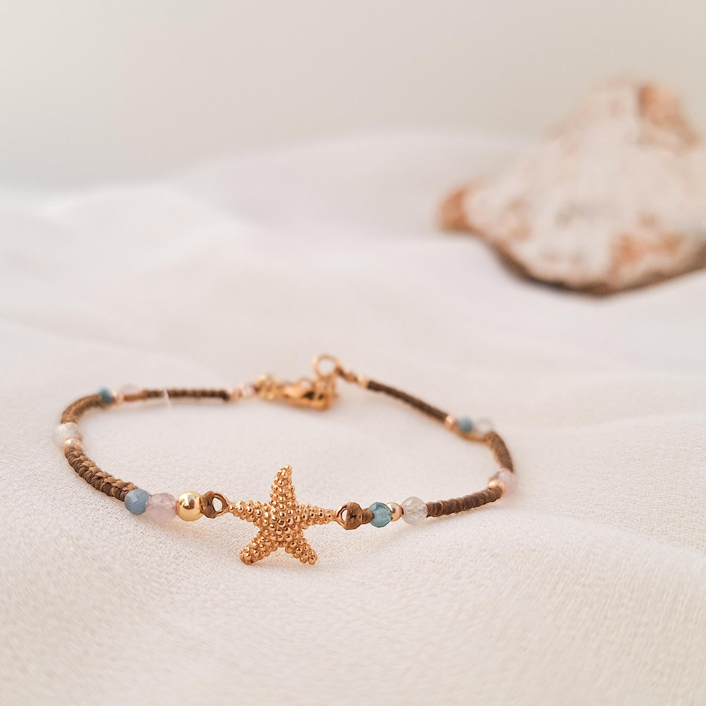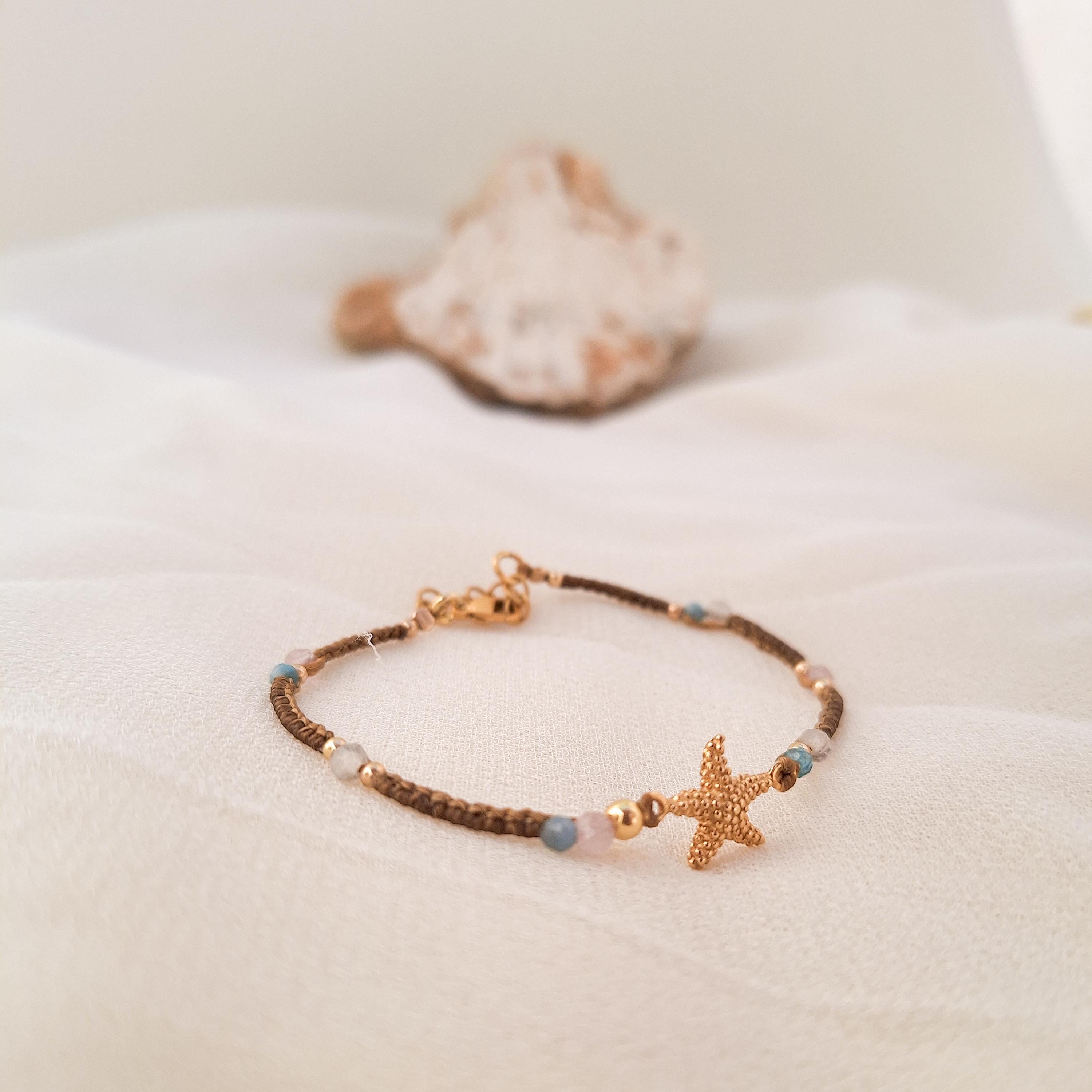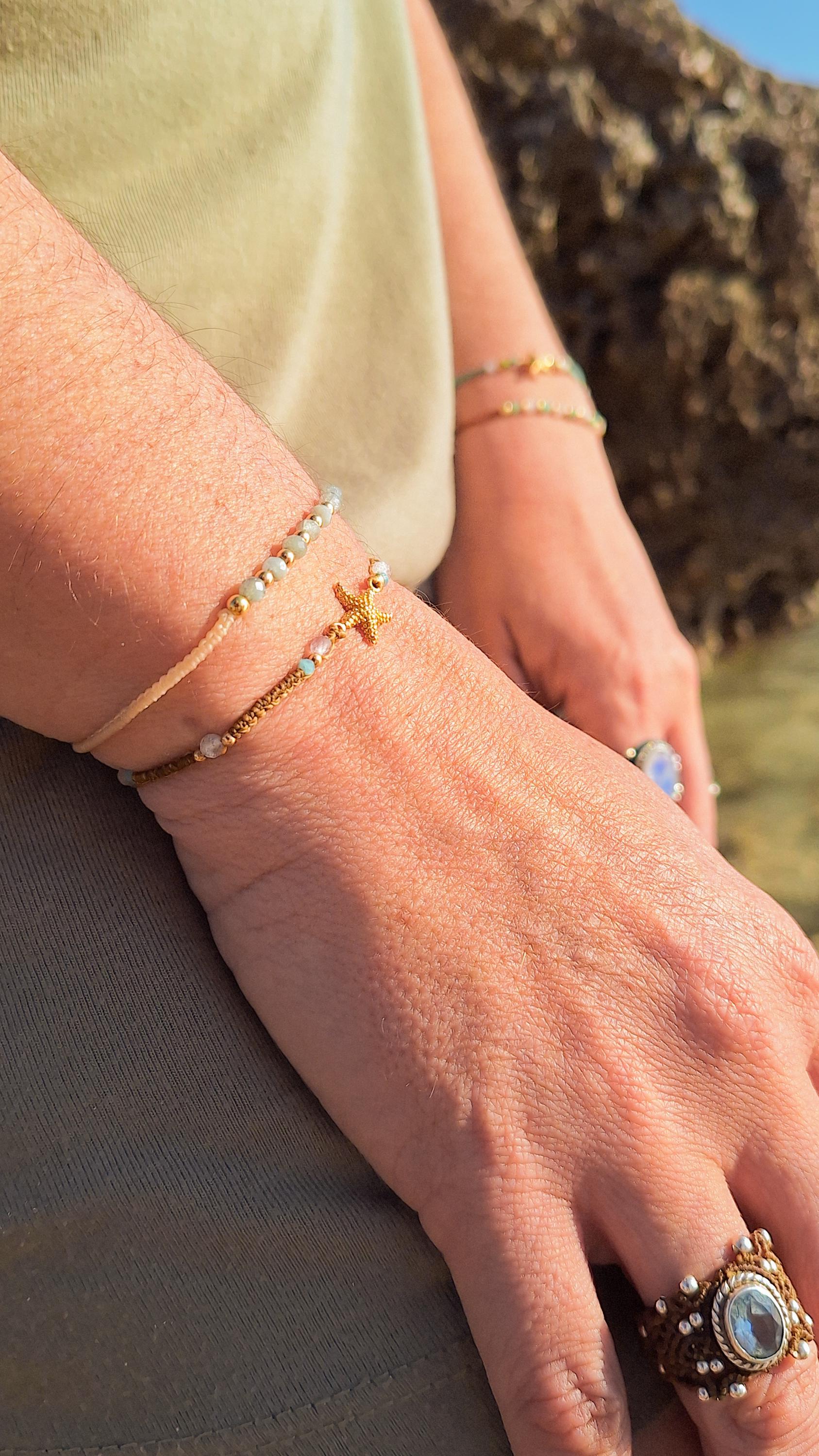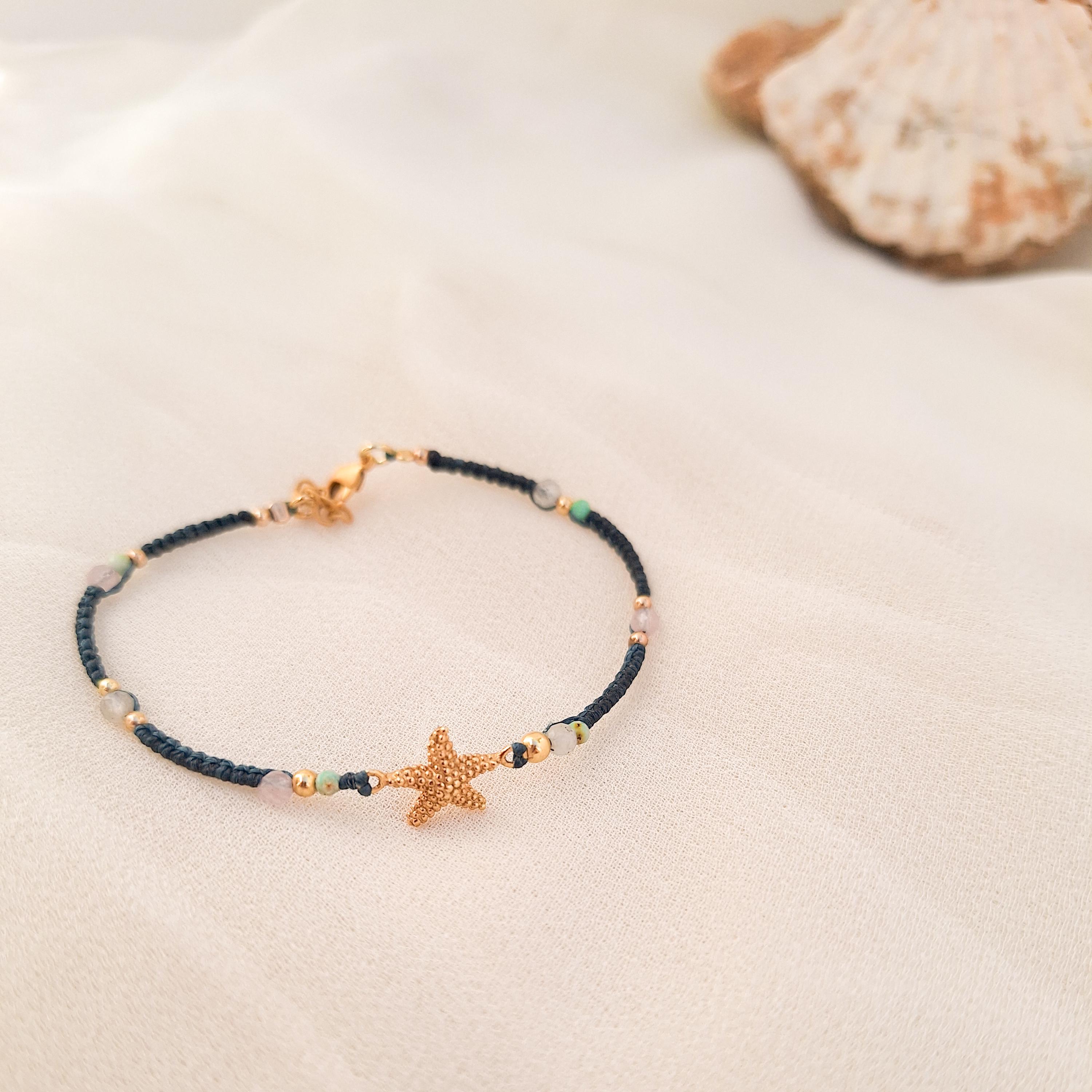 Starfish bracelet handmade using macramé technique, 18K gold-plated sterling silver, and natural stones.