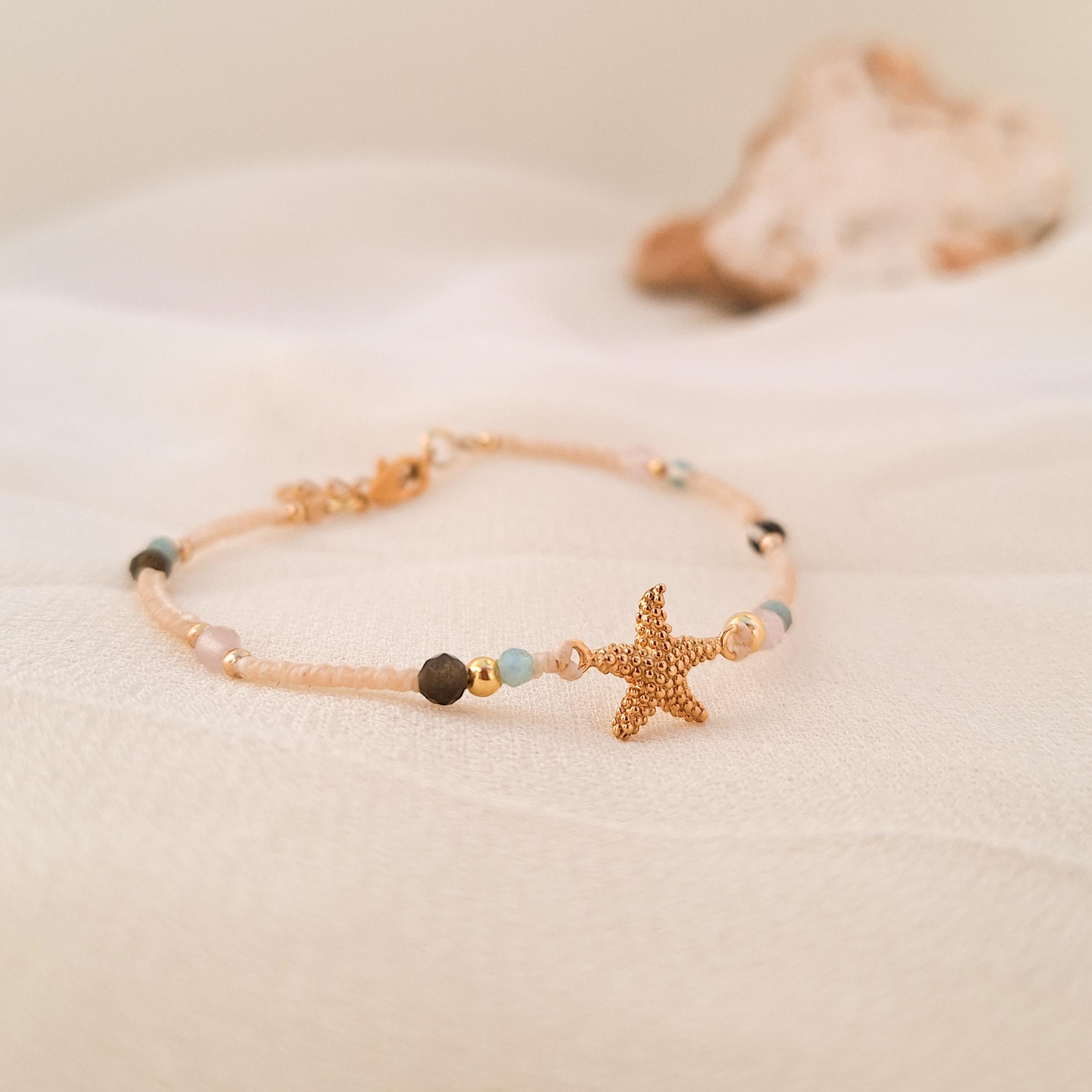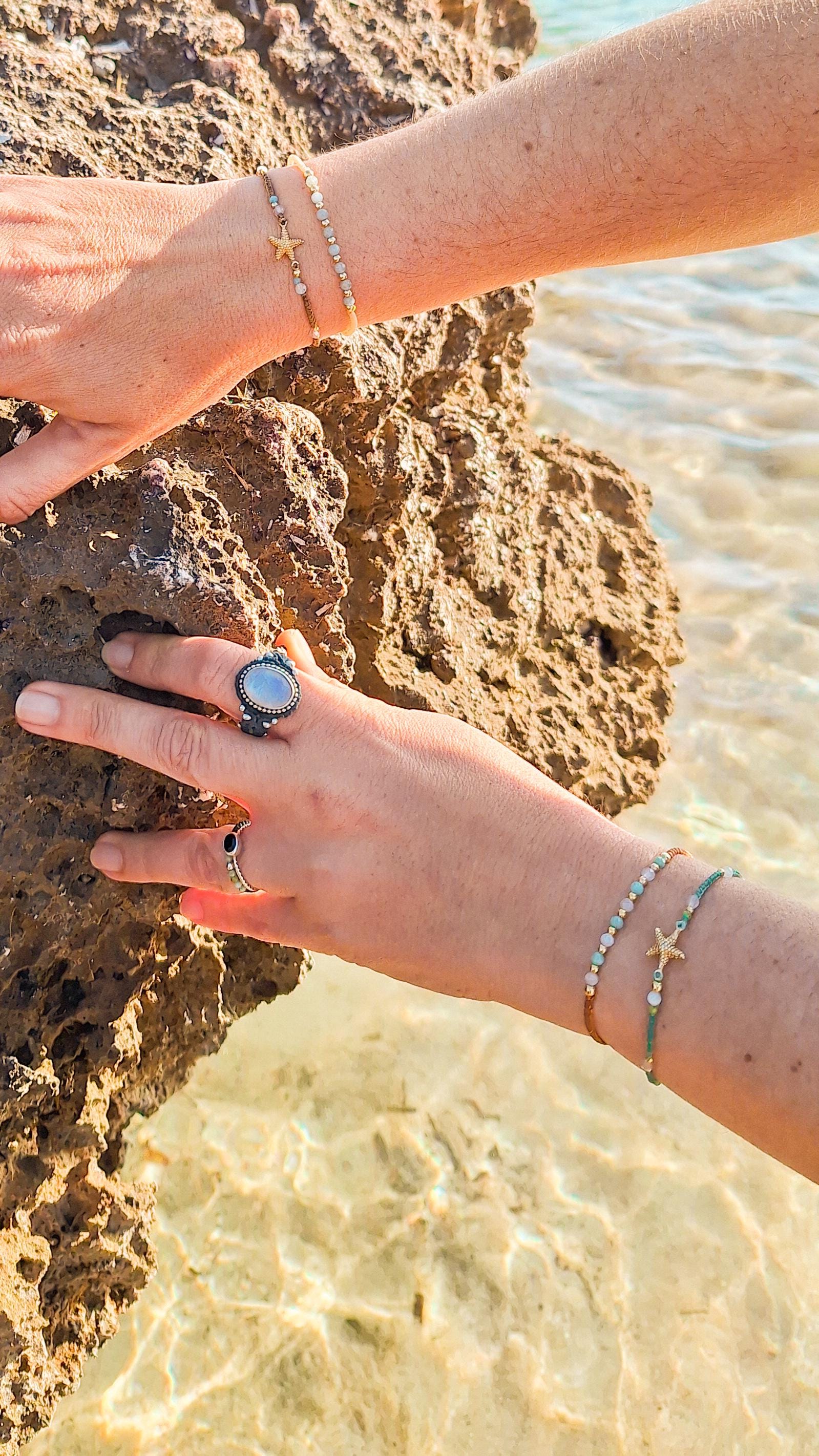 Inspired by the energy of the Mediterranean, this bracelet combines the beauty of a golden starfish with the harmony of natural stones such as Amazonite, Moonstone, Labradorite, Apatite, and Golden Obsidian. Available in five color combinations, each carefully designed with the stones that best complement each other. It is a delicate and versatile piece, ideal for wearing alone or layering with other fine bracelets. It closes with an extension chain.