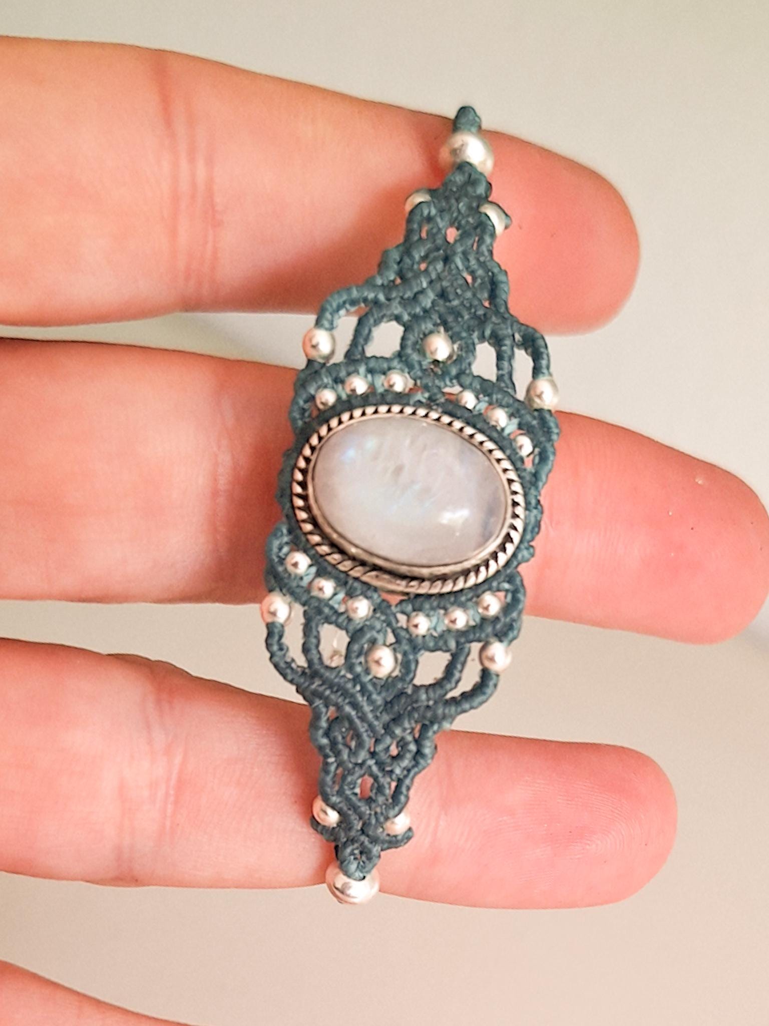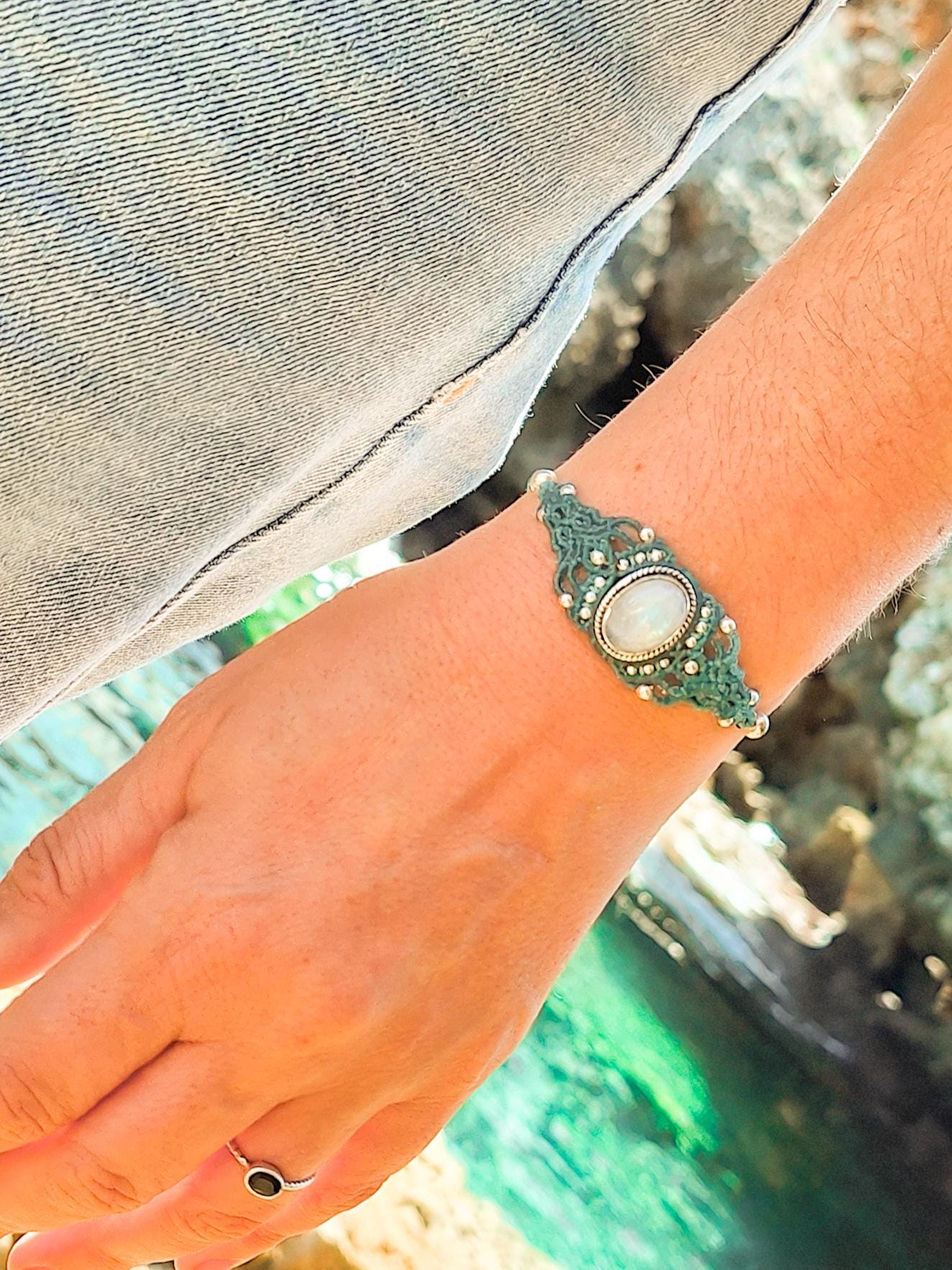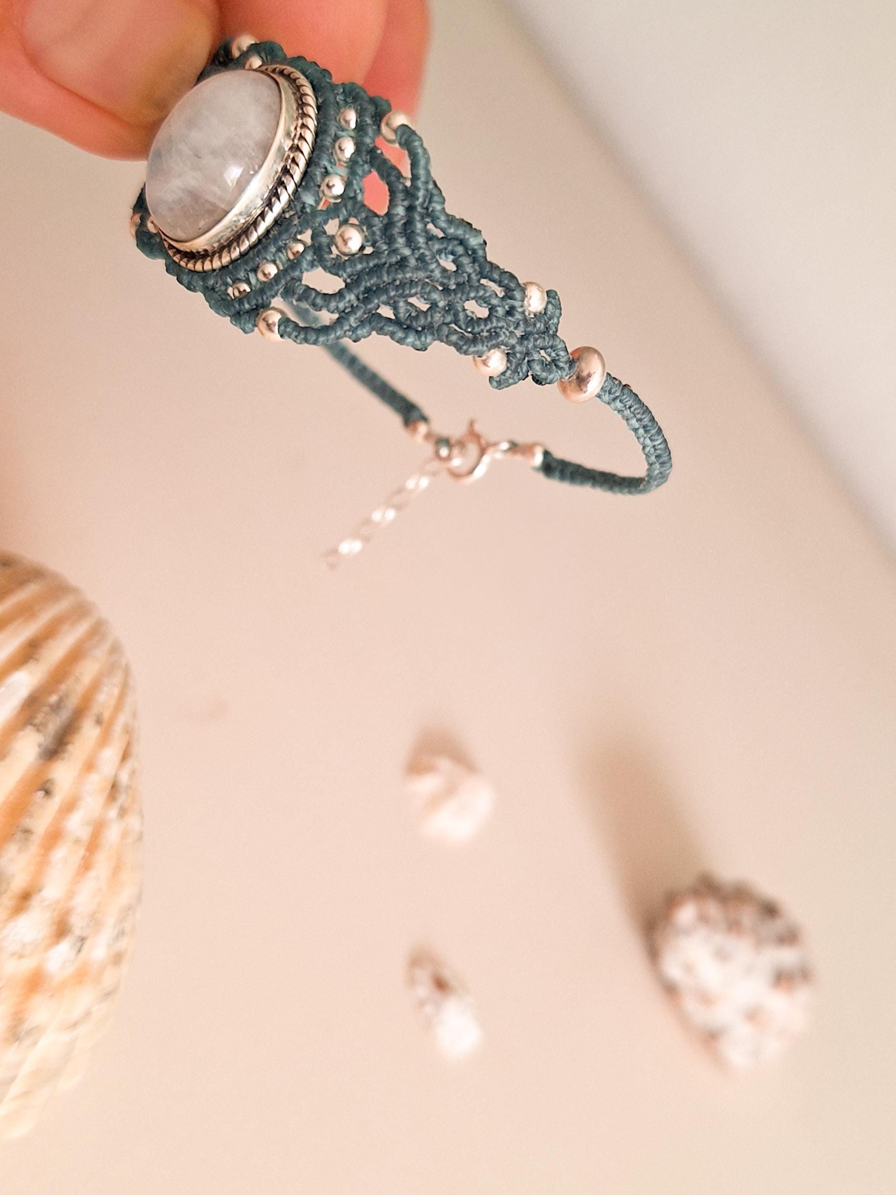 Natural Moonstone bracelet from the Isla Collection. This piece of jewelry is handmade using the macramé technique, which adds shape and color, creating a unique design. The design is crafted with an oval-shaped Larimar stone set in silver, turquoise waxed thread, and sterling silver beads. KALA jewelry is consciously created with attention to detail.