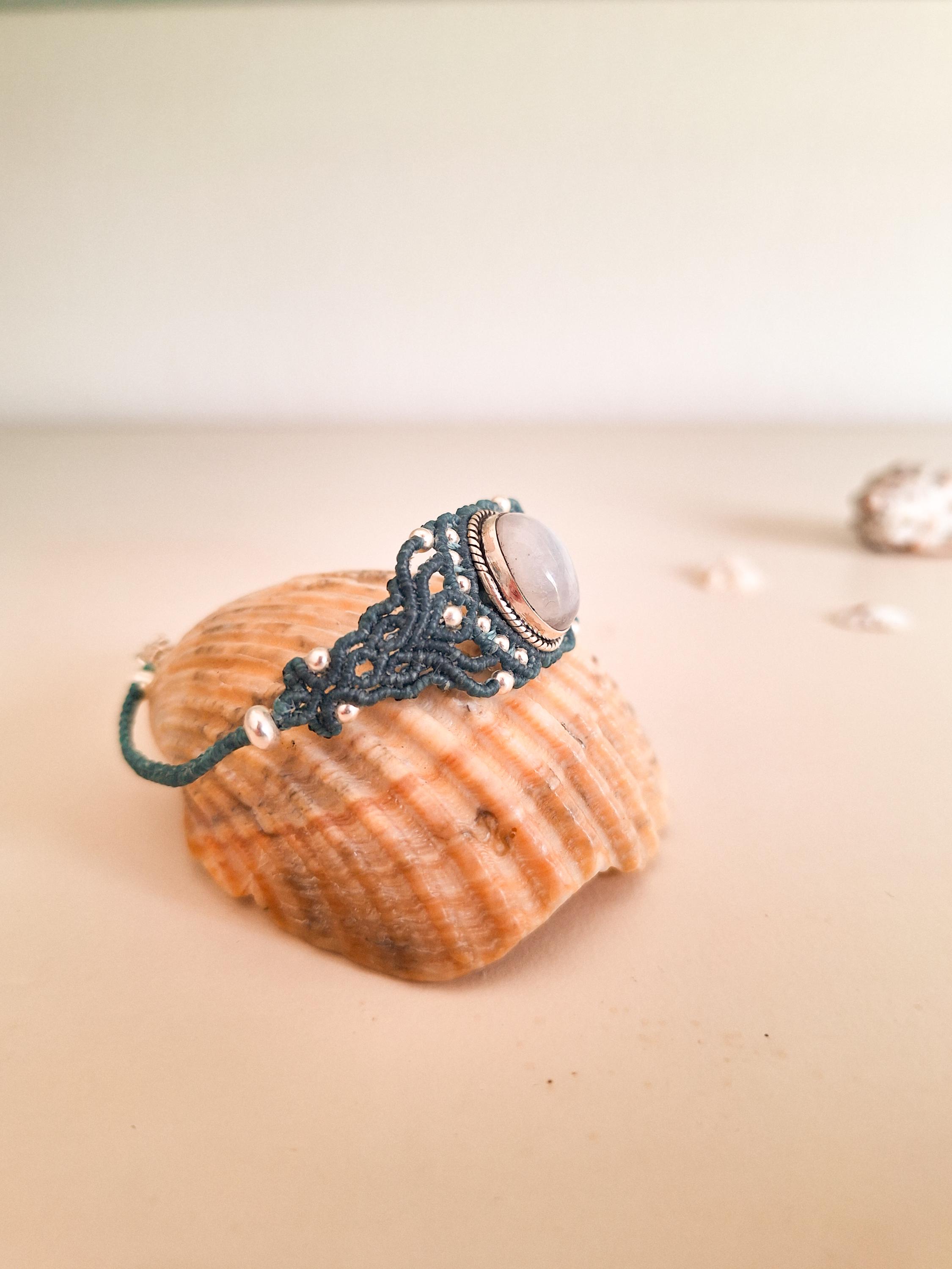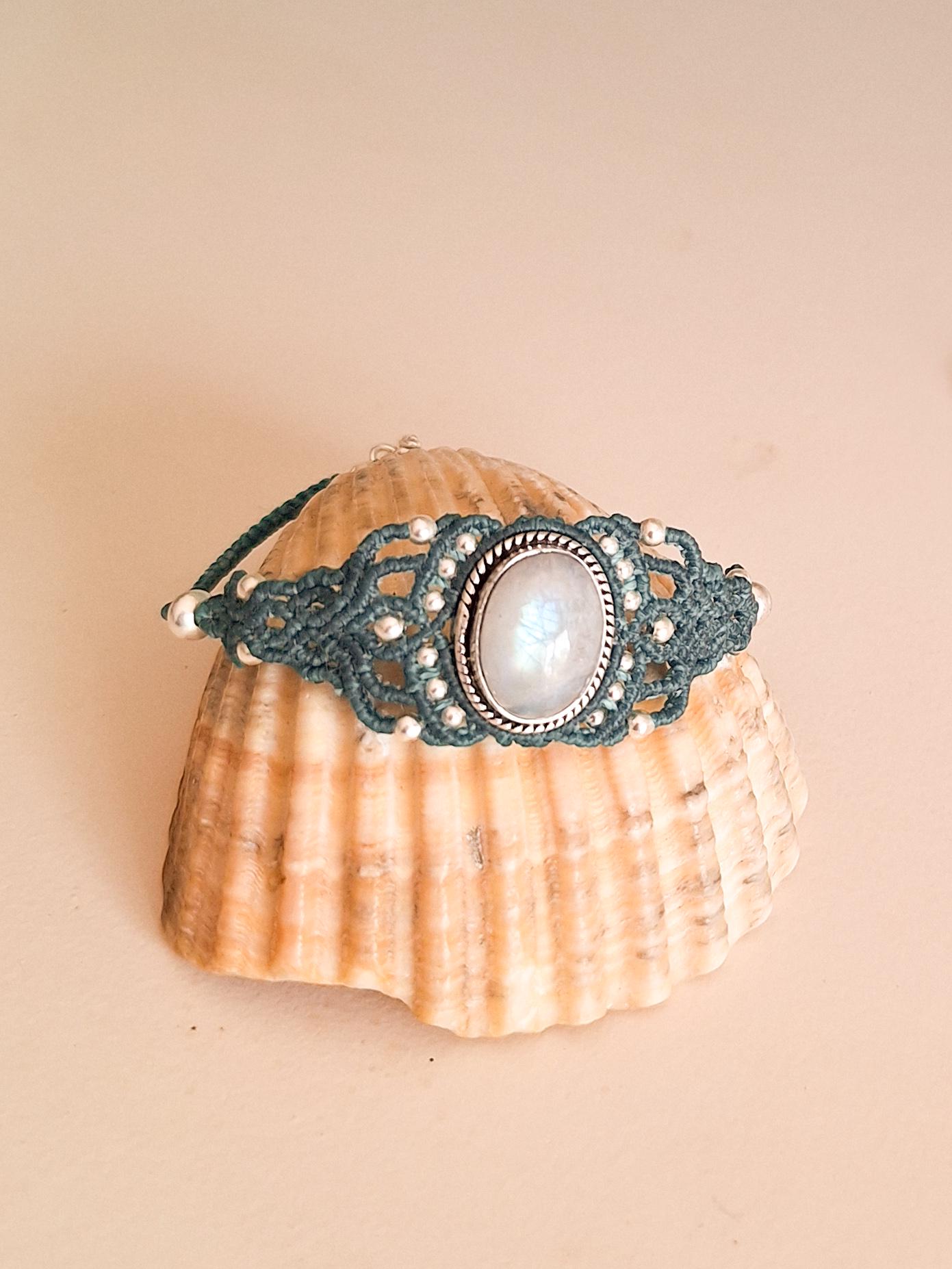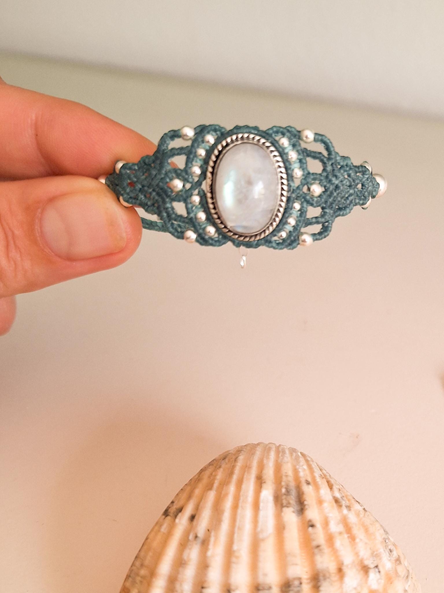 Natural Moonstone bracelet from the Isla Collection. This piece of jewelry is handmade using the macramé technique, which adds shape and color, creating a unique design. The design is crafted with an oval-shaped Larimar stone set in silver, turquoise waxed thread, and sterling silver beads. KALA jewelry is consciously created with attention to detail.