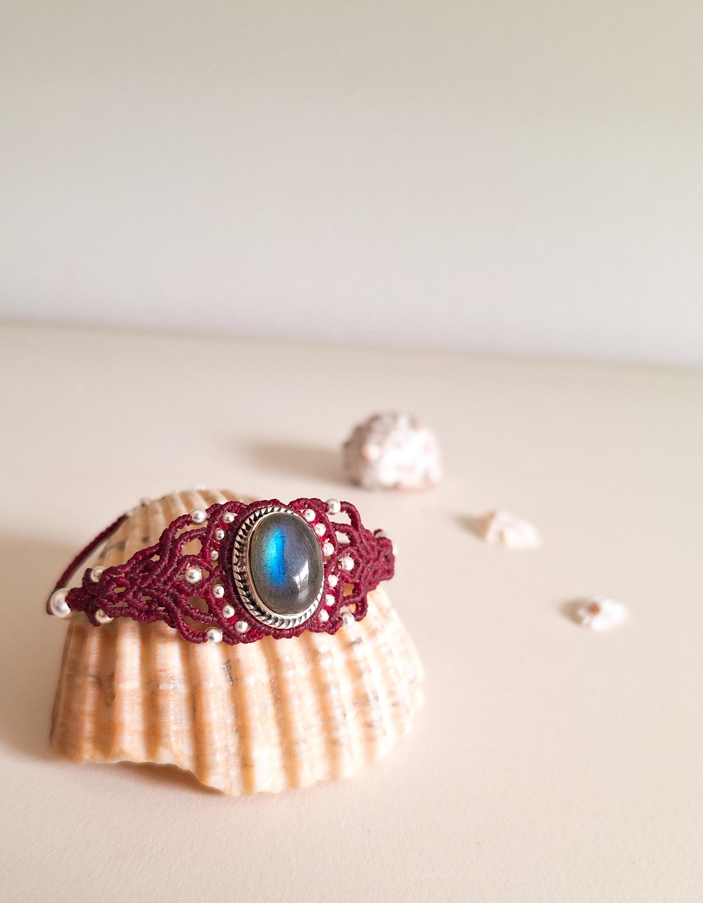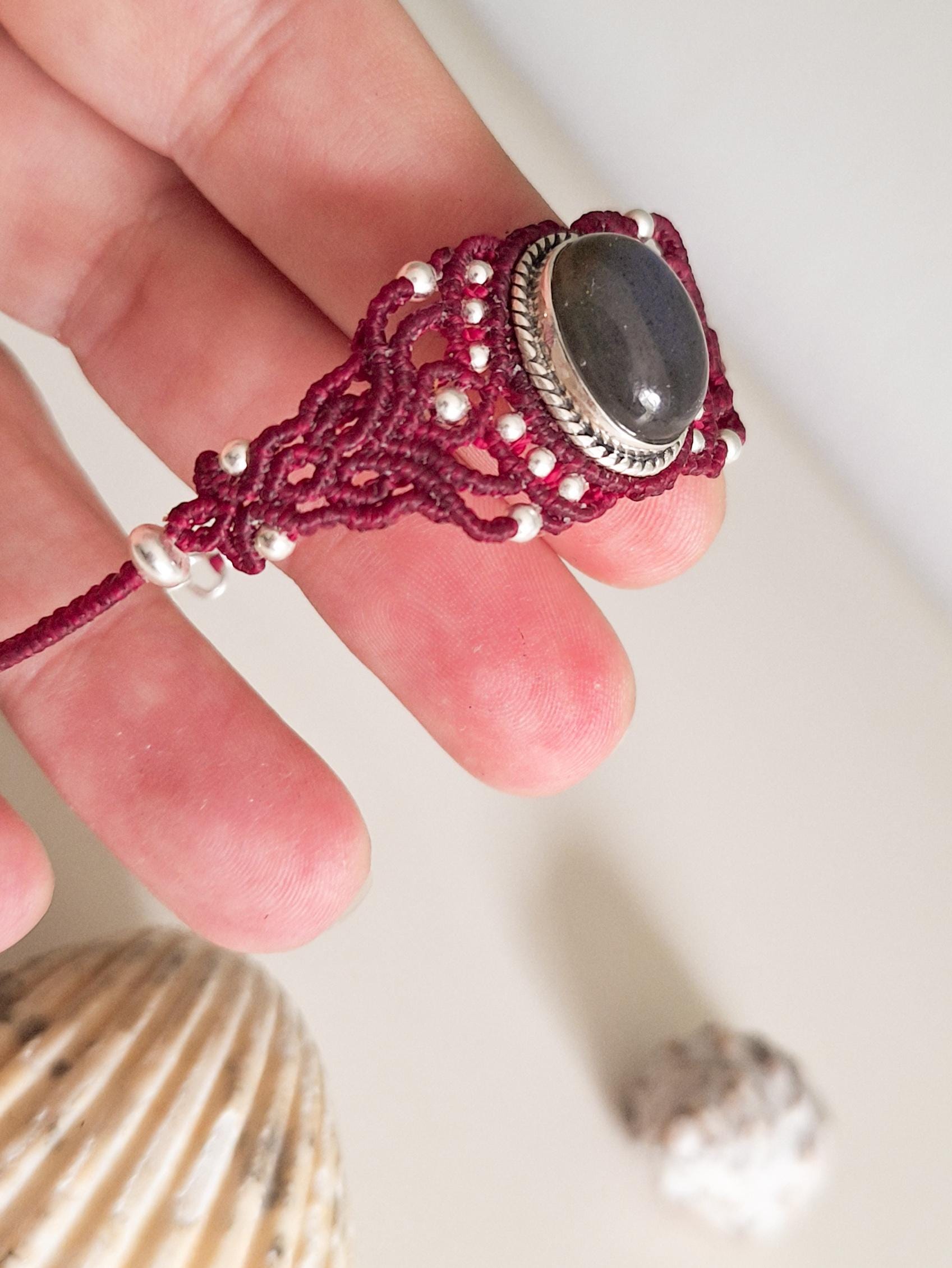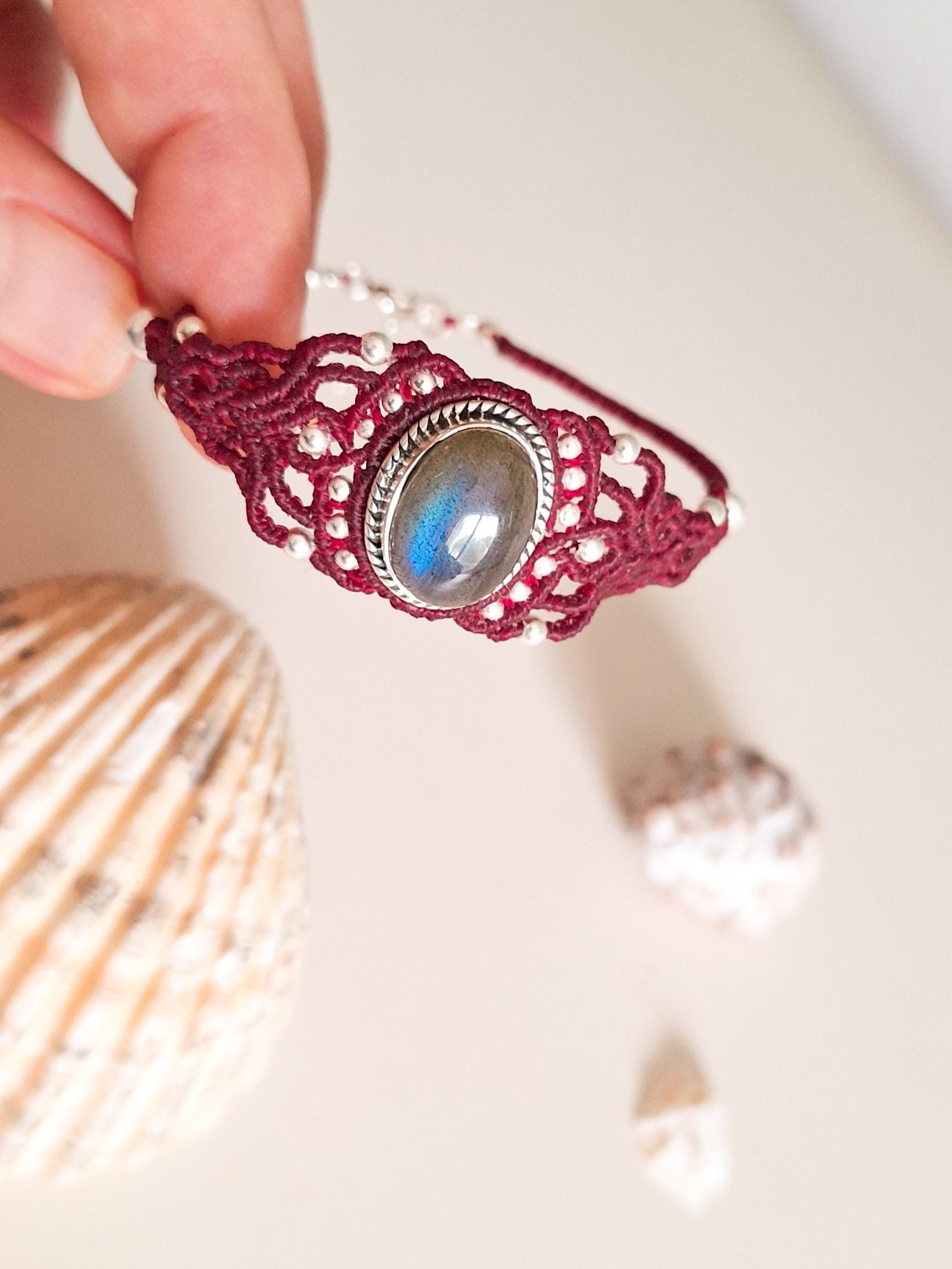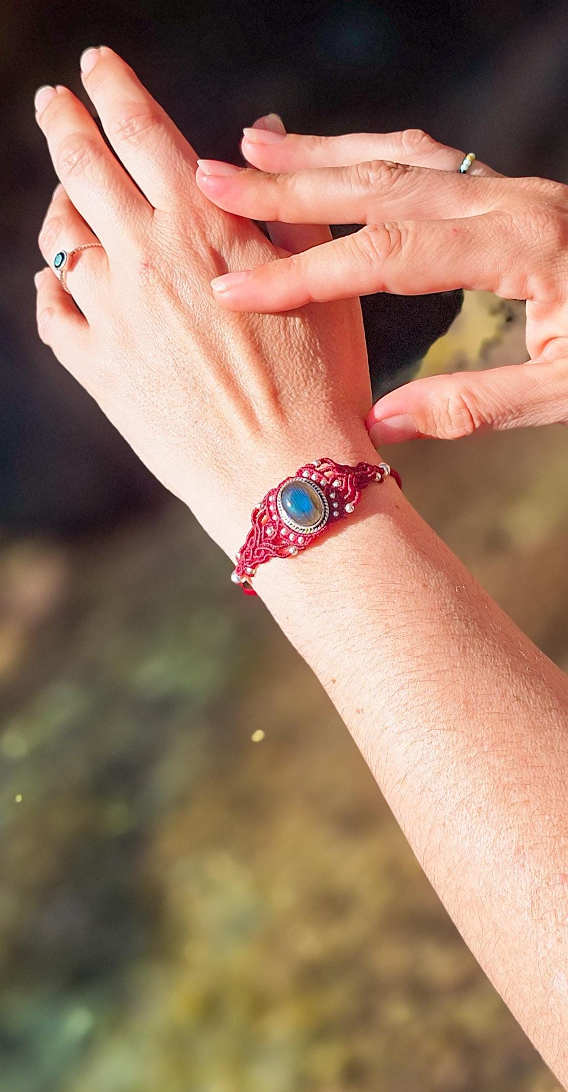 Bracelet with natural labradorite from the Isla Collection. This piece of jewelry is handmade using the macramé technique, which adds shape and color, creating a unique design. The design is crafted with an oval-shaped Larimar stone set in silver, cherry red or dark turquoise waxed thread, and sterling silver beads. KALA jewelry is consciously created with attention to detail.