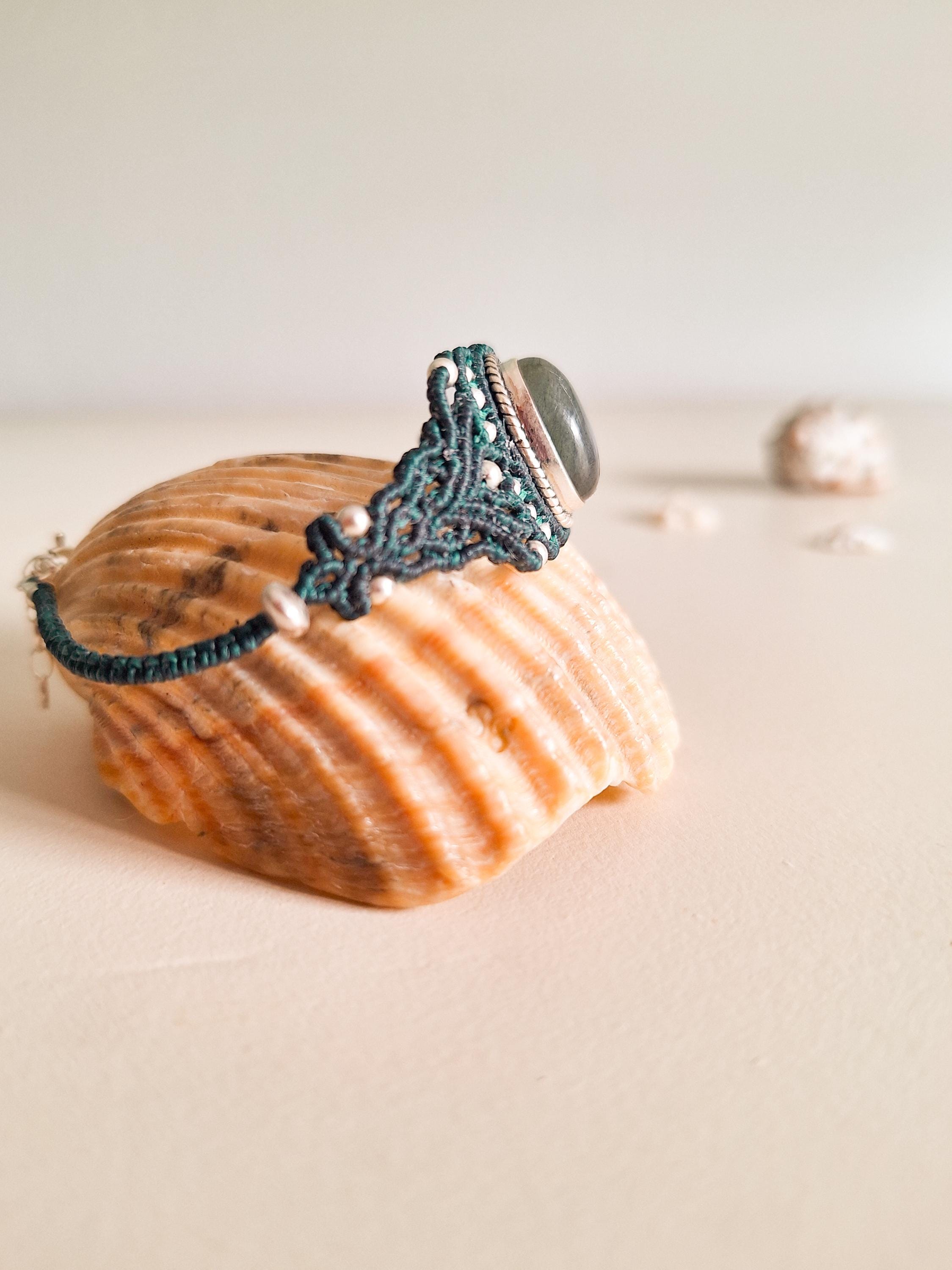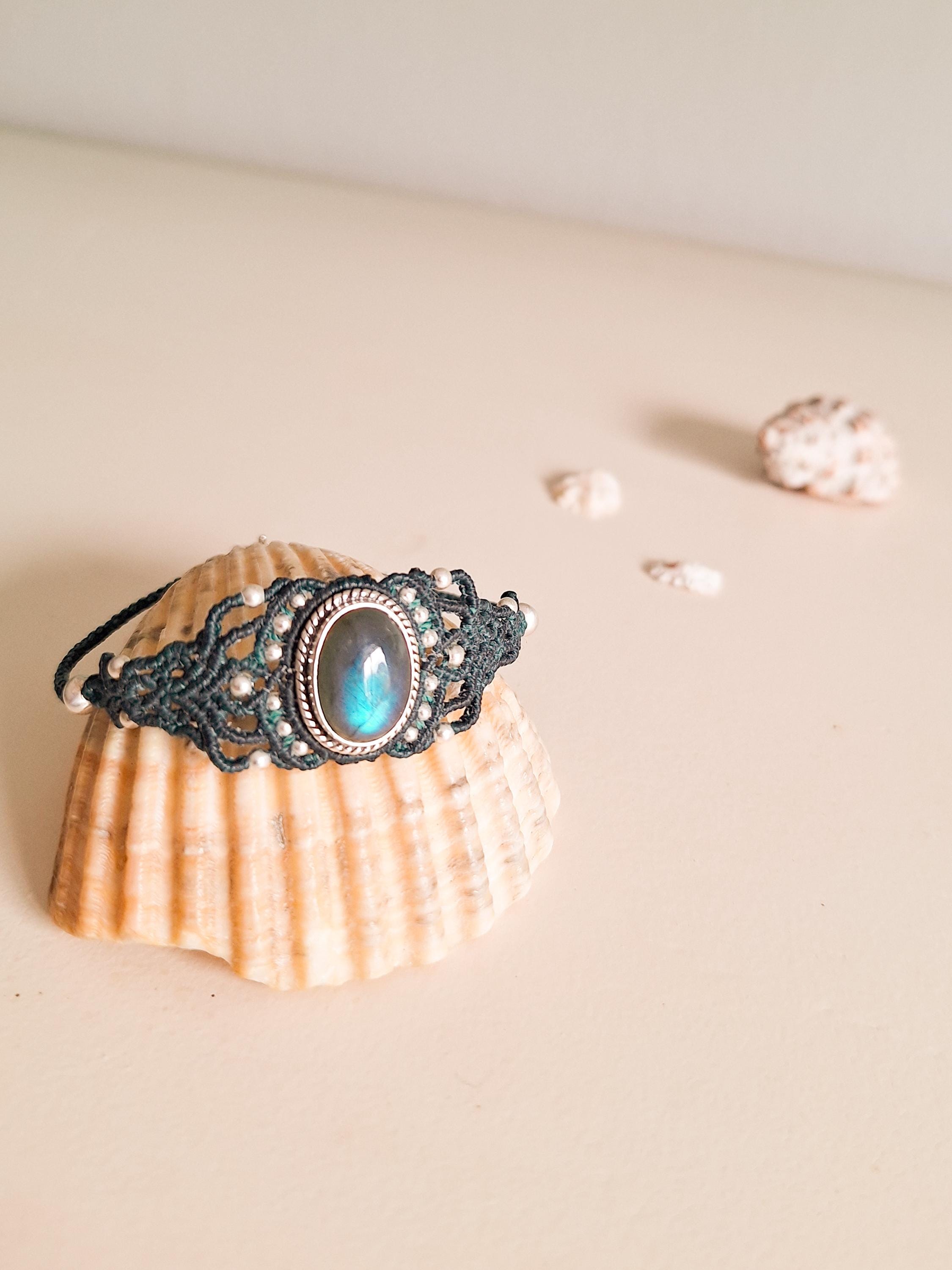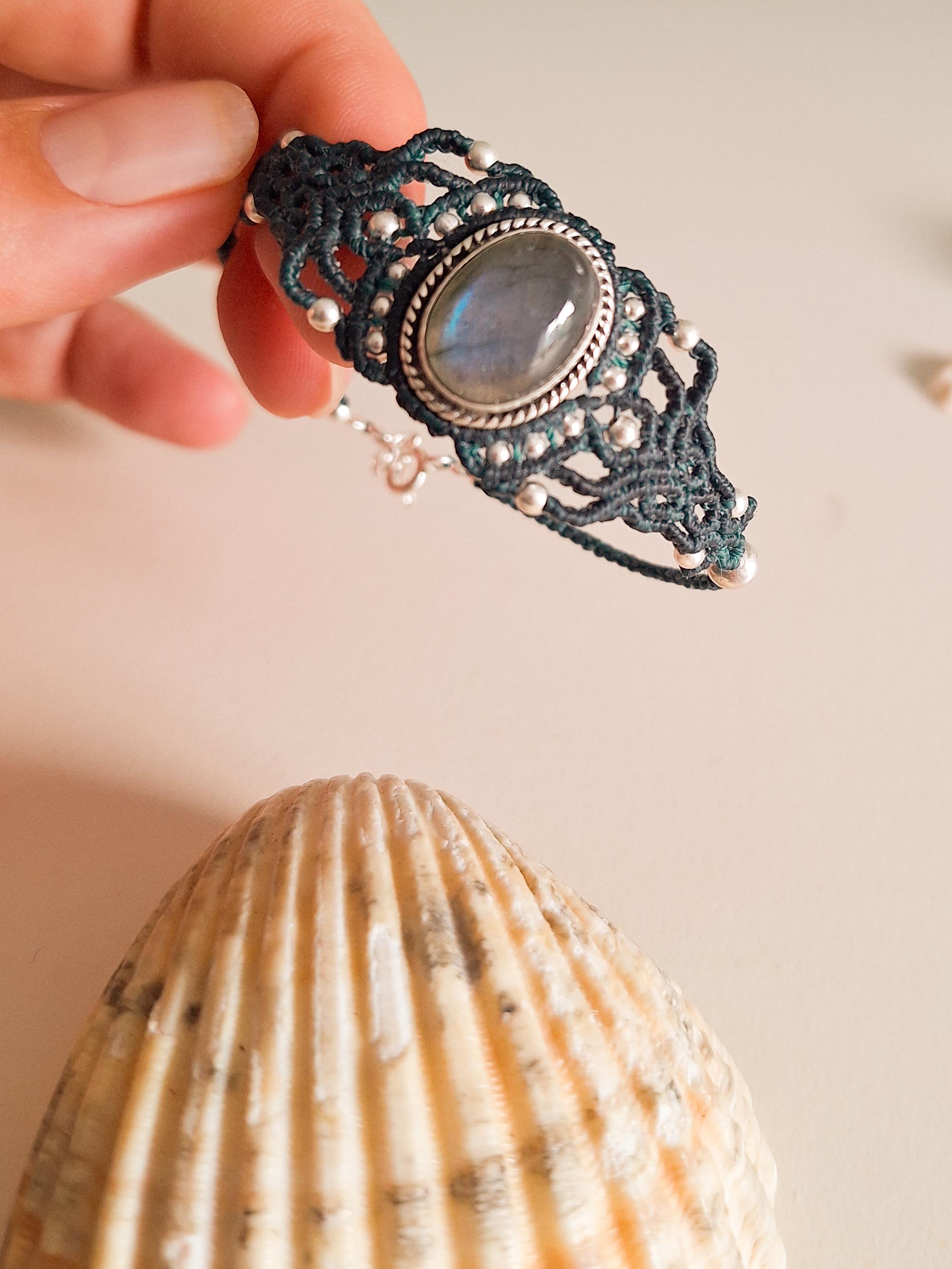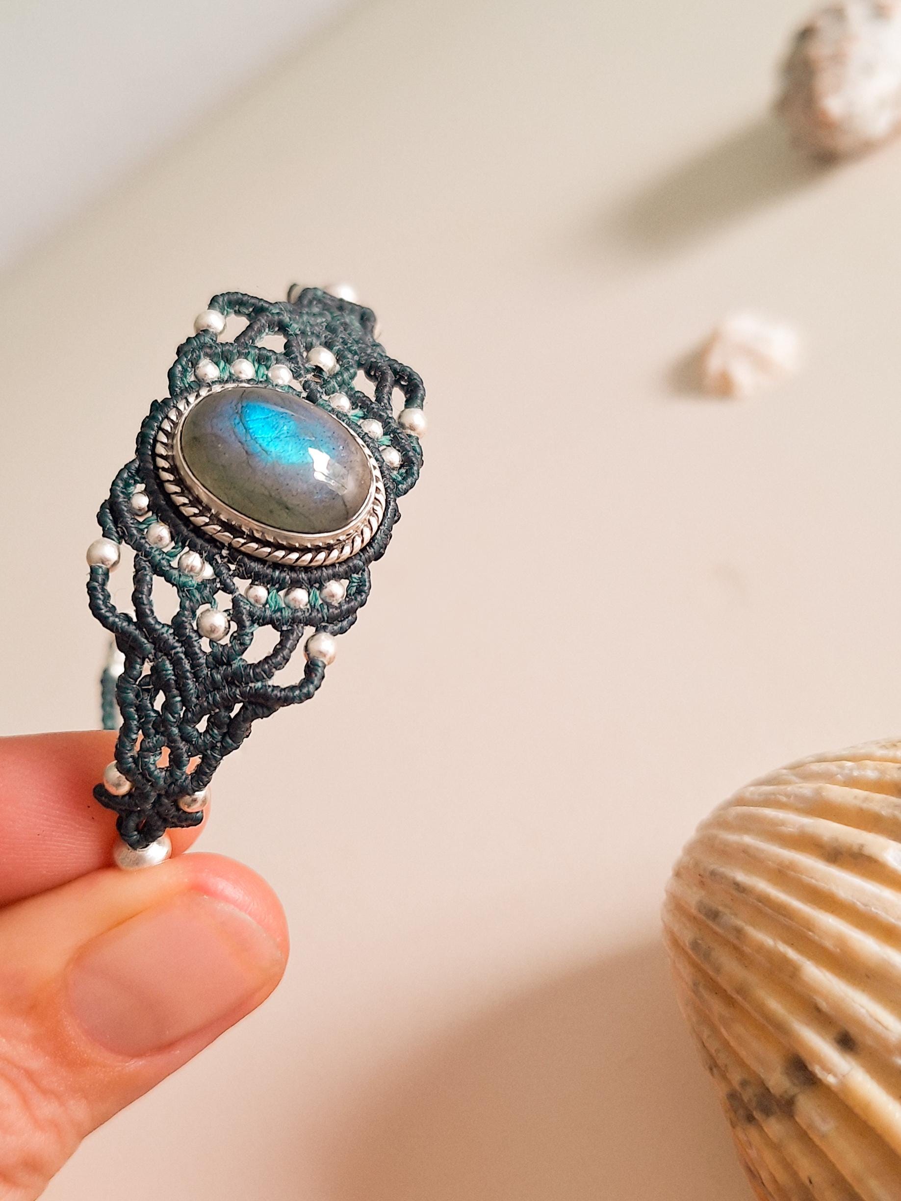 Bracelet with natural labradorite from the Isla Collection. This piece of jewelry is handmade using the macramé technique, which adds shape and color, creating a unique design. The design is crafted with an oval-shaped Larimar stone set in silver, cherry red or dark turquoise waxed thread, and sterling silver beads. KALA jewelry is consciously created with attention to detail.