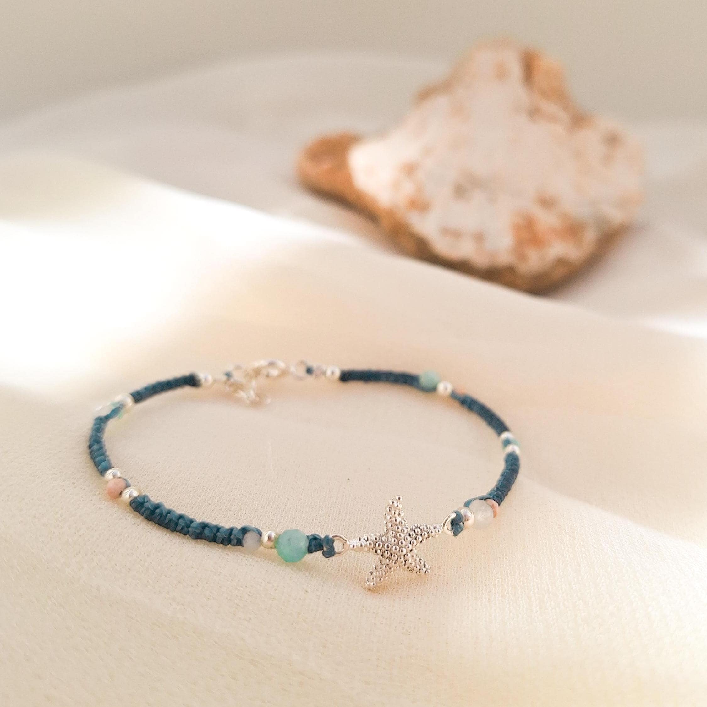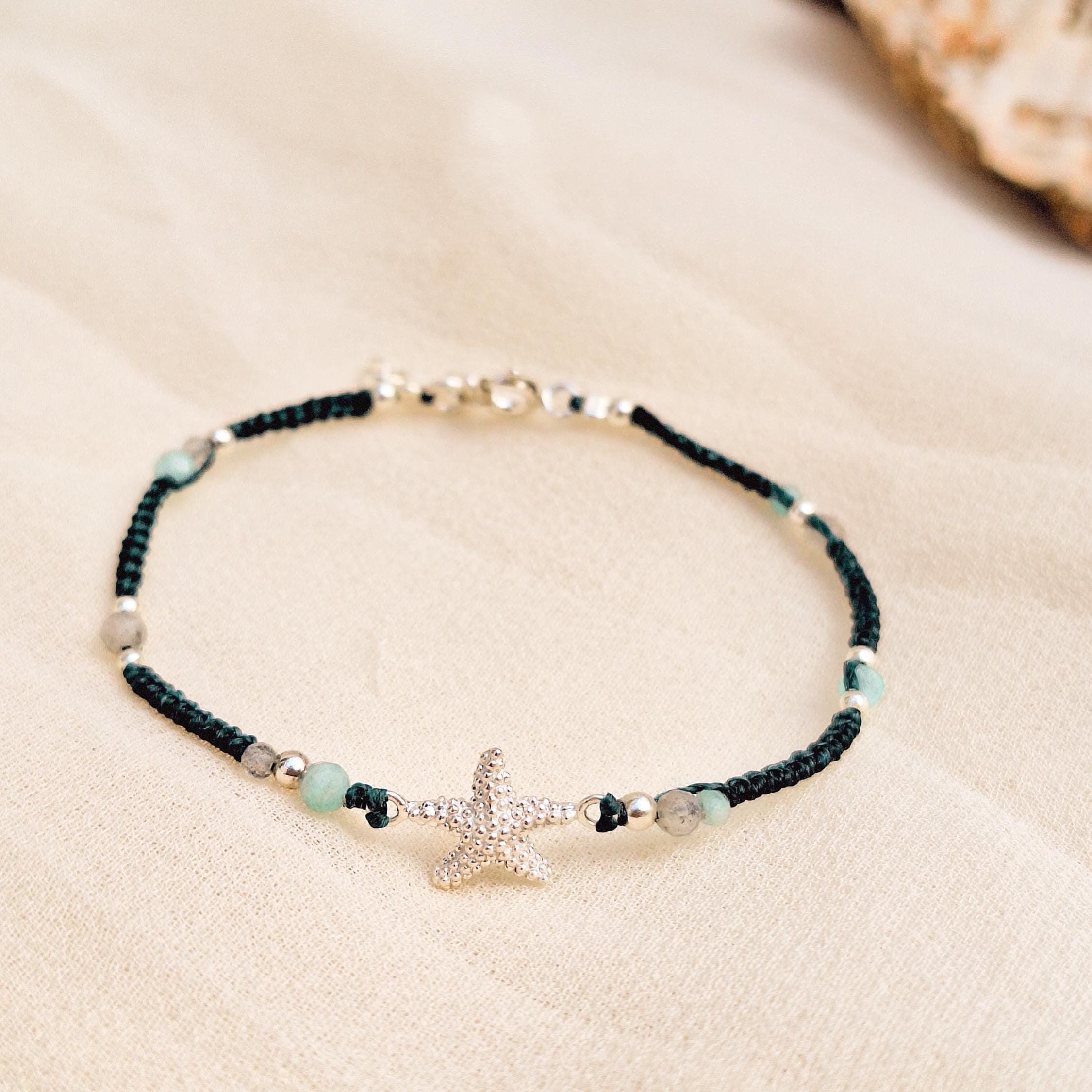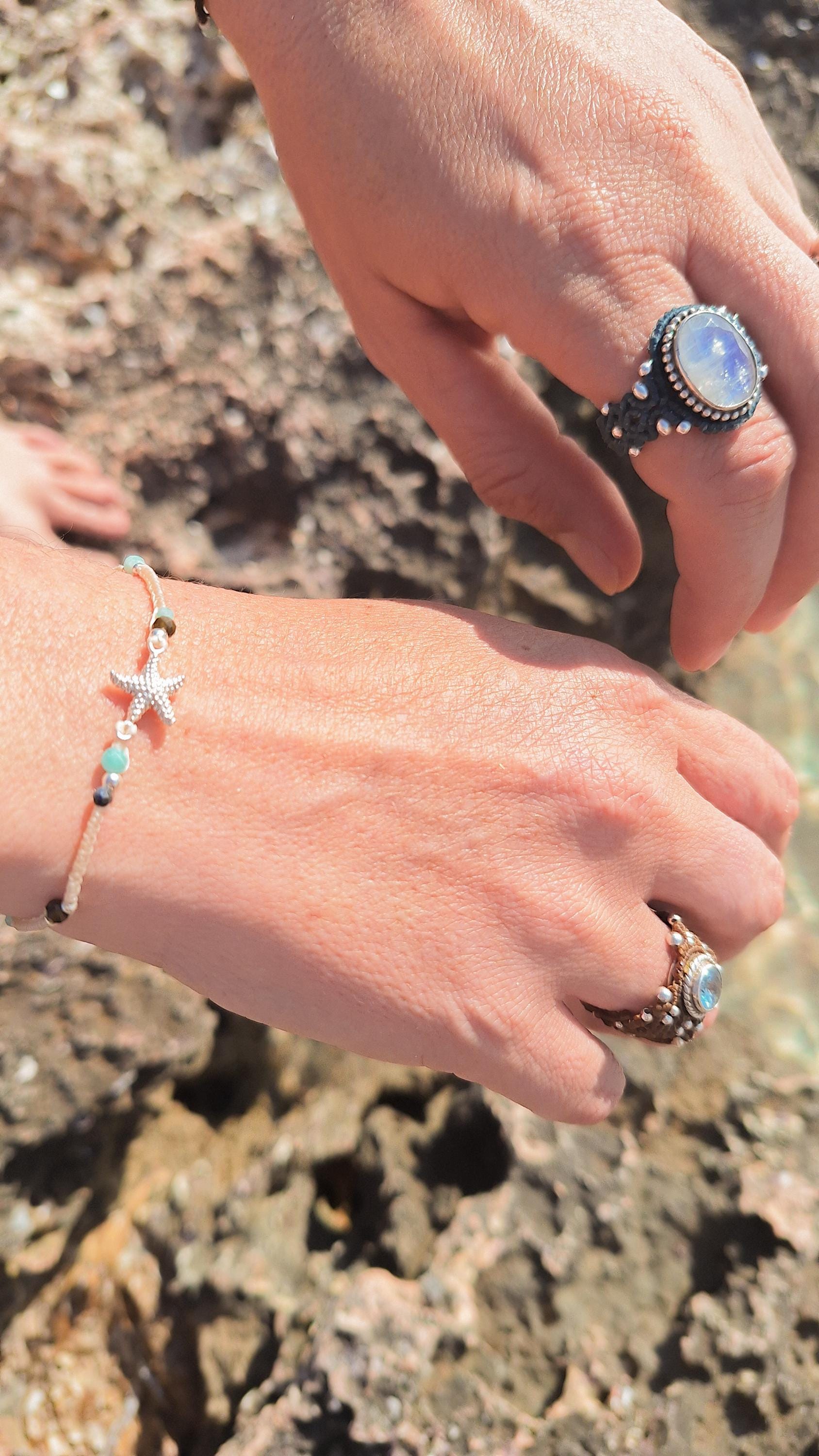 Starfish bracelet handmade with macramé technique, sterling silver and natural stones.