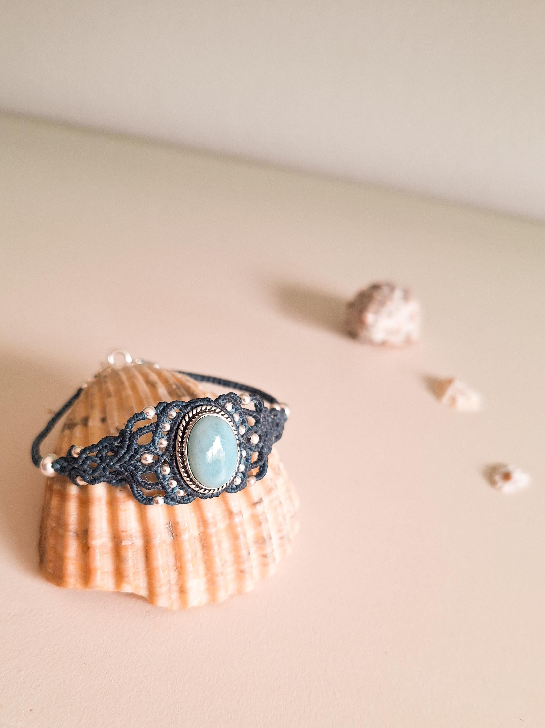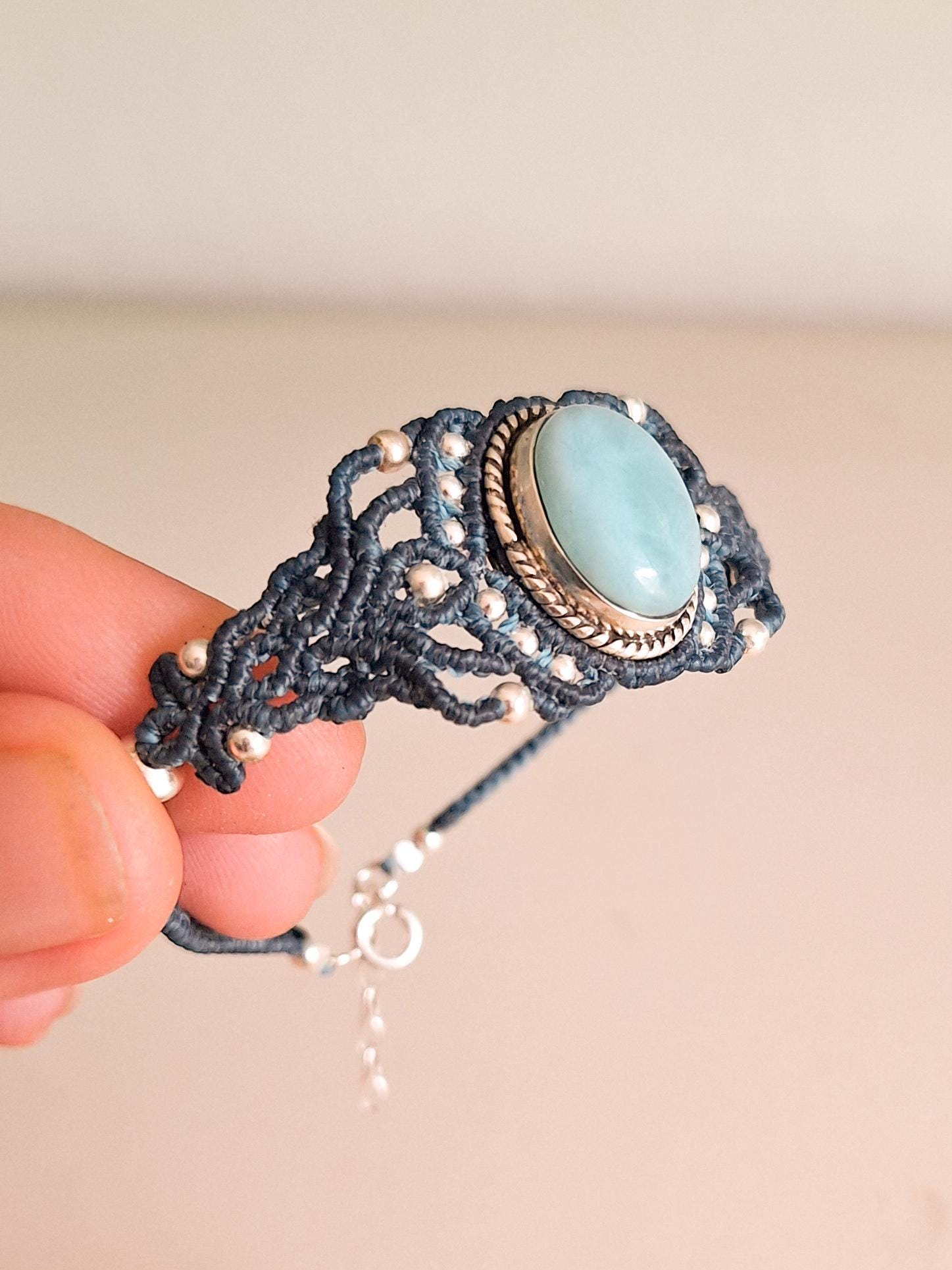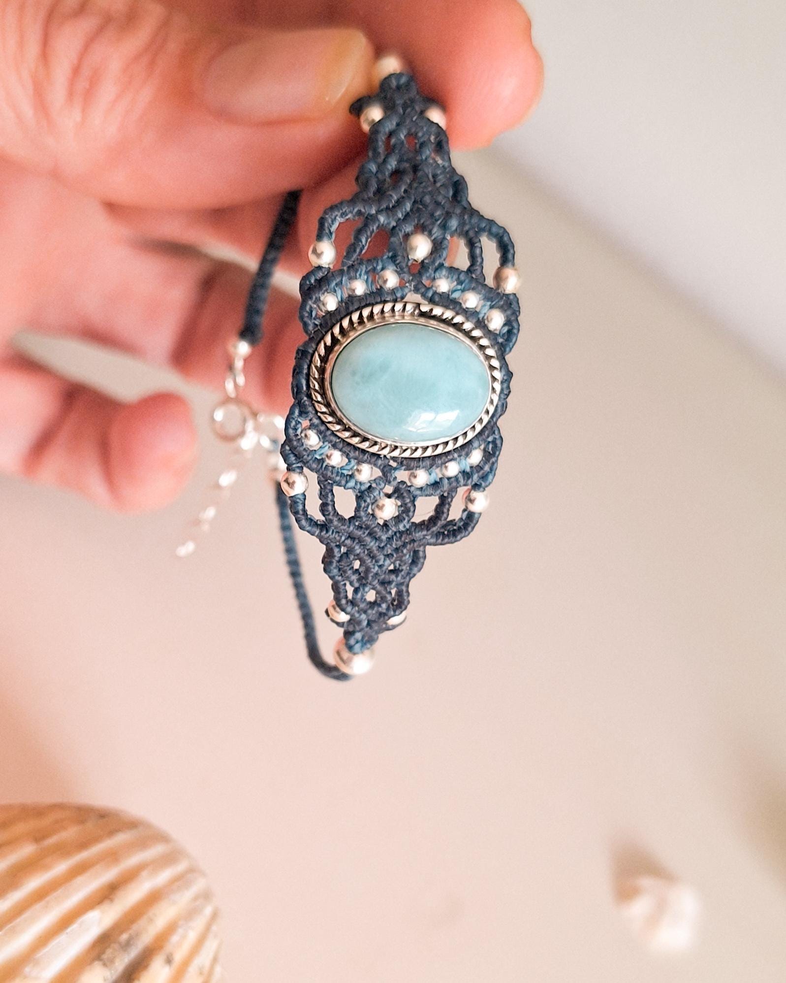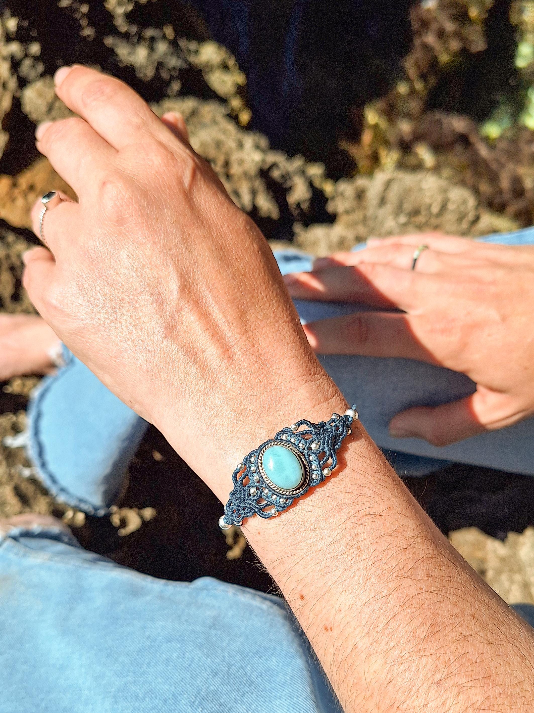 Bracelet with natural Larimar from the Isla Collection. This piece of jewelry is handmade using the macramé technique that adds shape and color, creating a unique design. The design is crafted with an oval-shaped Larimar stone set in silver, petrol-blue waxed thread, and sterling silver beads. KALA jewelry is consciously created with attention to detail.