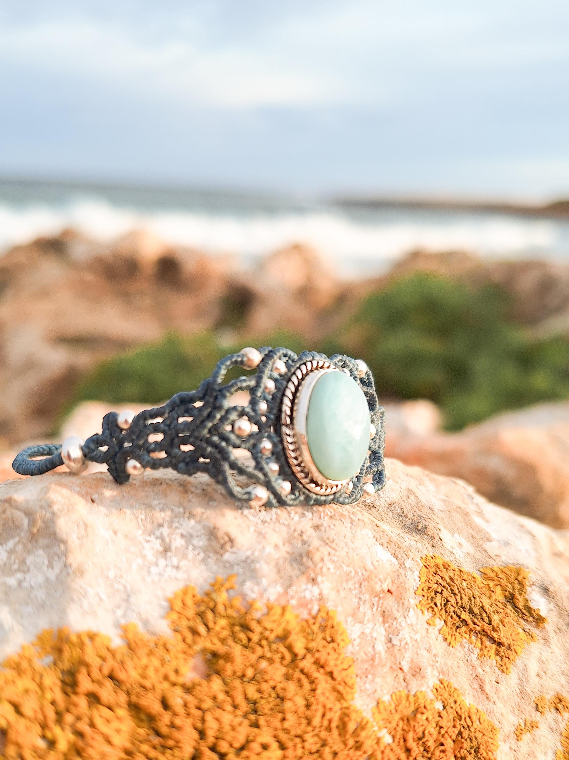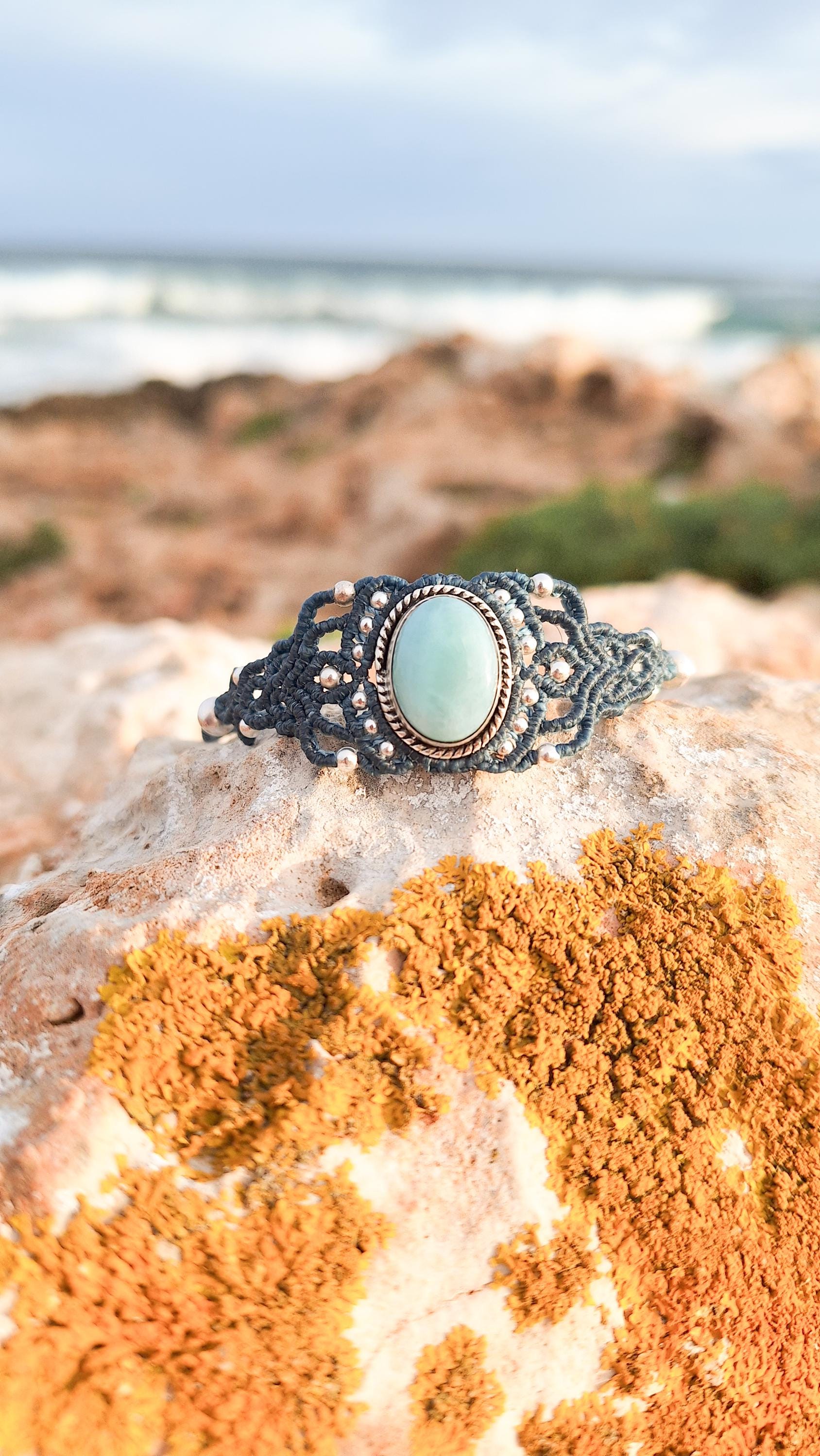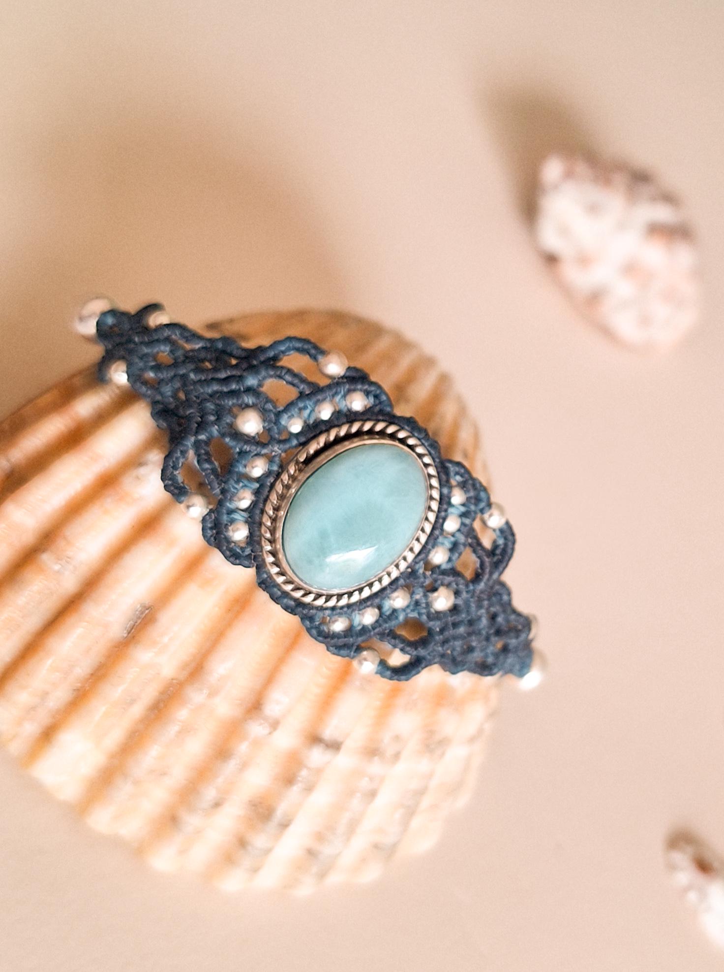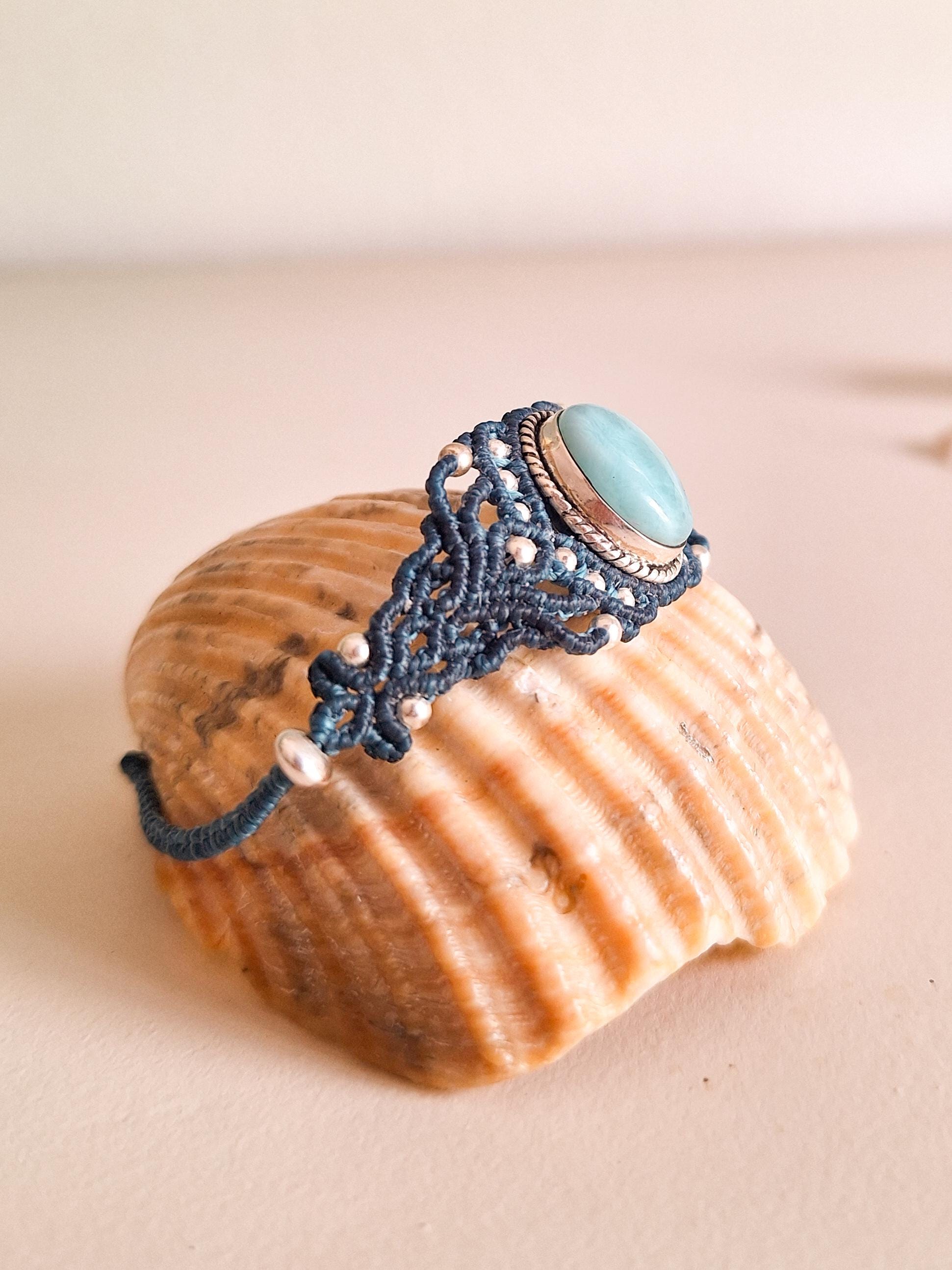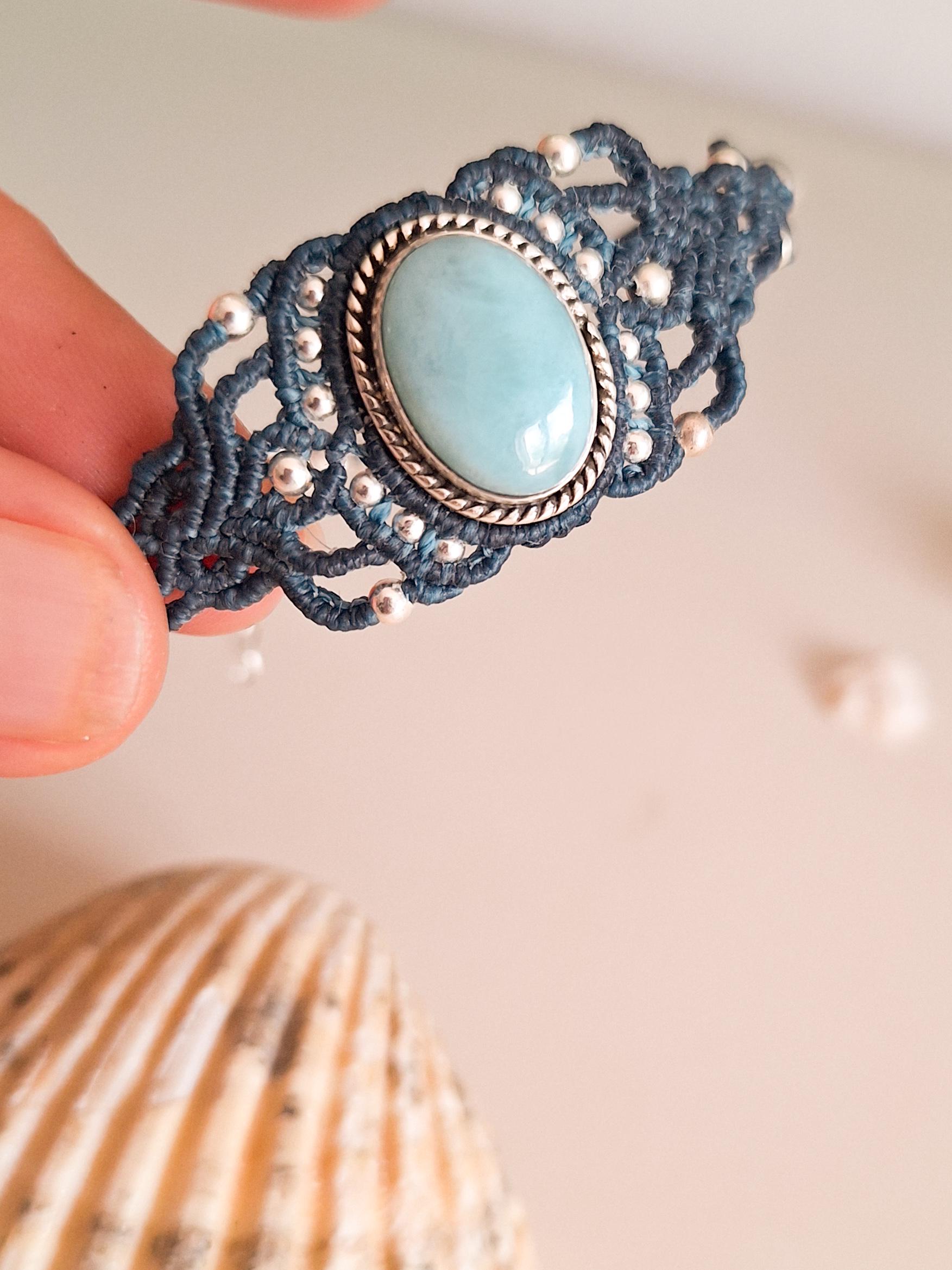 Bracelet with natural Larimar from the Isla Collection. This piece of jewelry is handmade using the macramé technique that adds shape and color, creating a unique design. The design is crafted with an oval-shaped Larimar stone set in silver, petrol-blue waxed thread, and sterling silver beads. KALA jewelry is consciously created with attention to detail.