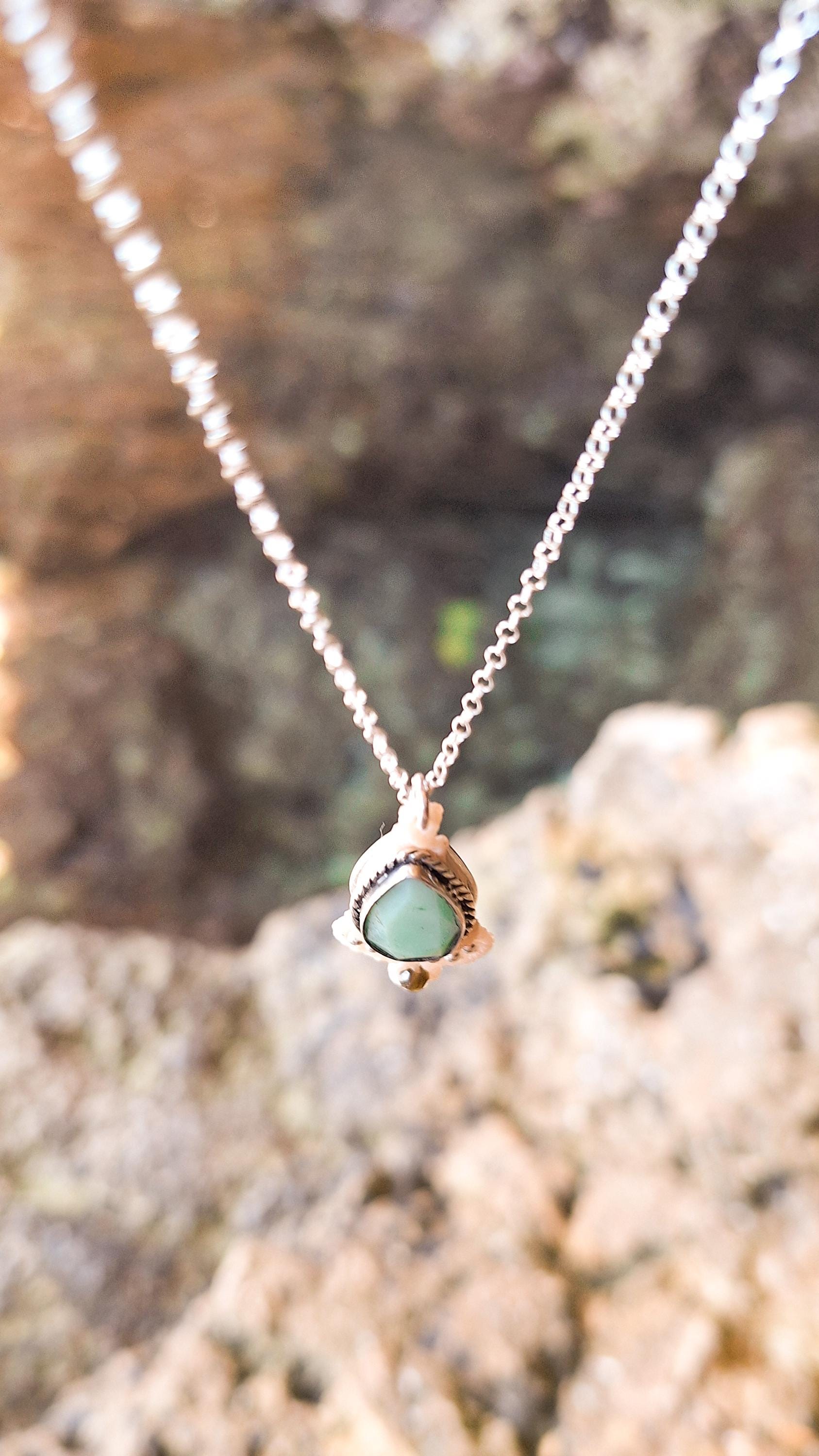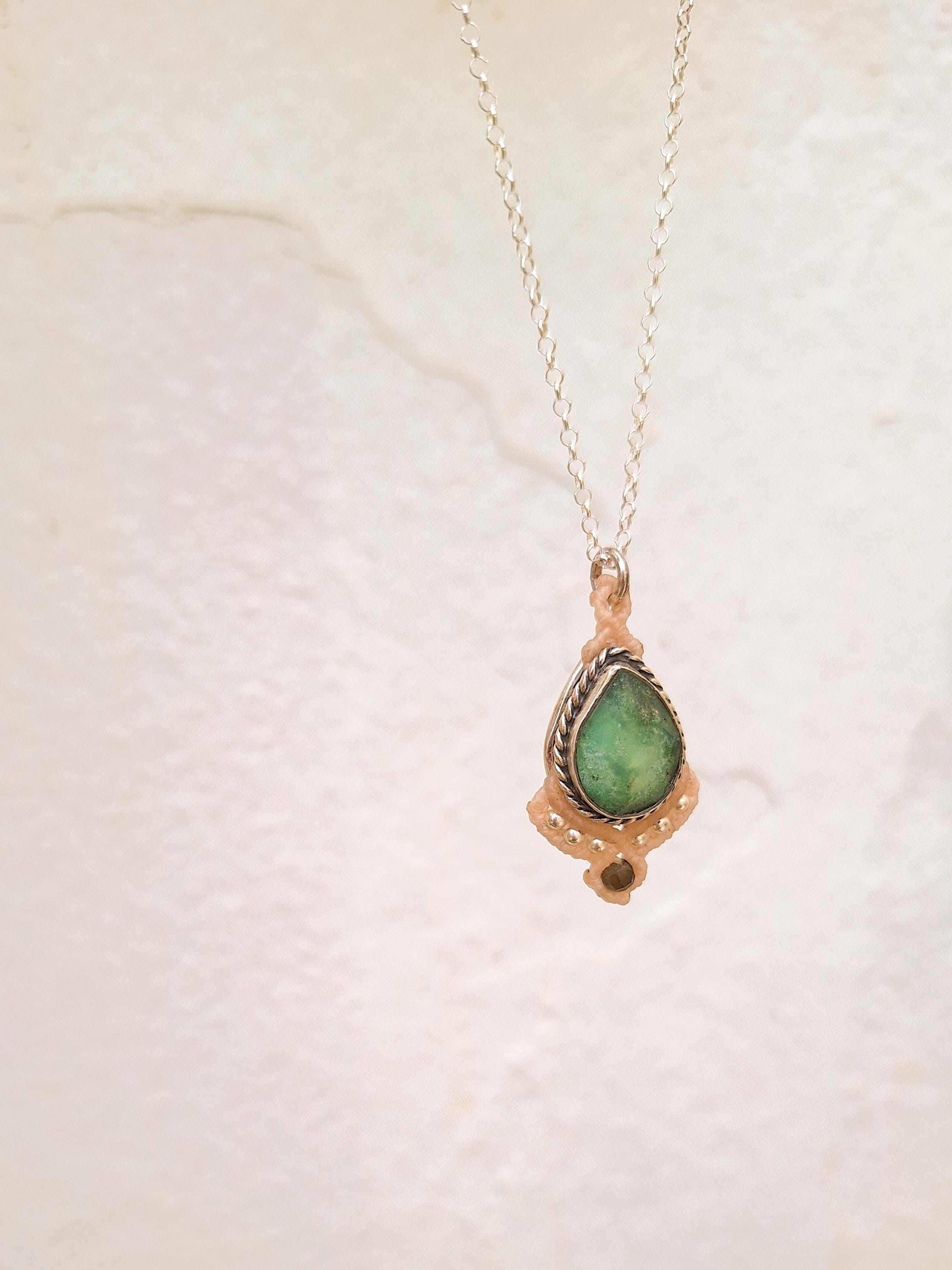 Macramé pendant from the Amanecer Collection with an Amazonite stone set in 925 silver. This piece of jewelry is handmade with beige waxed thread, silver beads, and golden obsidian. The turquoise-green Amazonite stone is faceted to enhance its brilliance. The chain is thin and features round links. This necklace is ideal for everyday wear or for a special occasion.