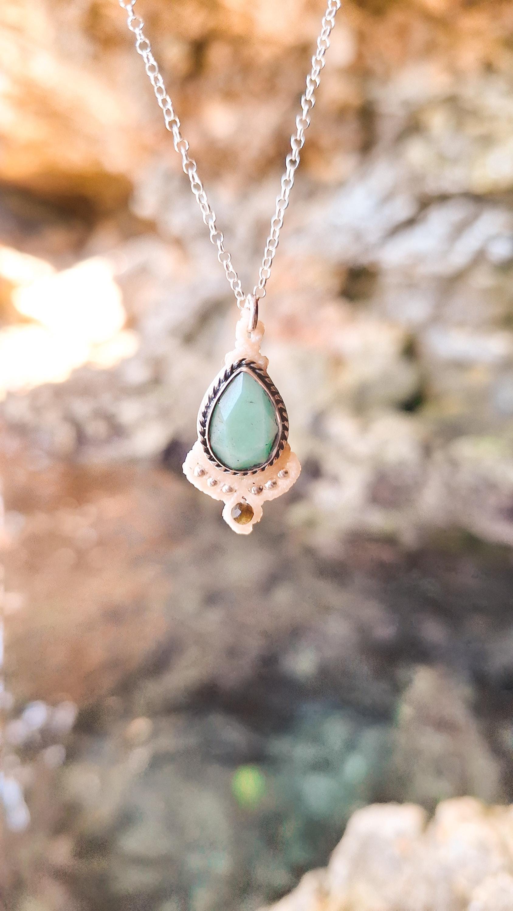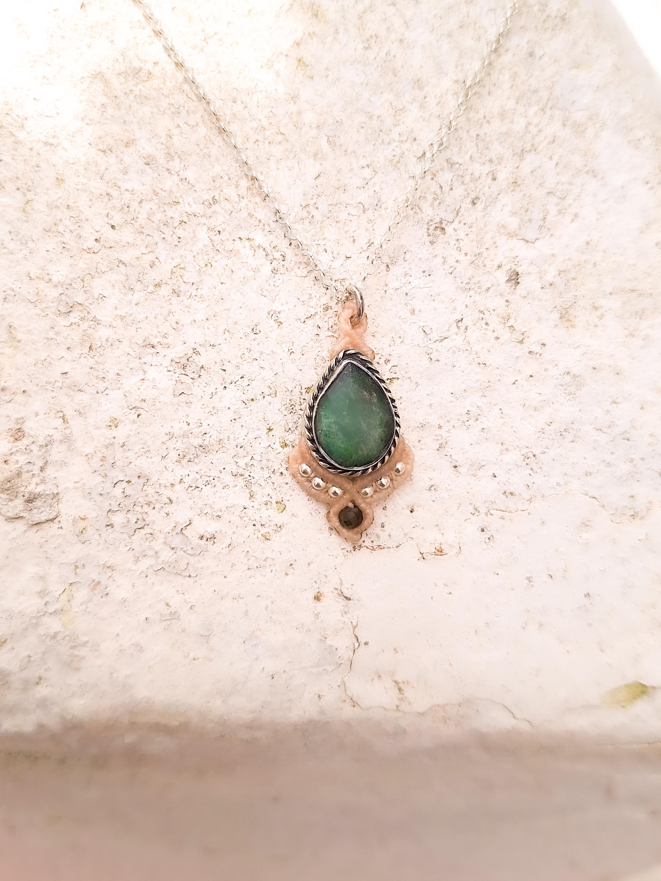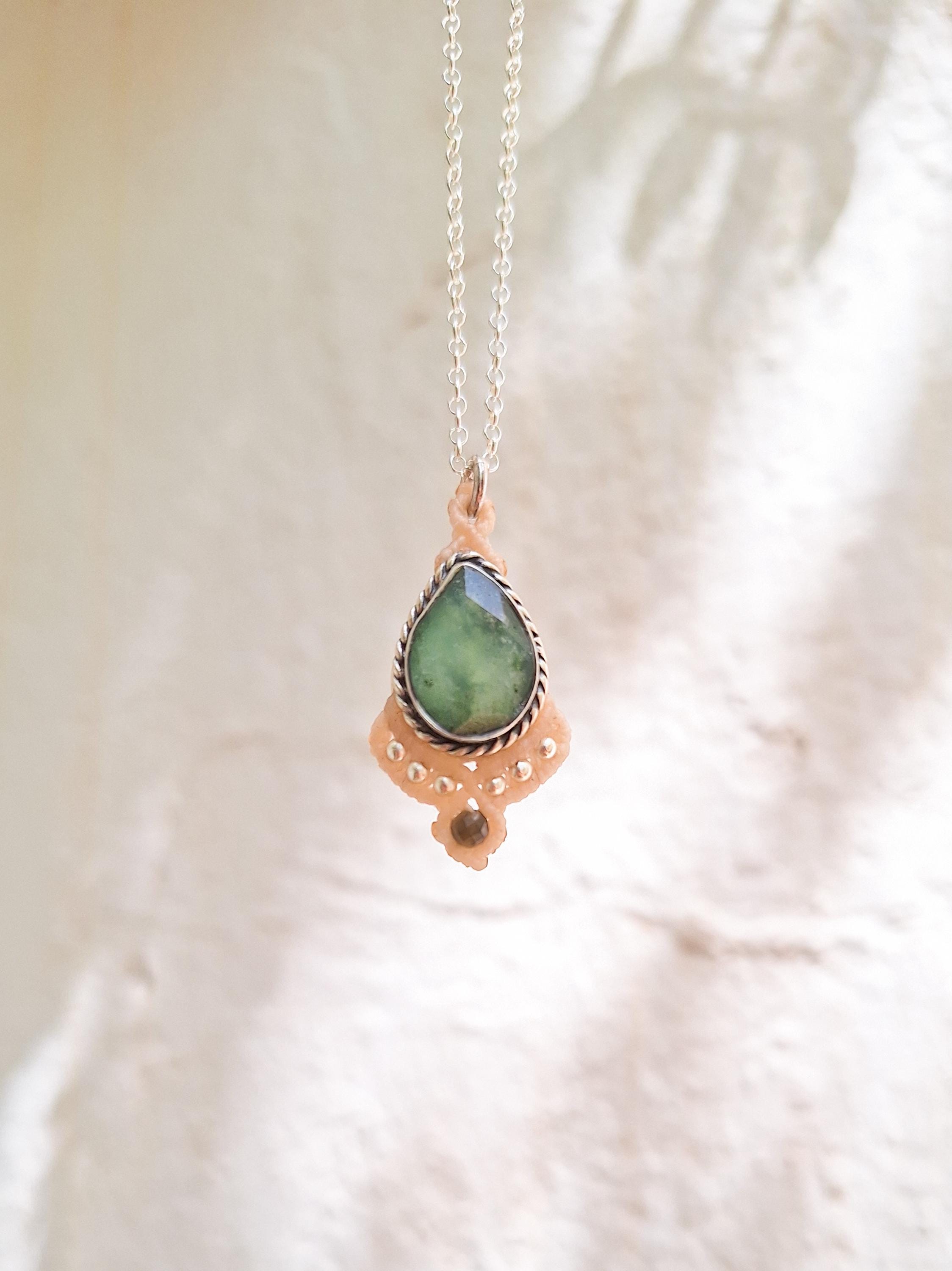 This pendant from the Dawn Collection is also available in different types of stones and fabric in other colors. If you'd like to see them, you can find them in the NECKLACES section.