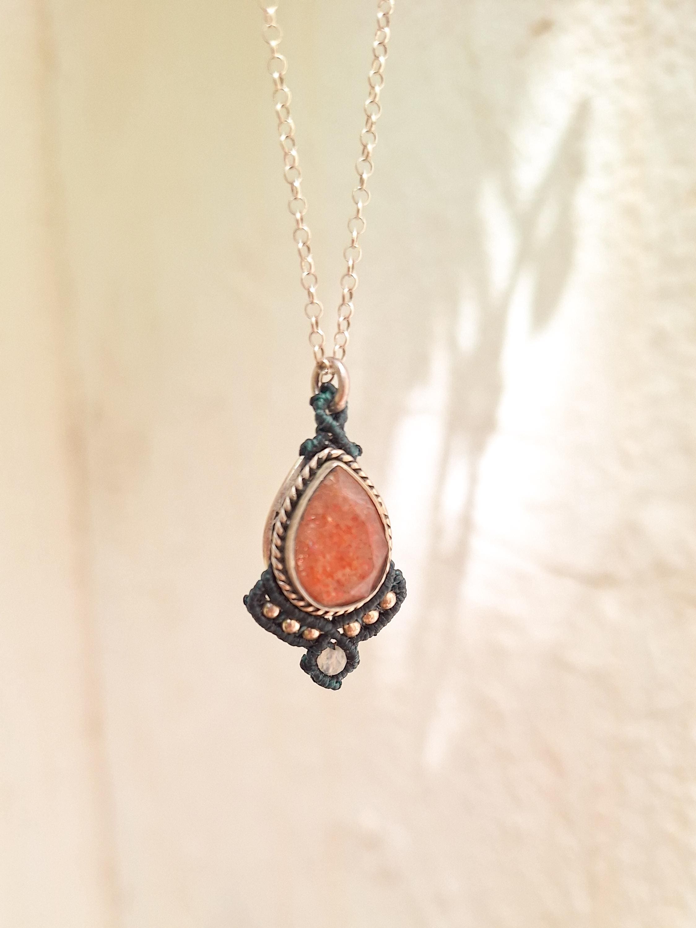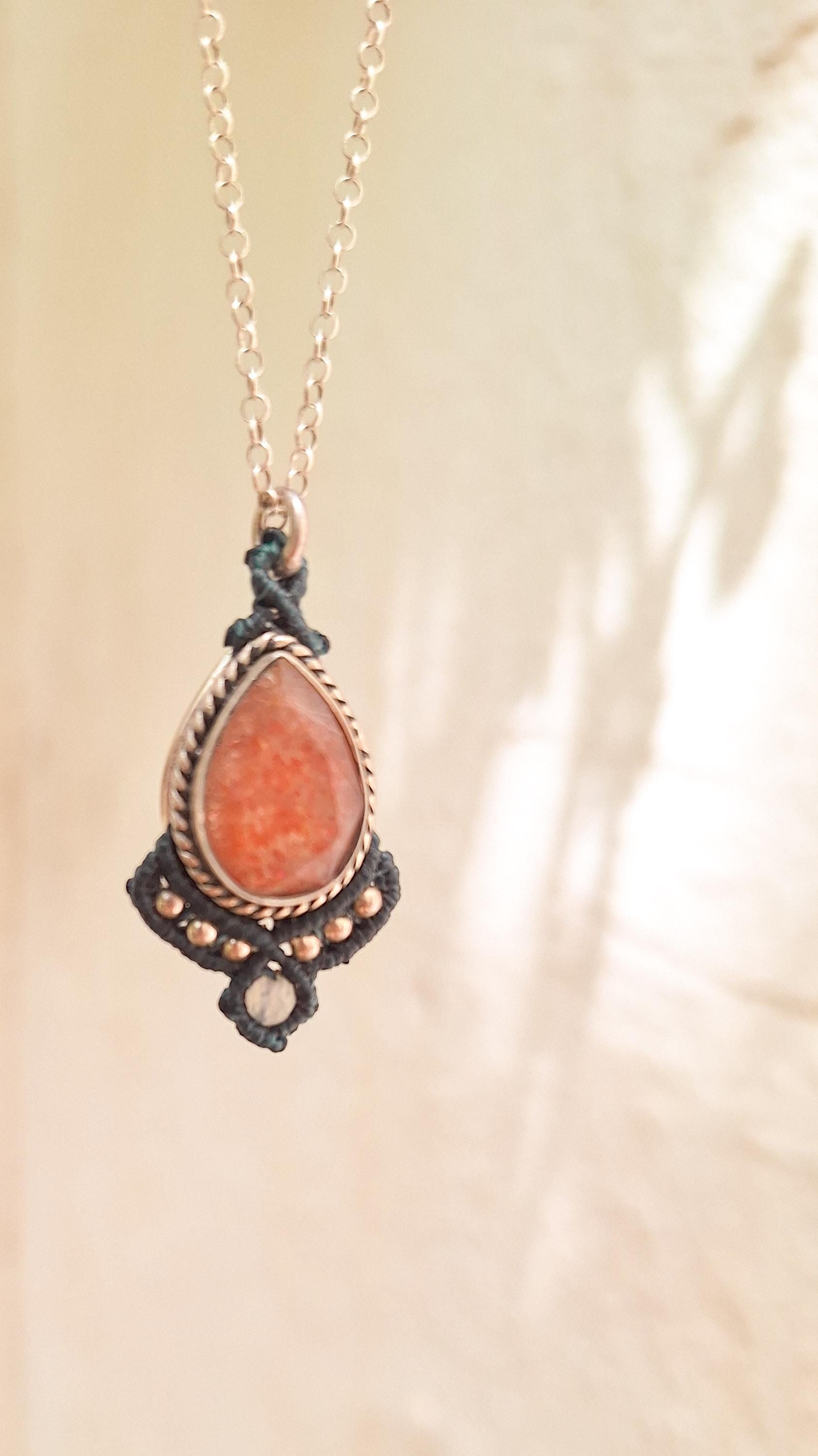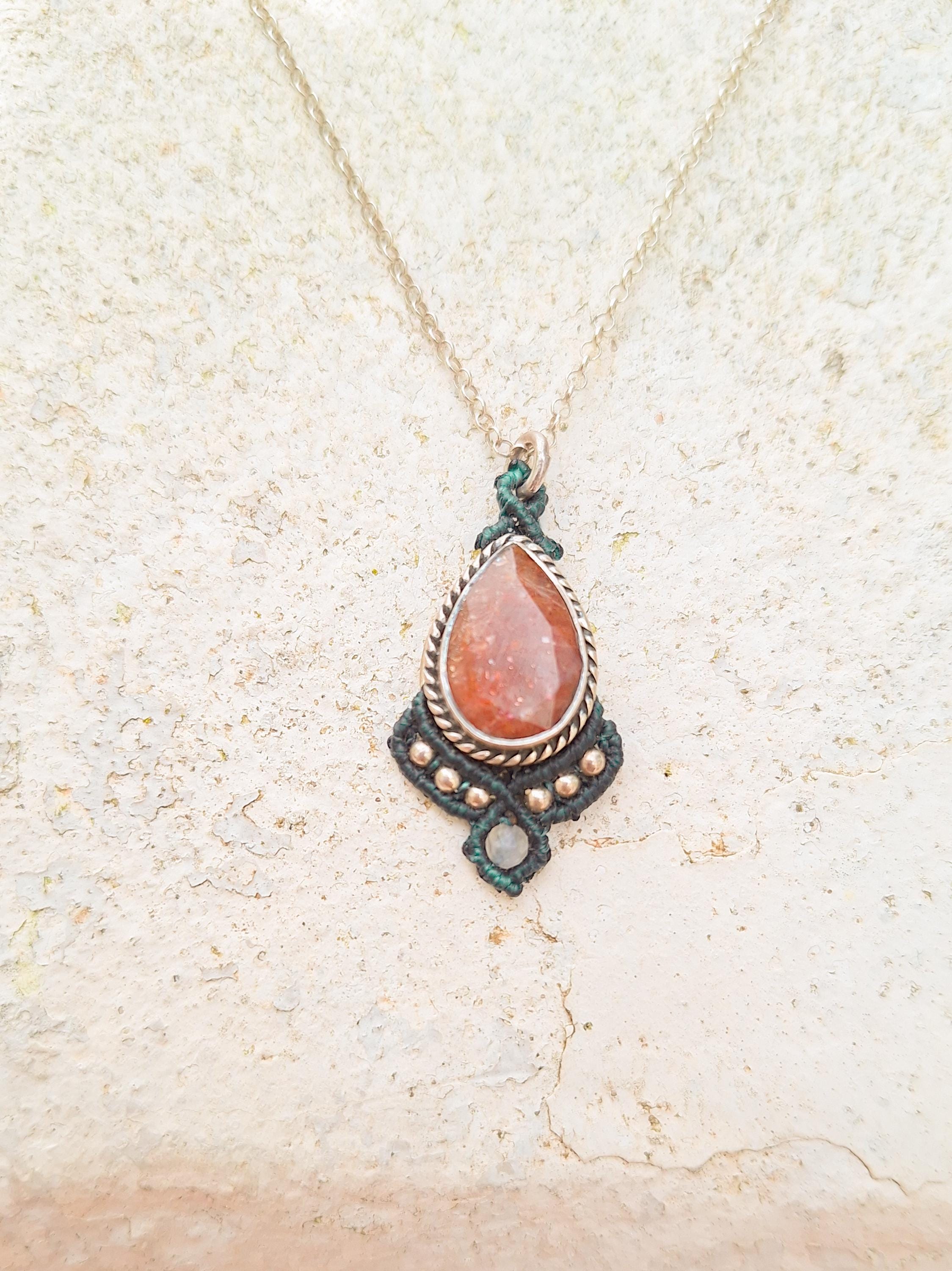 Macramé pendant from the Amanecer Collection, handcrafted with dark green waxed thread. Its centerpiece is a faceted Sunstone, a vibrant orange hue, set in 925 silver to highlight its natural shine. It is accompanied by details of silver beads and Moonstone, which add light and balance to the design.