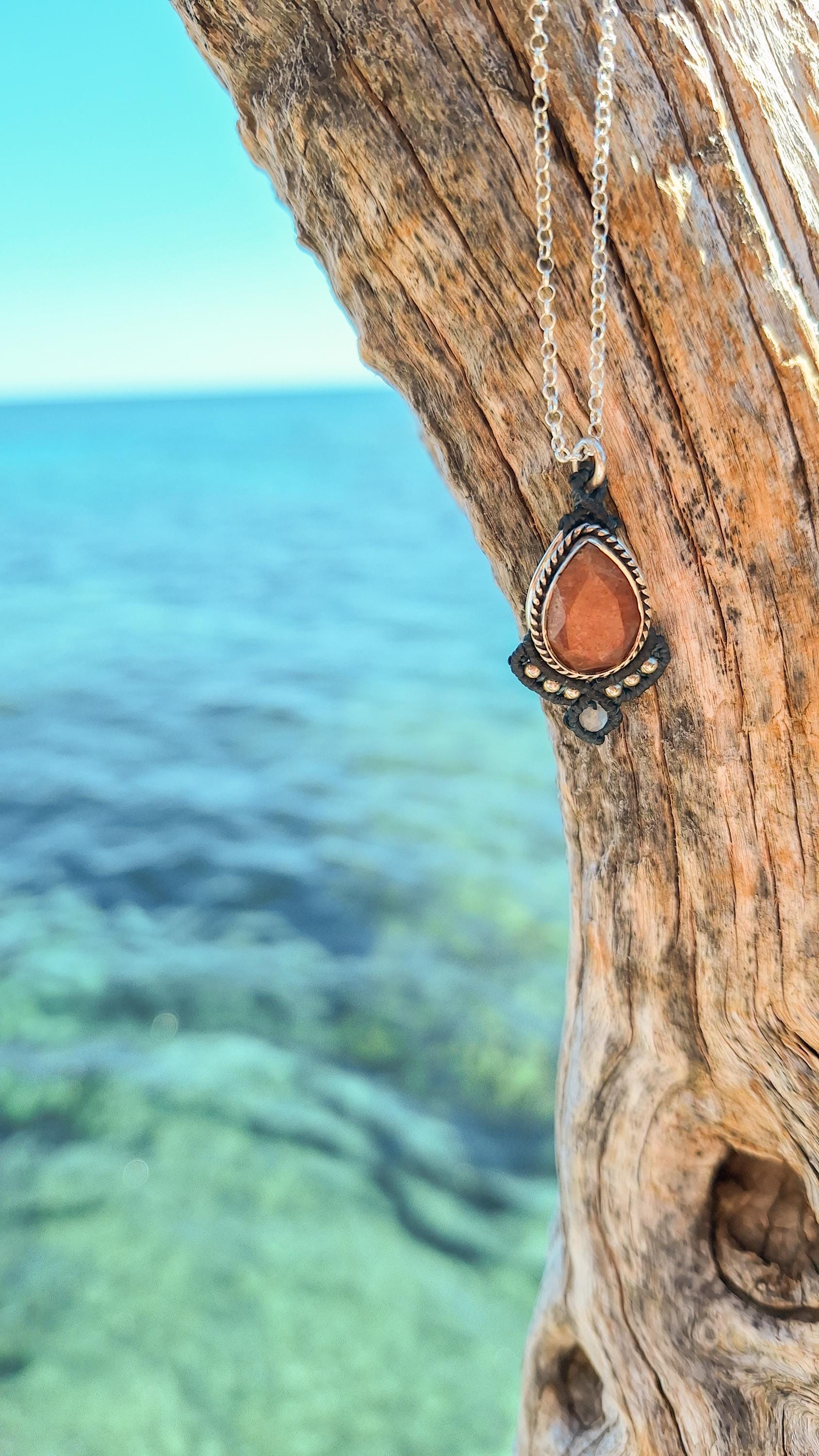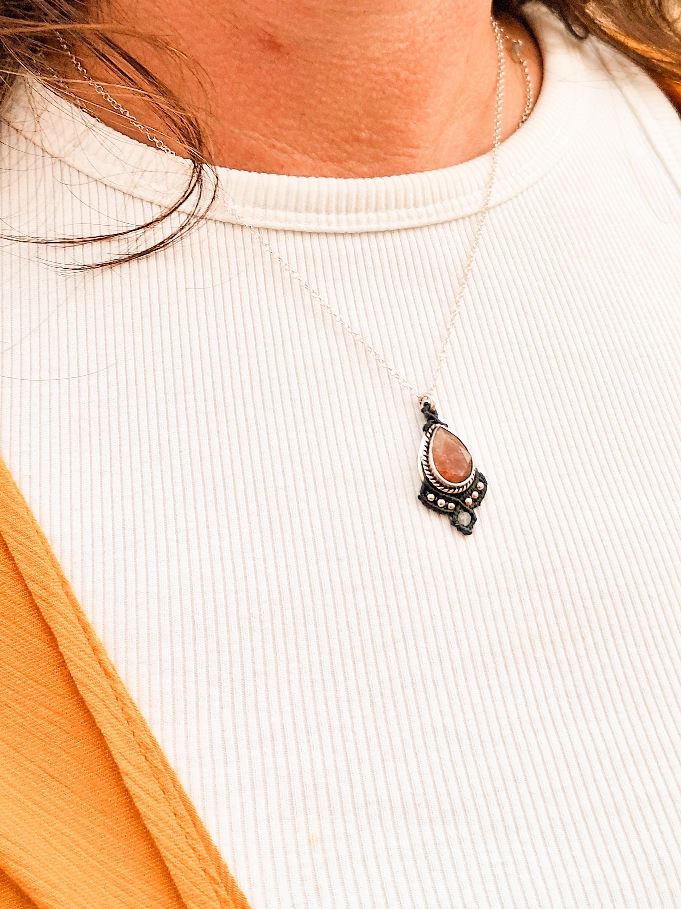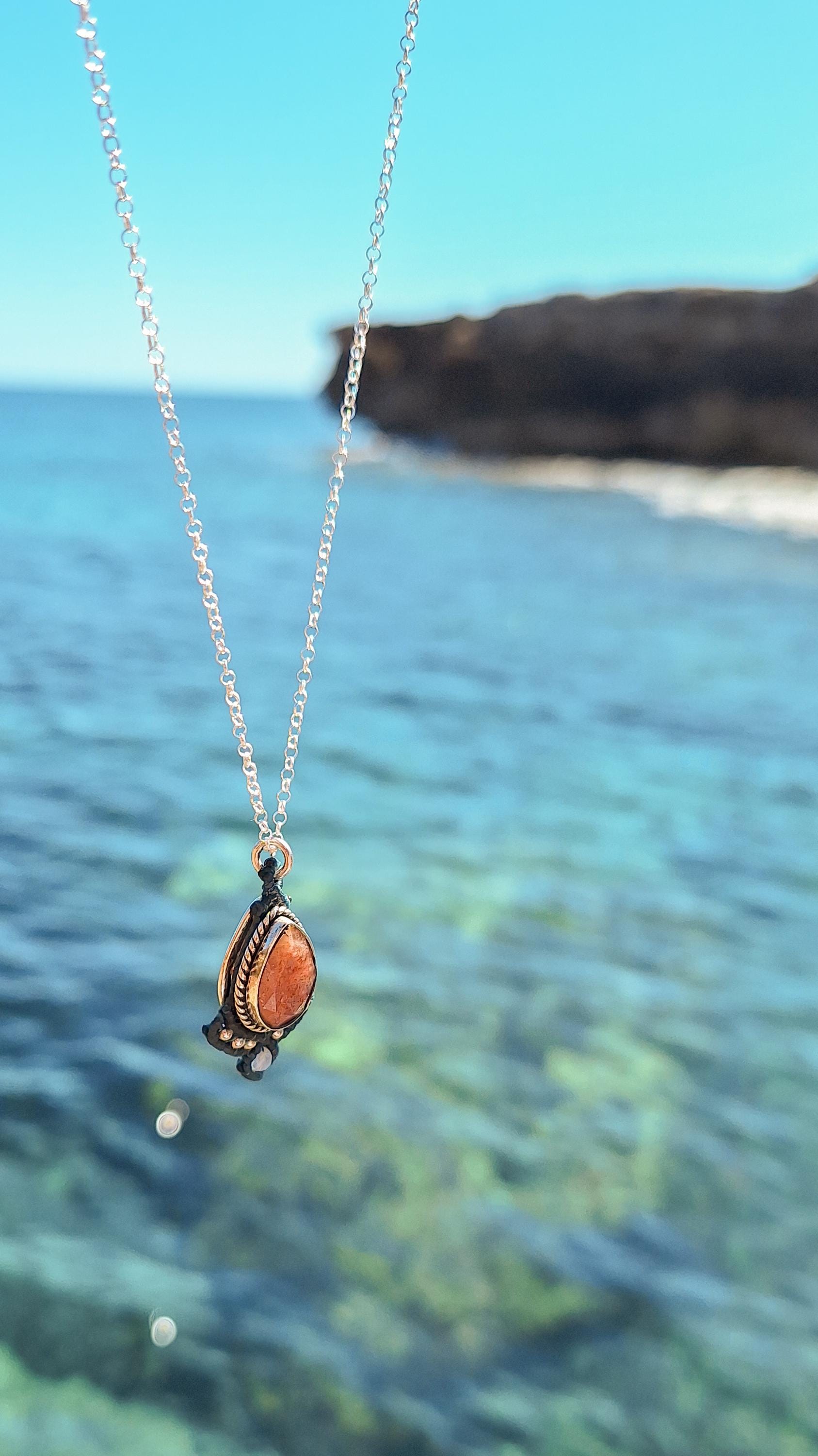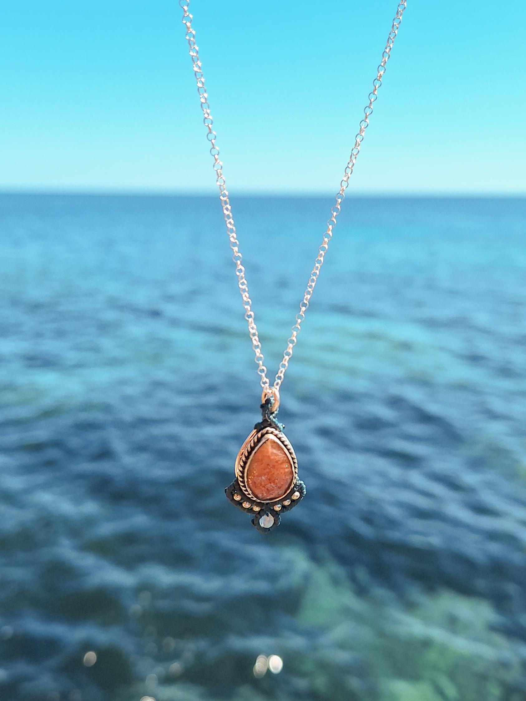 Macramé pendant from the Amanecer Collection, handcrafted with dark green waxed thread. Its centerpiece is a faceted Sunstone, a vibrant orange hue, set in 925 silver to highlight its natural shine. It is accompanied by details of silver beads and Moonstone, which add light and balance to the design.
