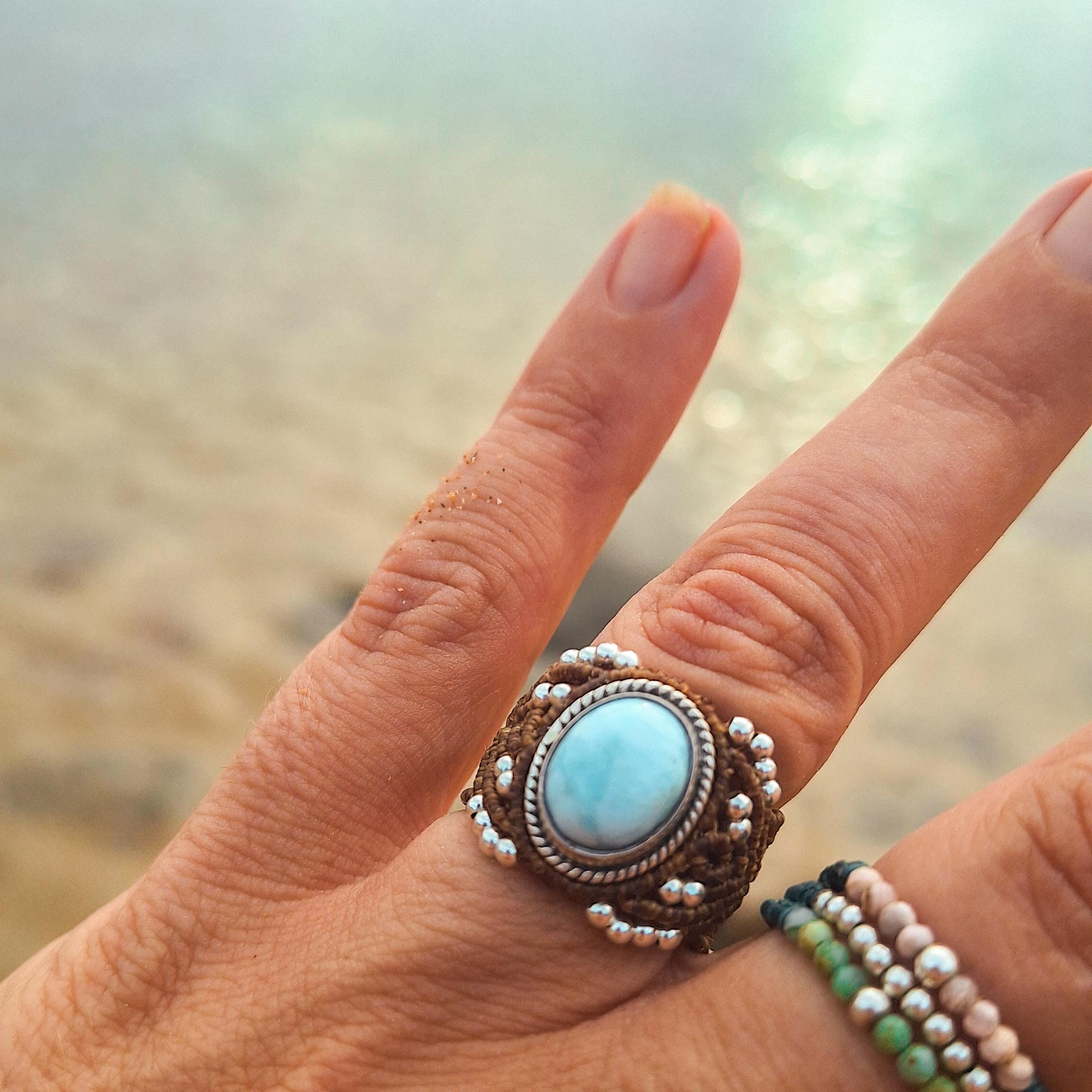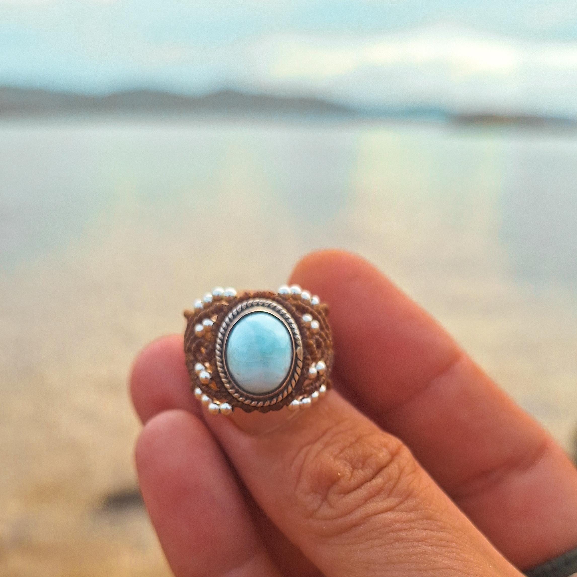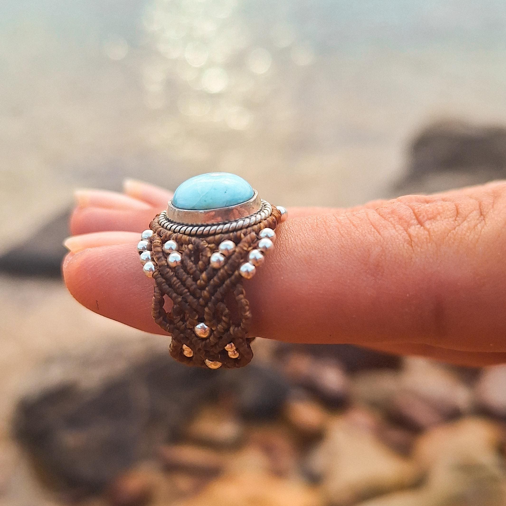 Handmade ring with a delicate macramé design, created with a spectacular Larimar stone set in sterling silver, turquoise waxed thread, and silver beads.
