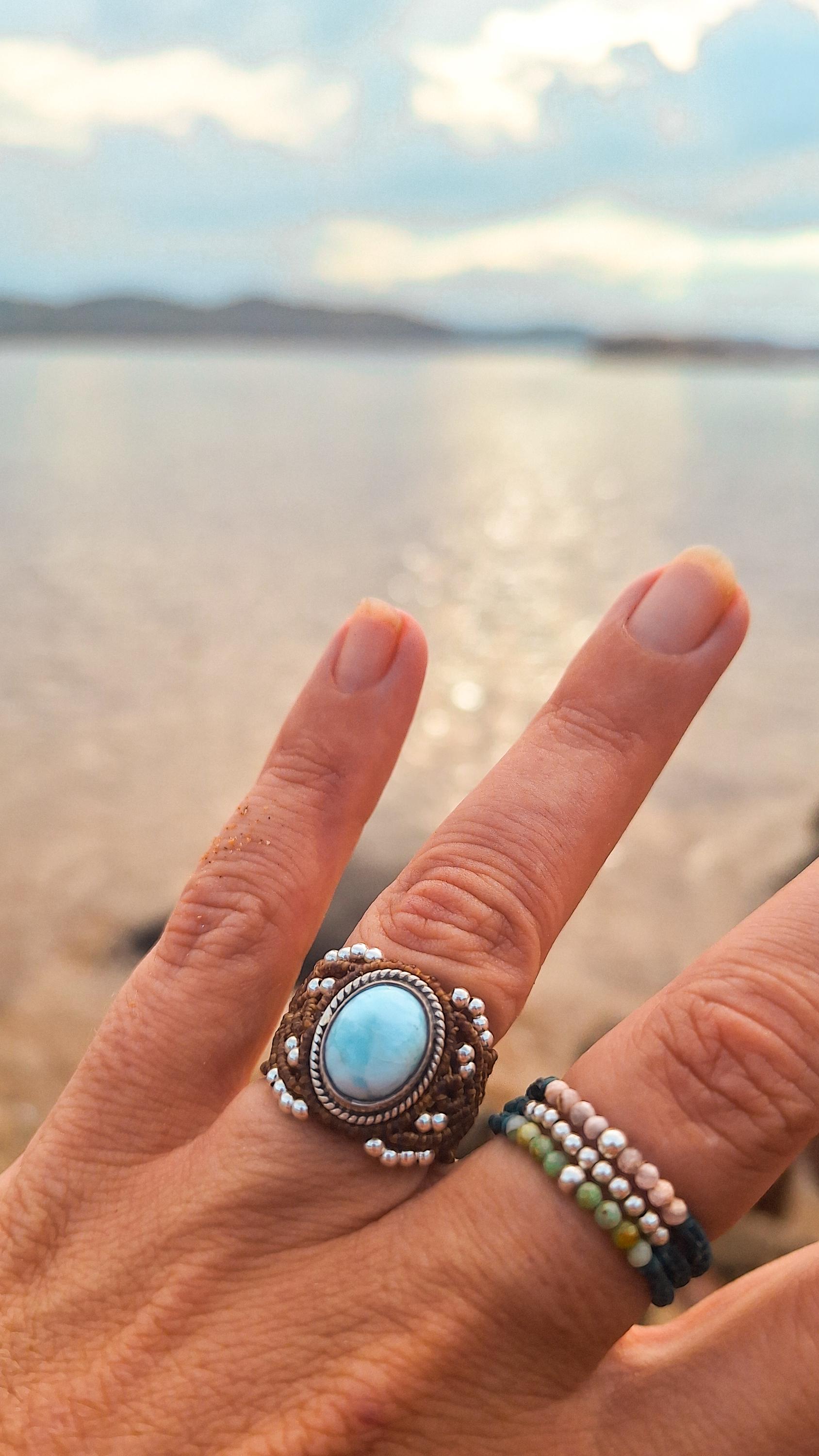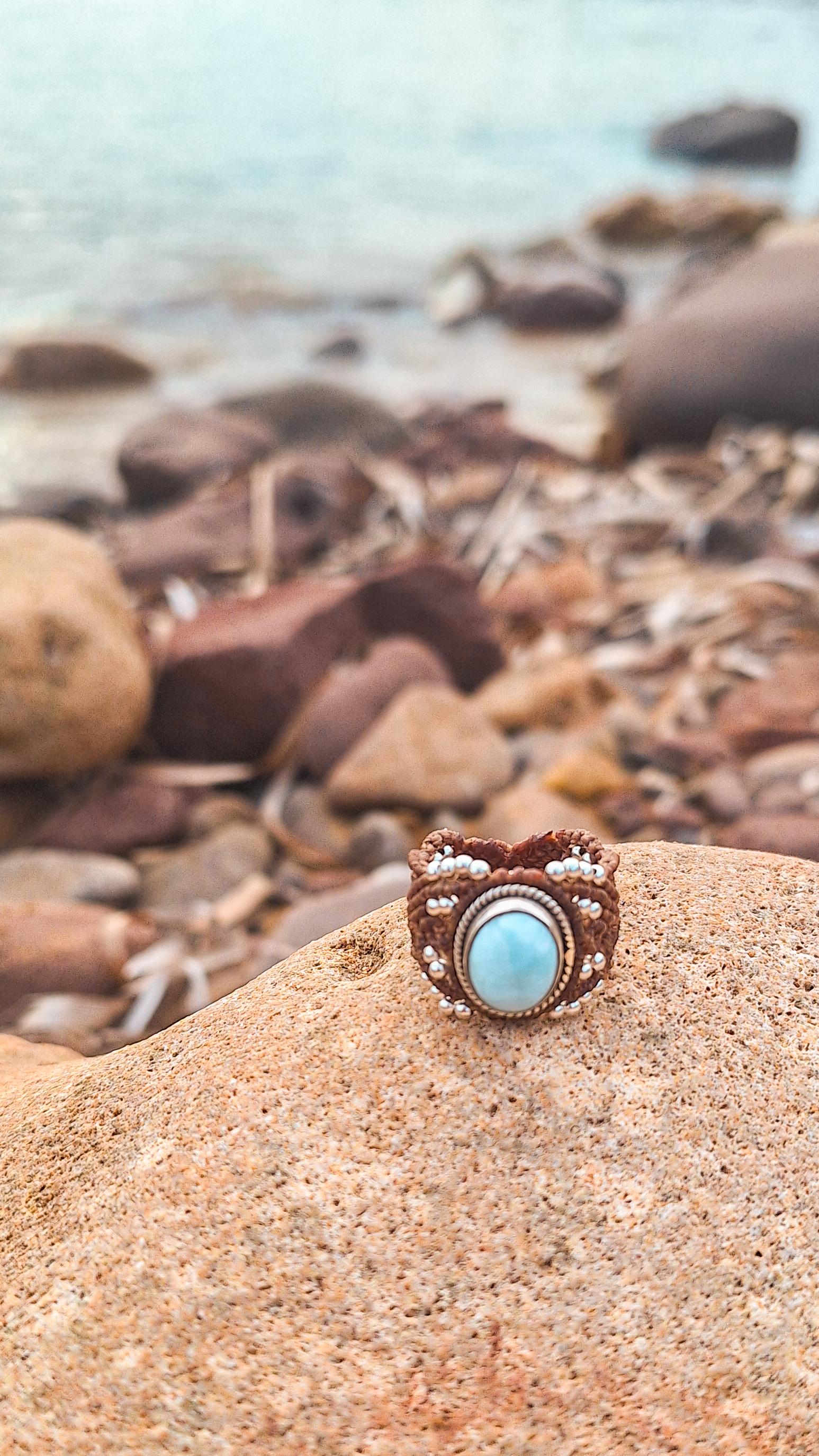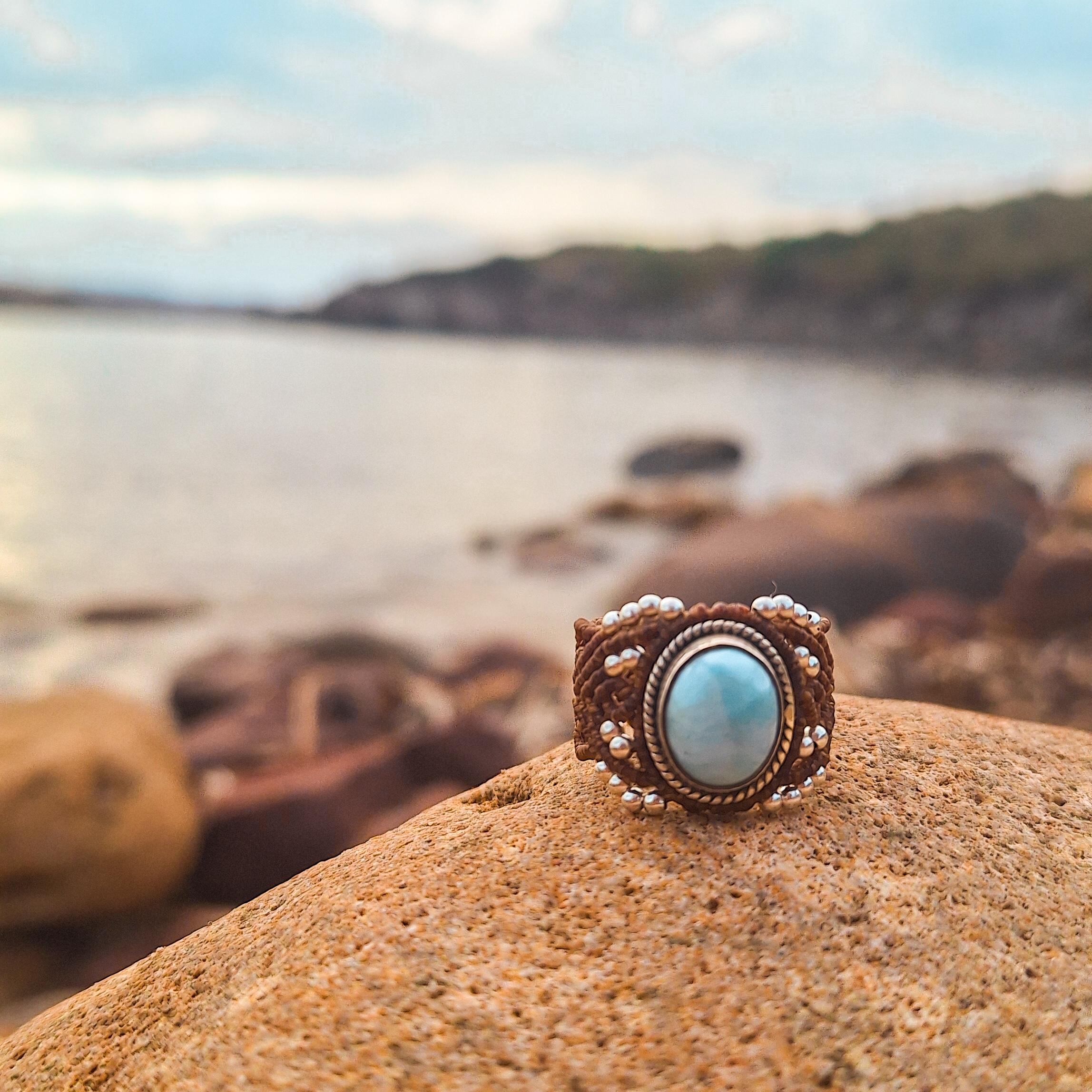 Handmade ring with a delicate macramé design, created with a spectacular Larimar stone set in sterling silver, turquoise waxed thread, and silver beads.