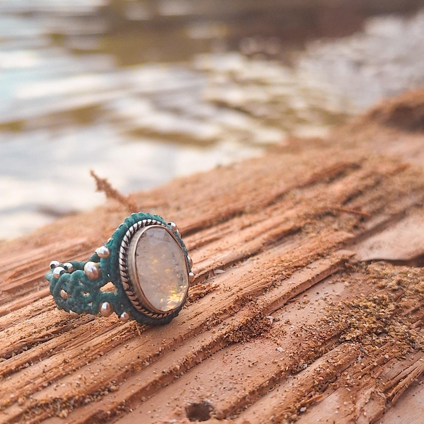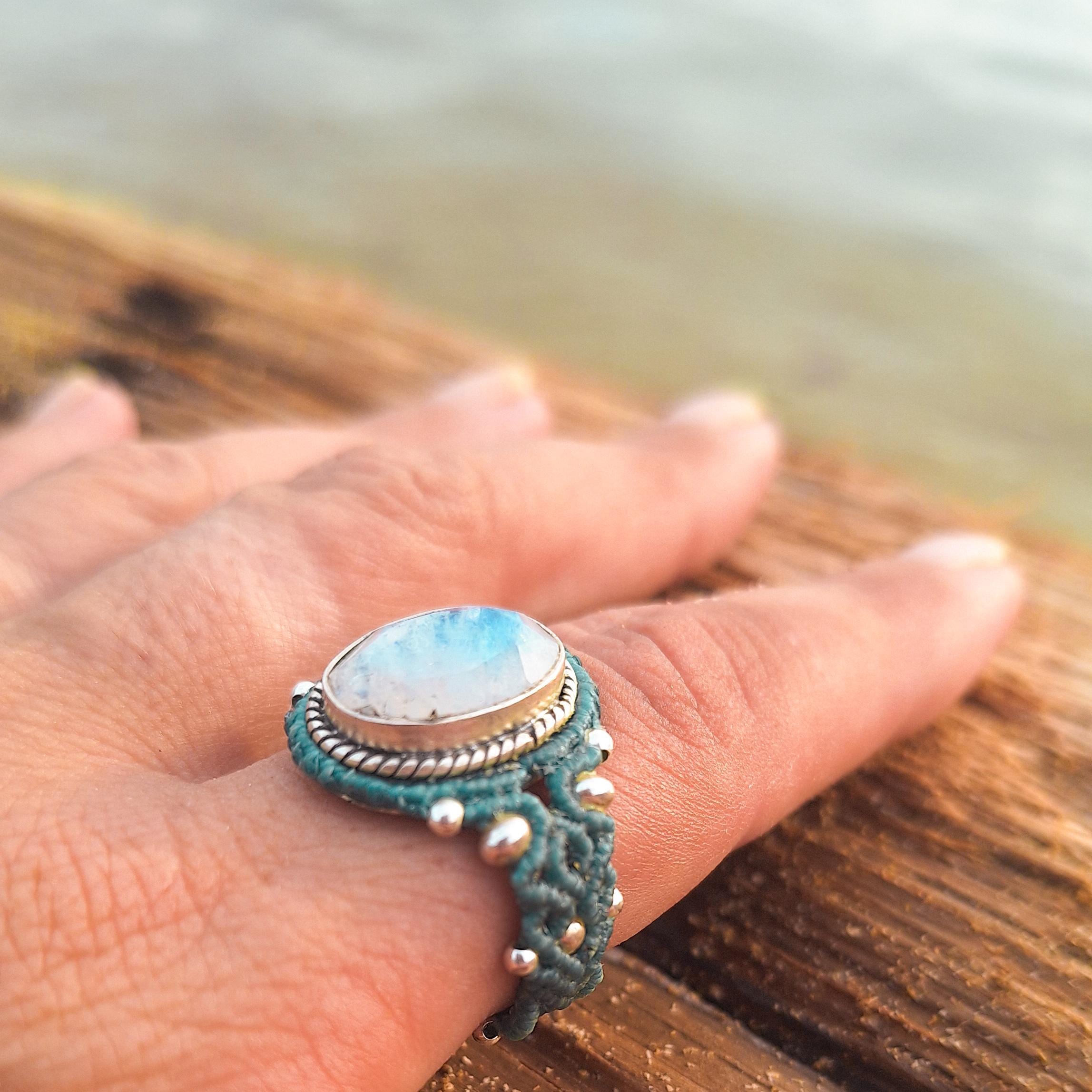 Handmade ring with a delicate macramé design, created with a spectacular faceted Moonstone set in sterling silver, turquoise waxed thread, and silver beads.