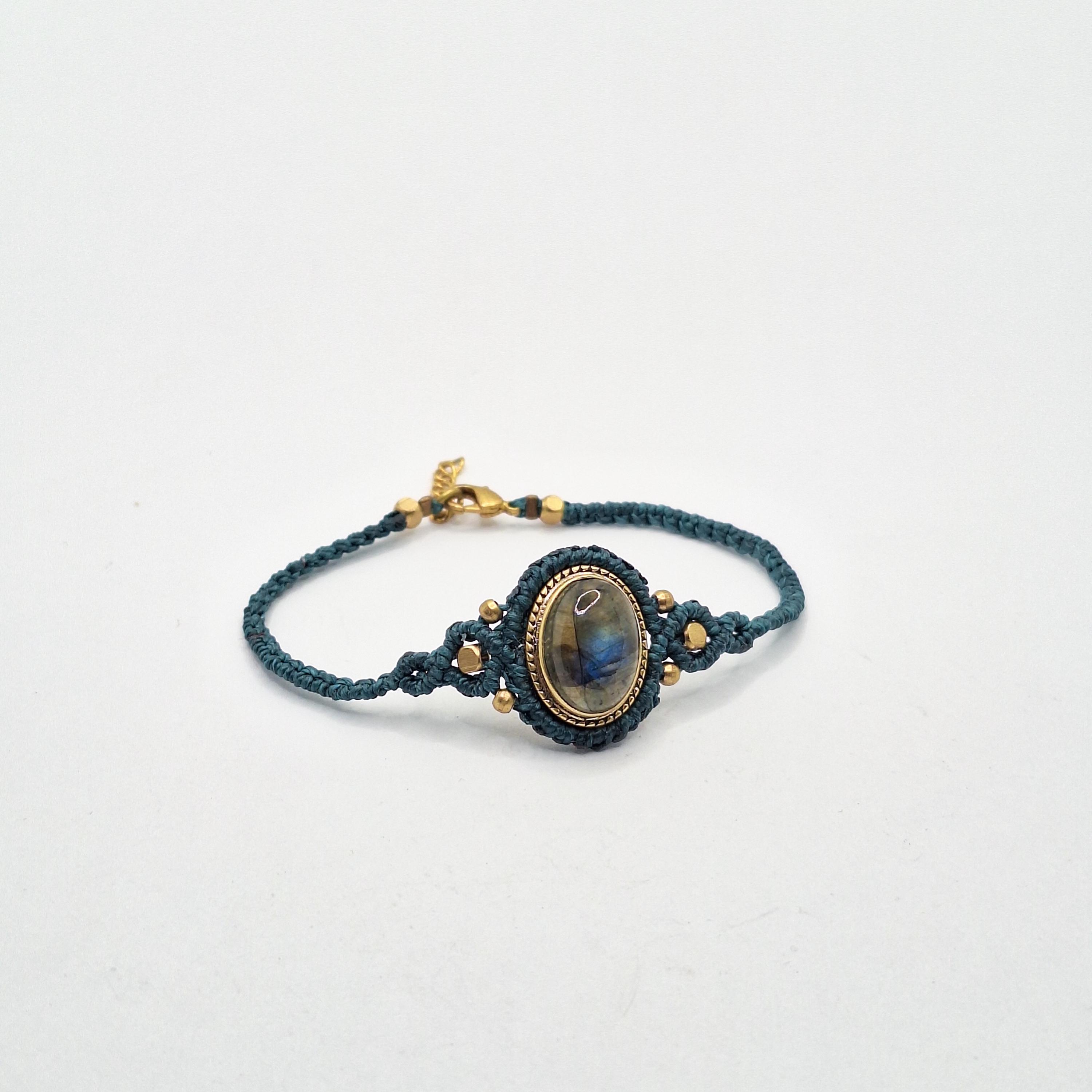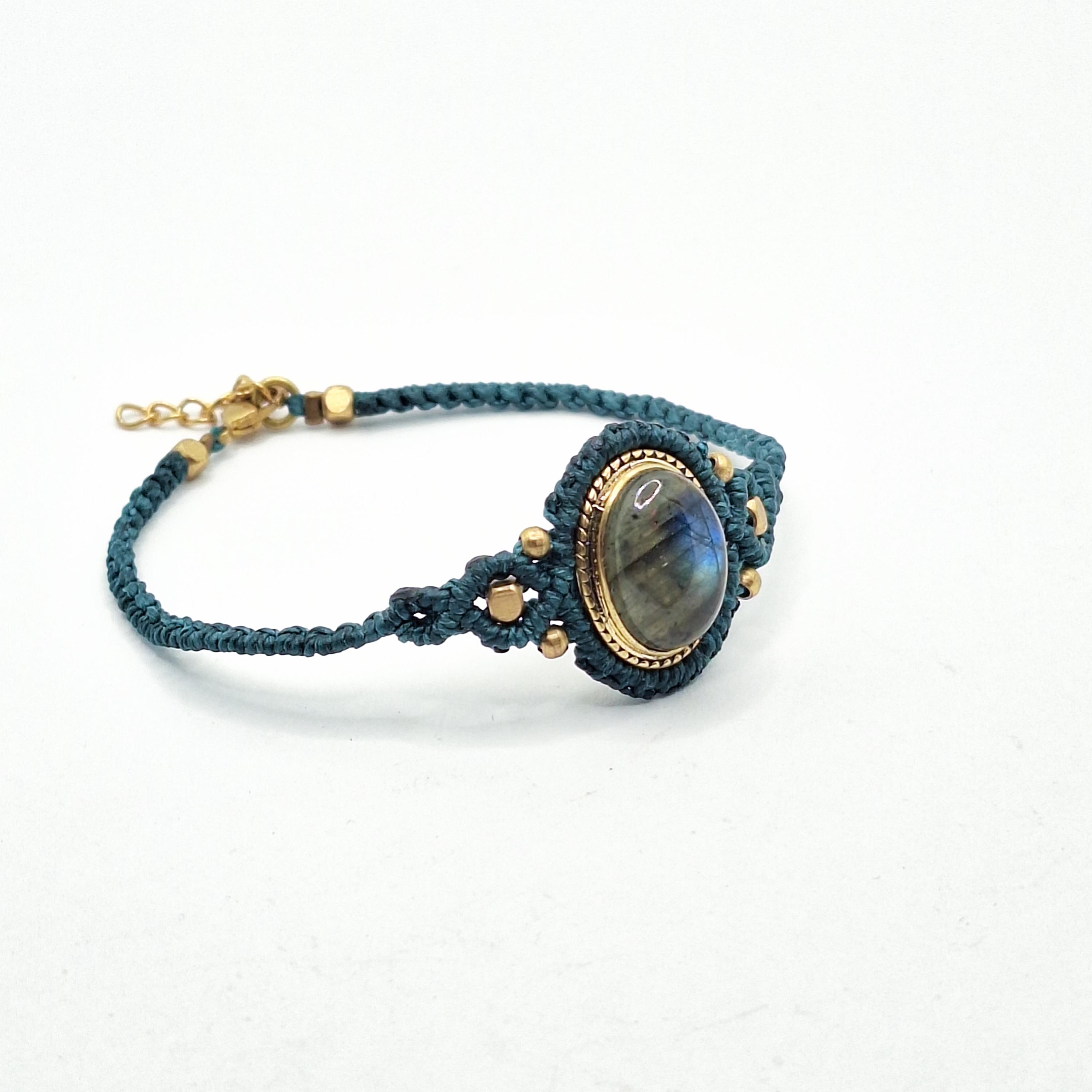 Handwoven macrame bracelet made with cherry red or petrol green waxed thread, featuring an oval Labradorite stone as its centerpiece and gold-plated brass details. The design is built around the stone, with delicate geometric lines that seek harmony and beauty.